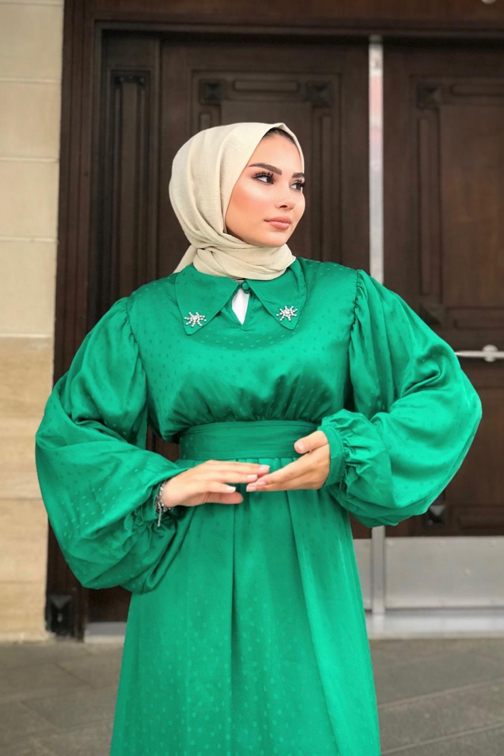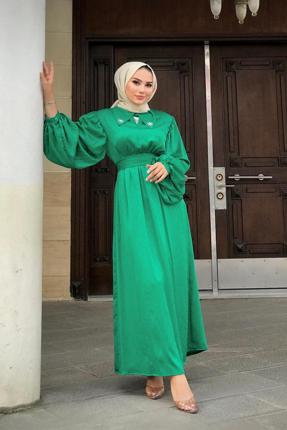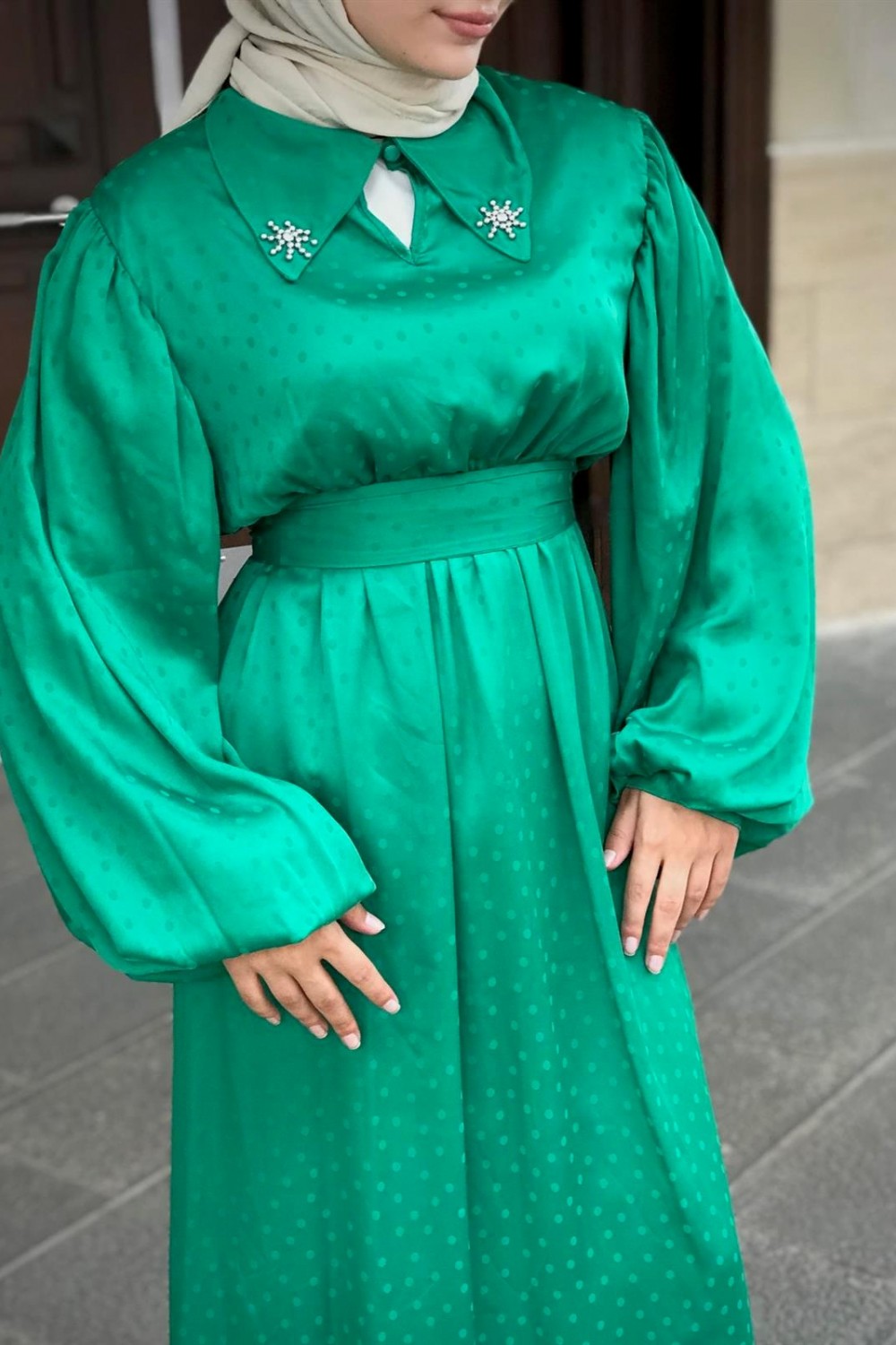 Lenta Puantiye Yakası Taşlı Elbise Yeşil