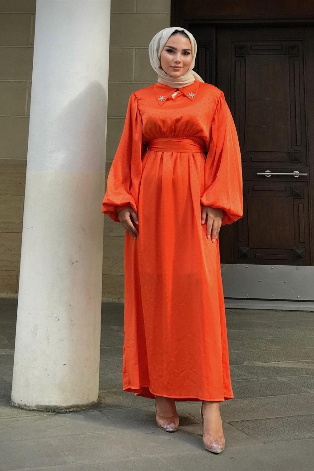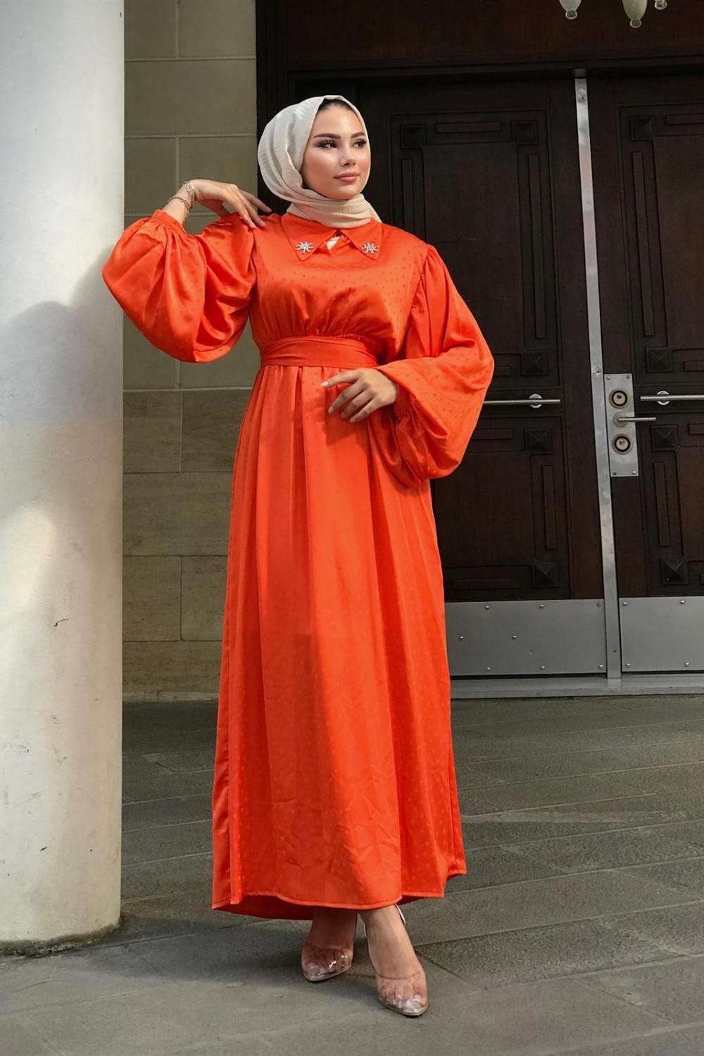 Lenta Puantiye Yakası Taşlı Elbise Turuncu