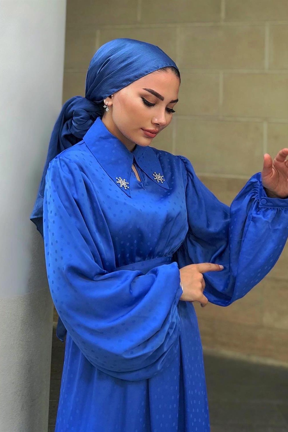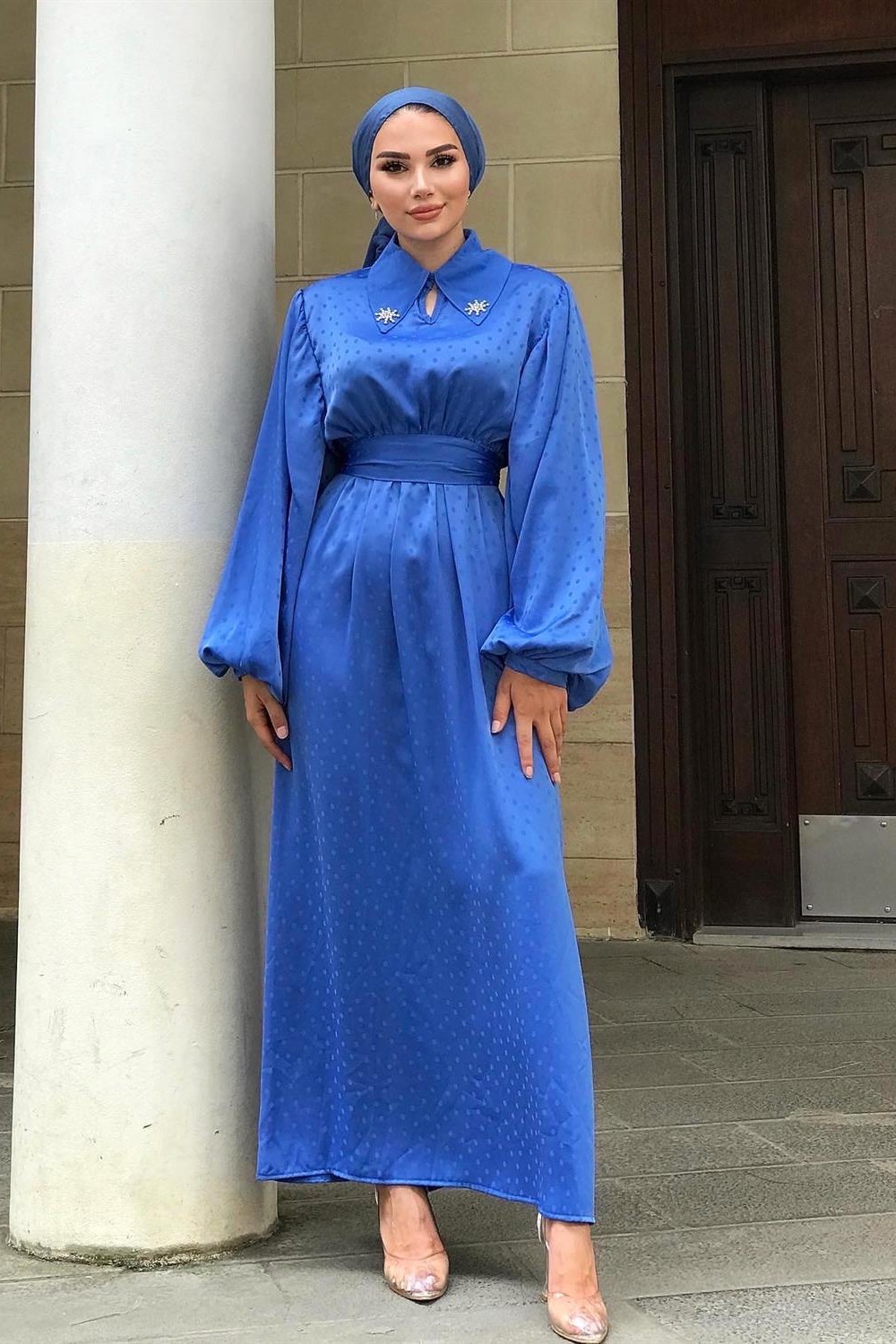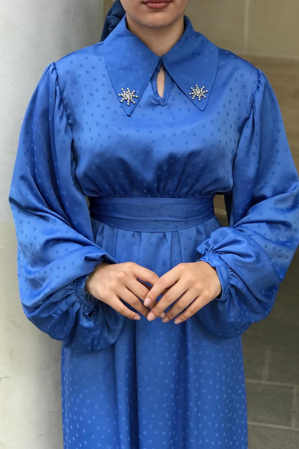 Lenta Puantiye Yakası Taşlı Elbise Mavi