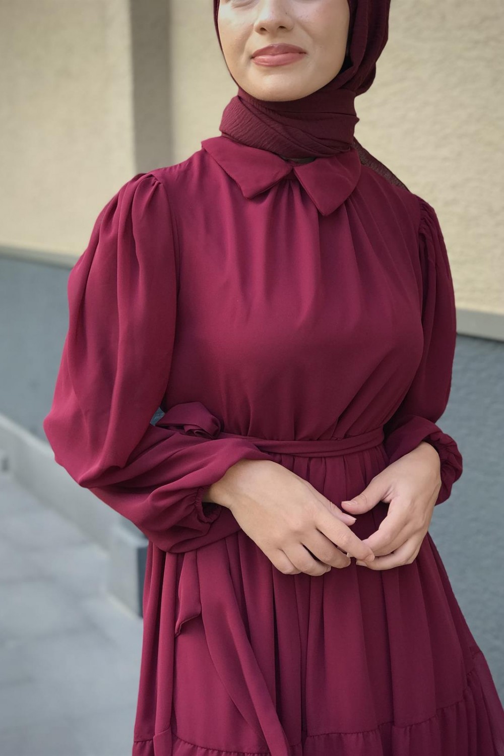 Gömlek Yaka Şifon Elbise Bordo