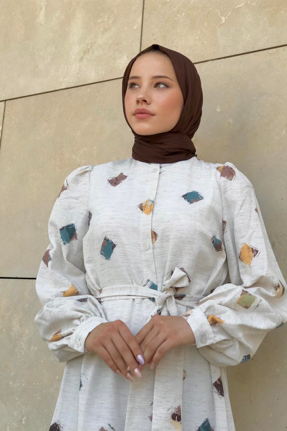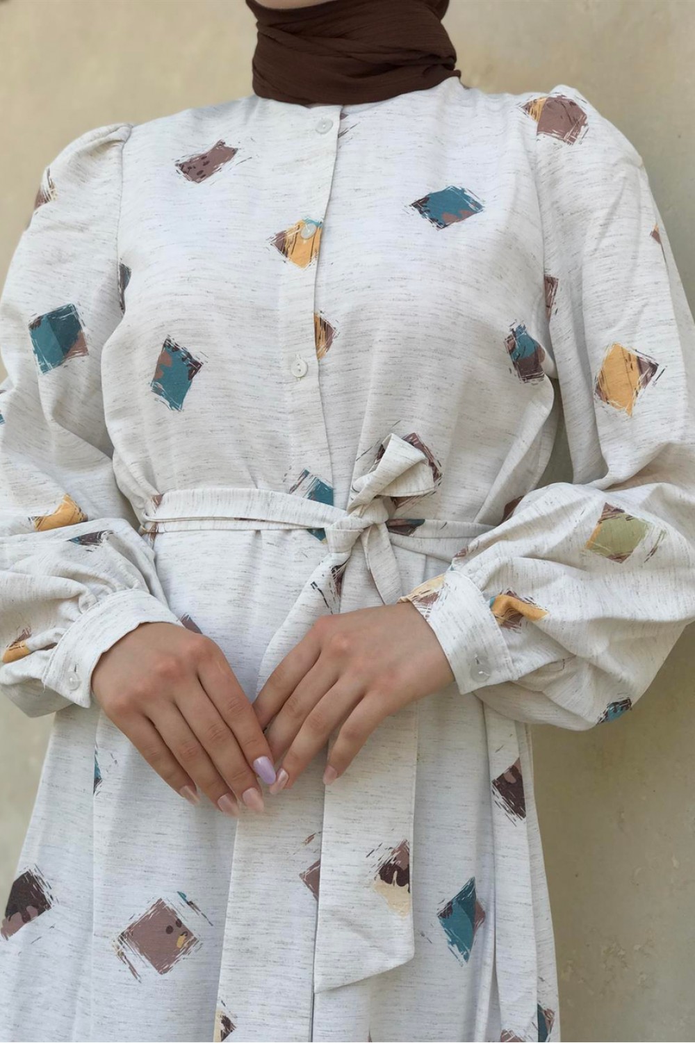 Desenli Keten Elbise Kahve
