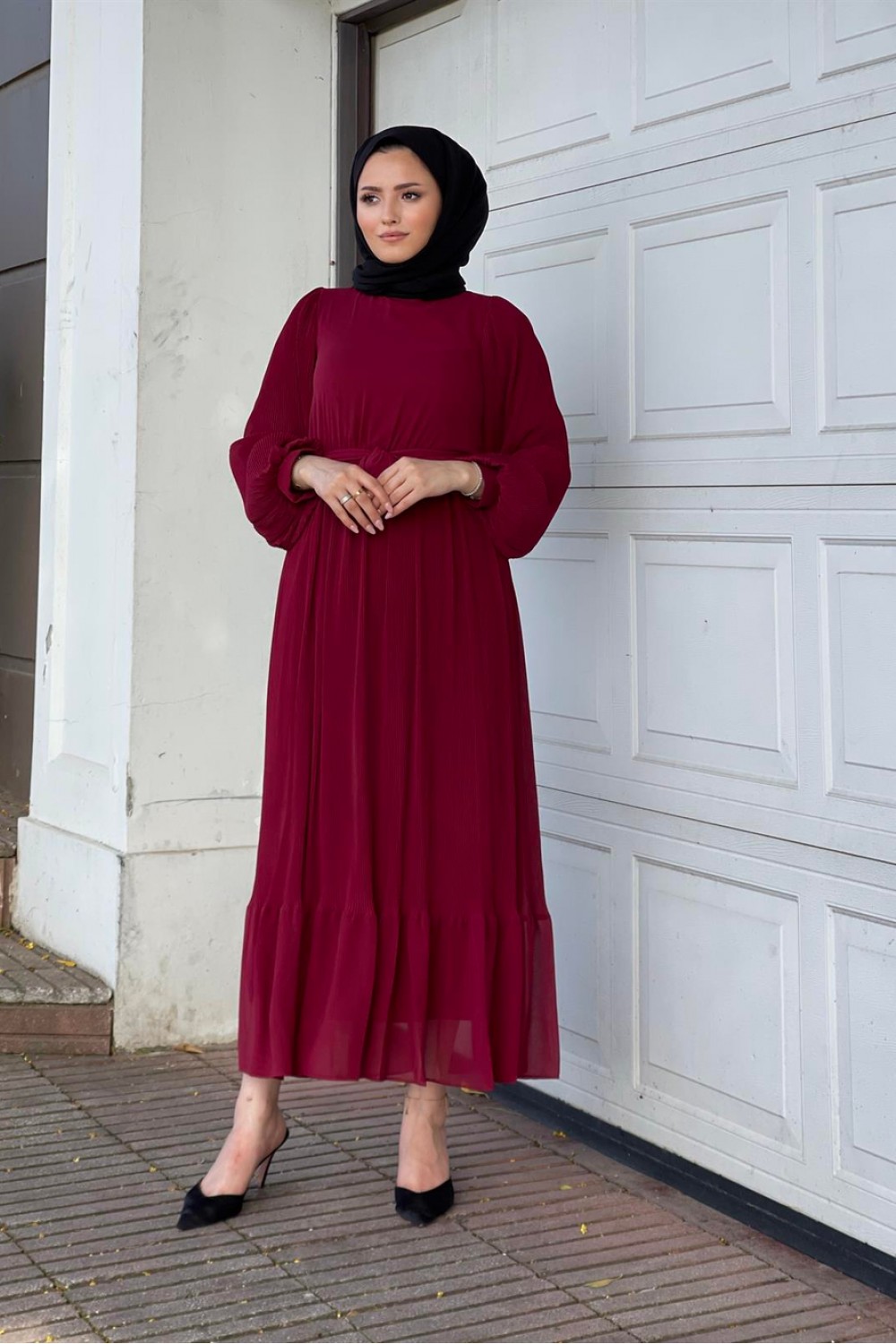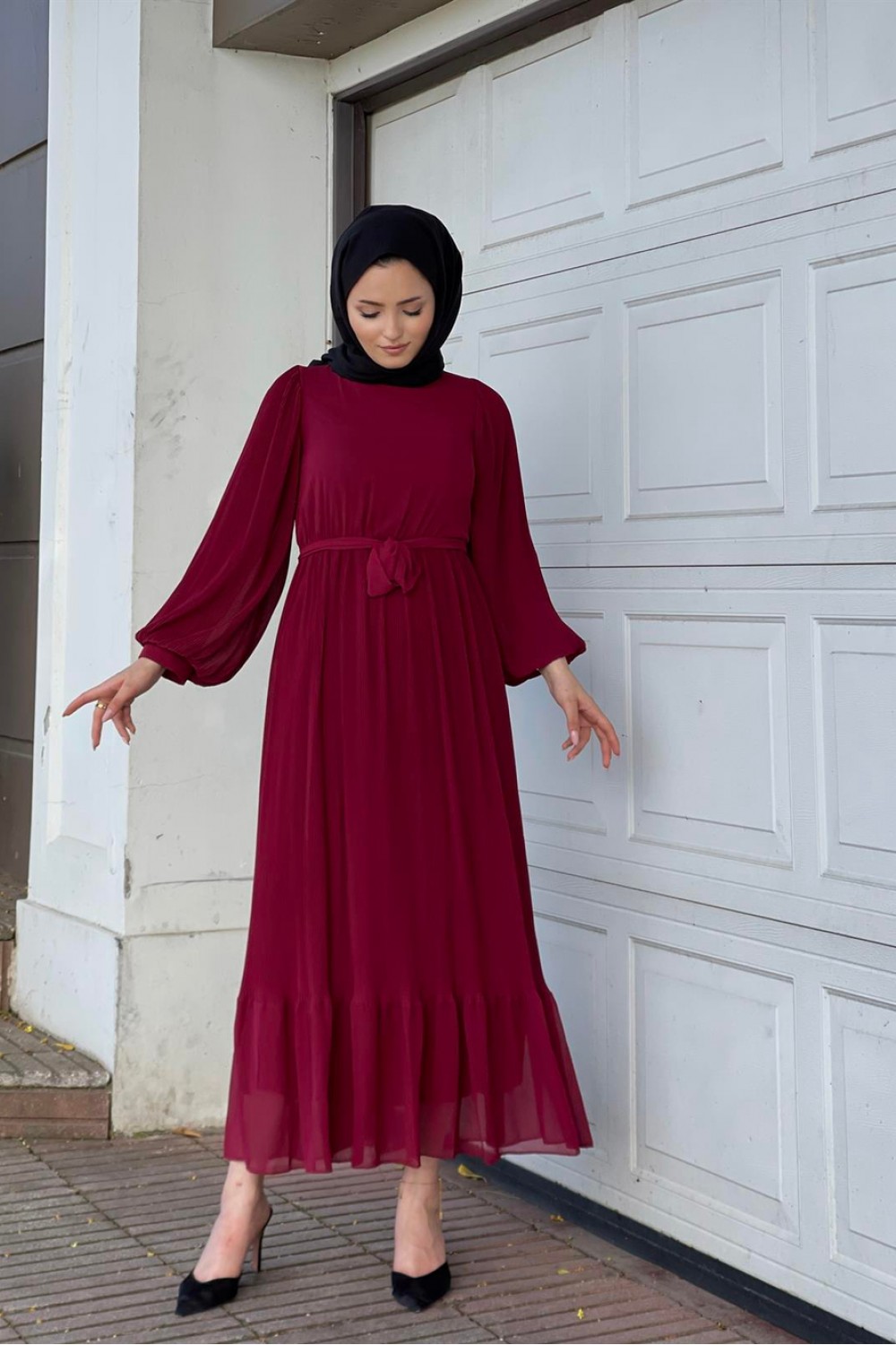 Balon Kol Piliseli Kuşaklı Elbise Bordo