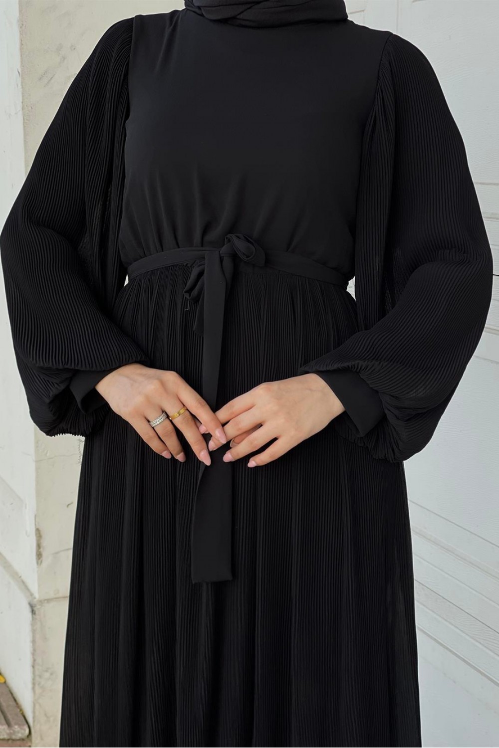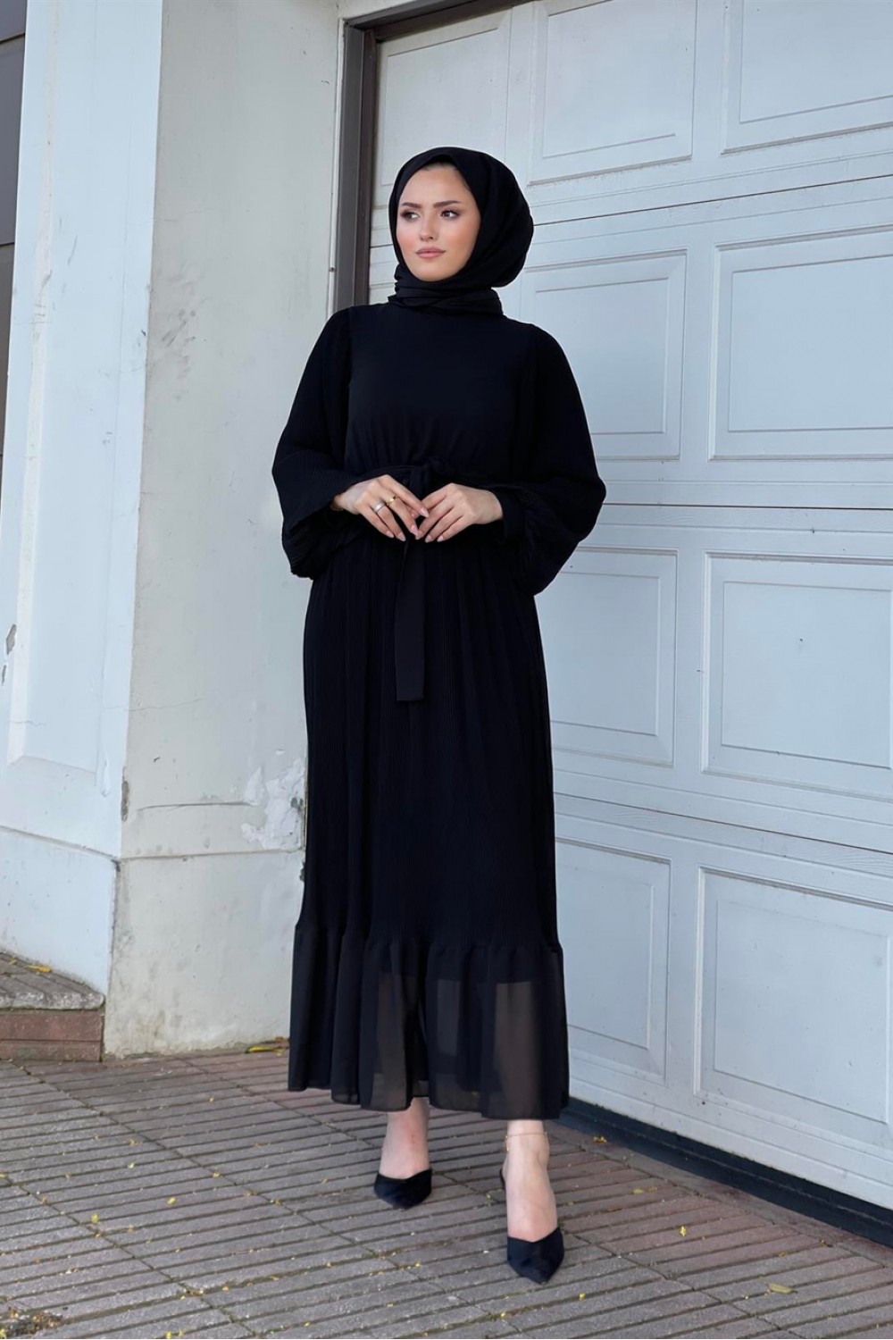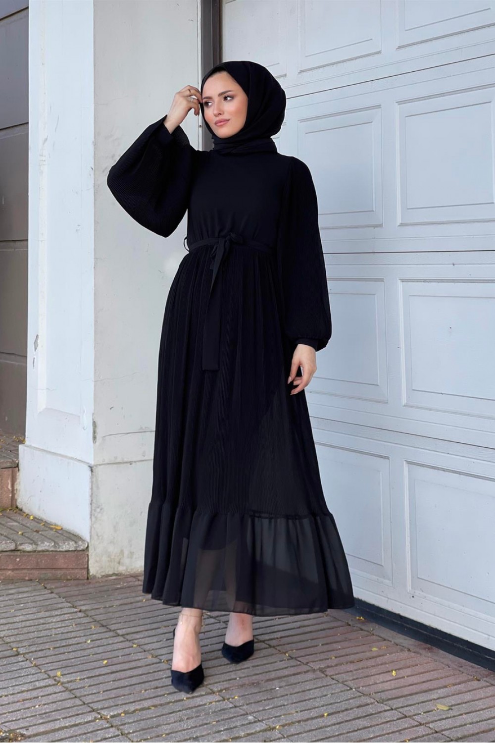 Balon Kol Piliseli Kuşaklı Elbise Siyah