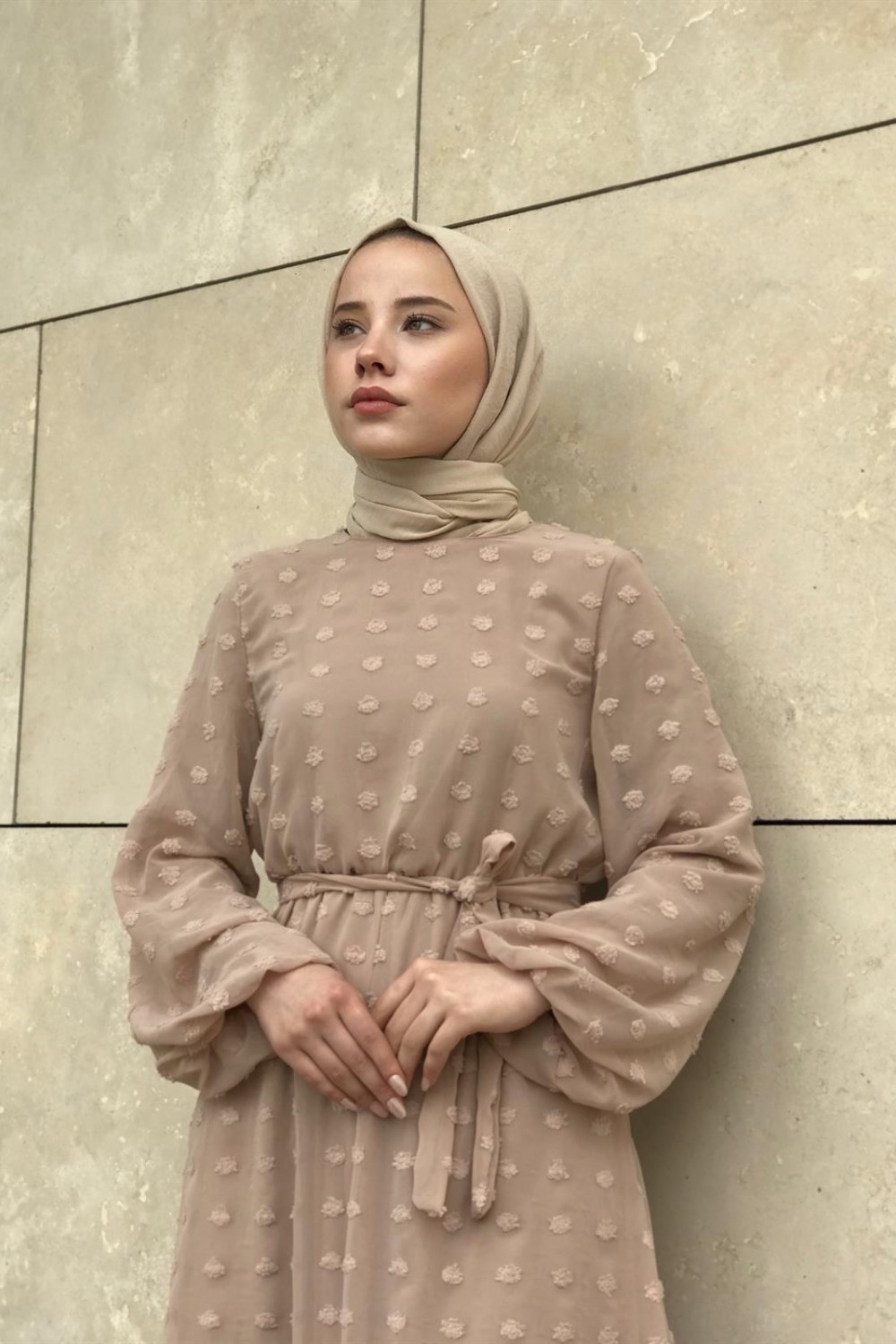 Beli Lastikli Kuşaklı Nova Elbise SütlüKahve