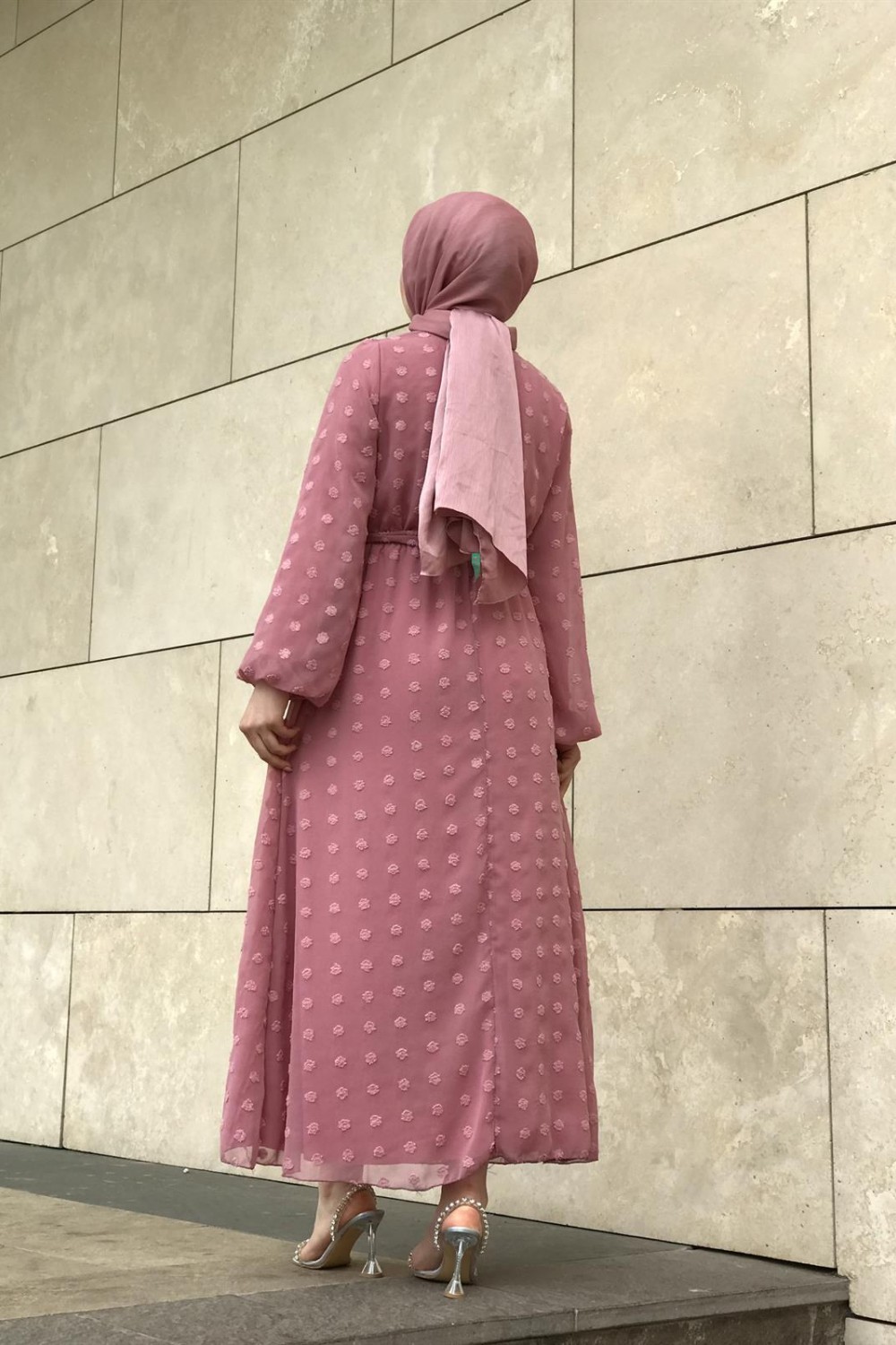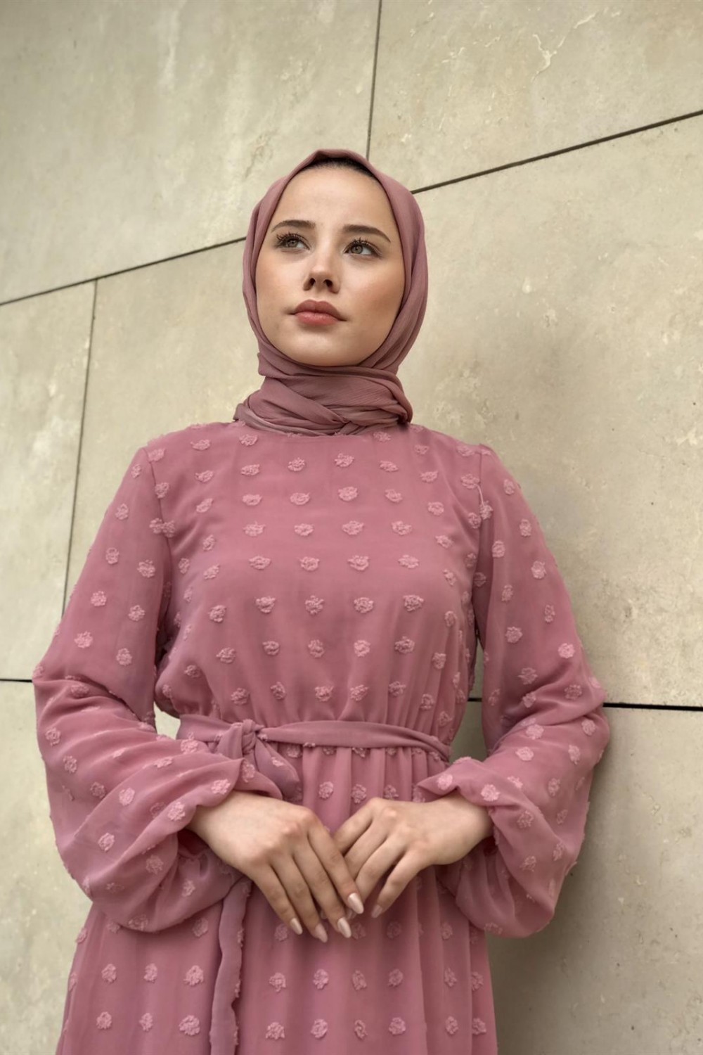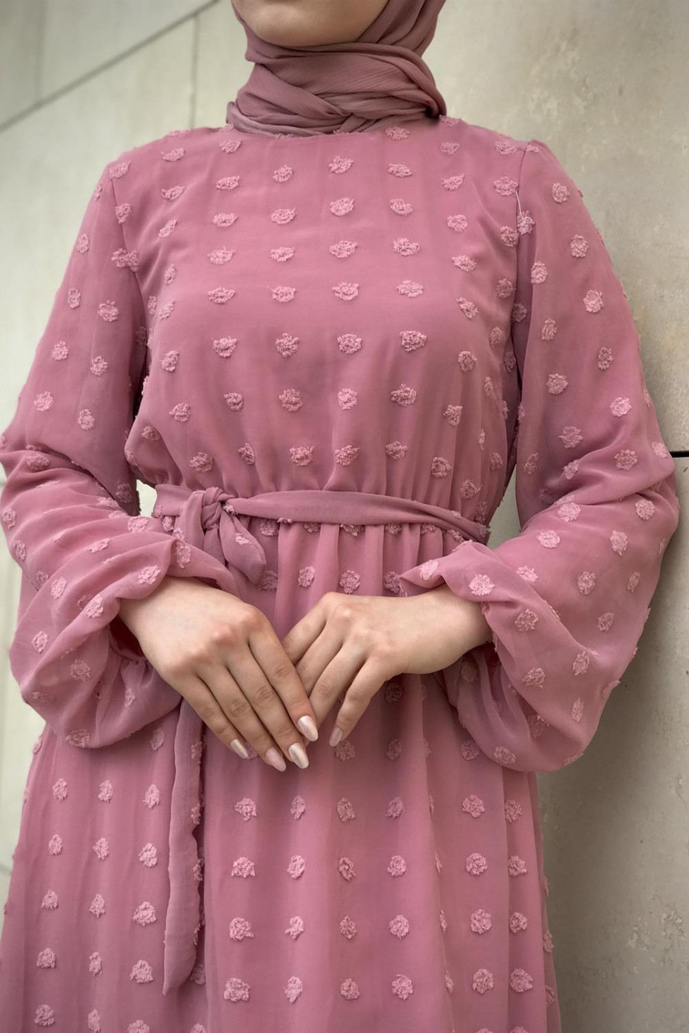 Beli Lastikli Kuşaklı Nova Elbise Pudra