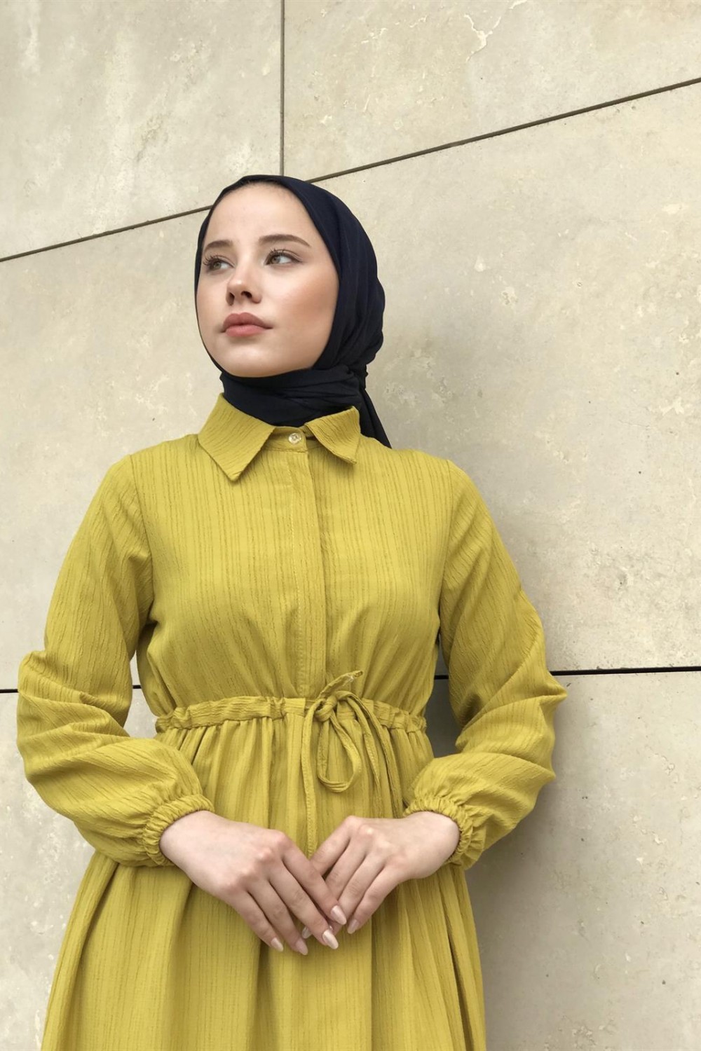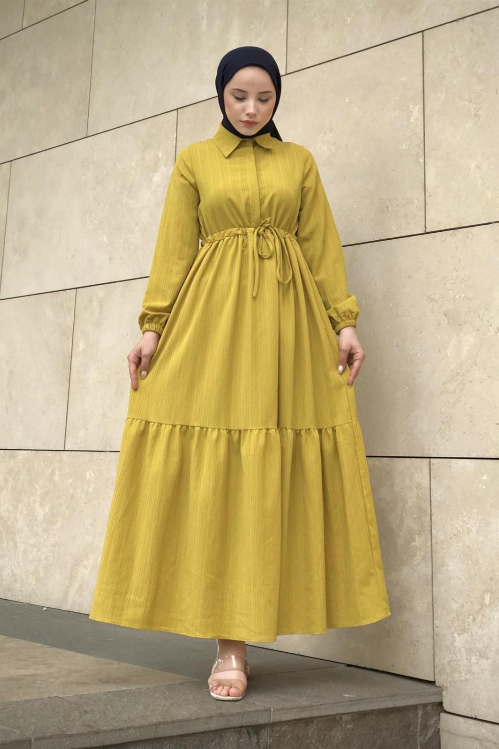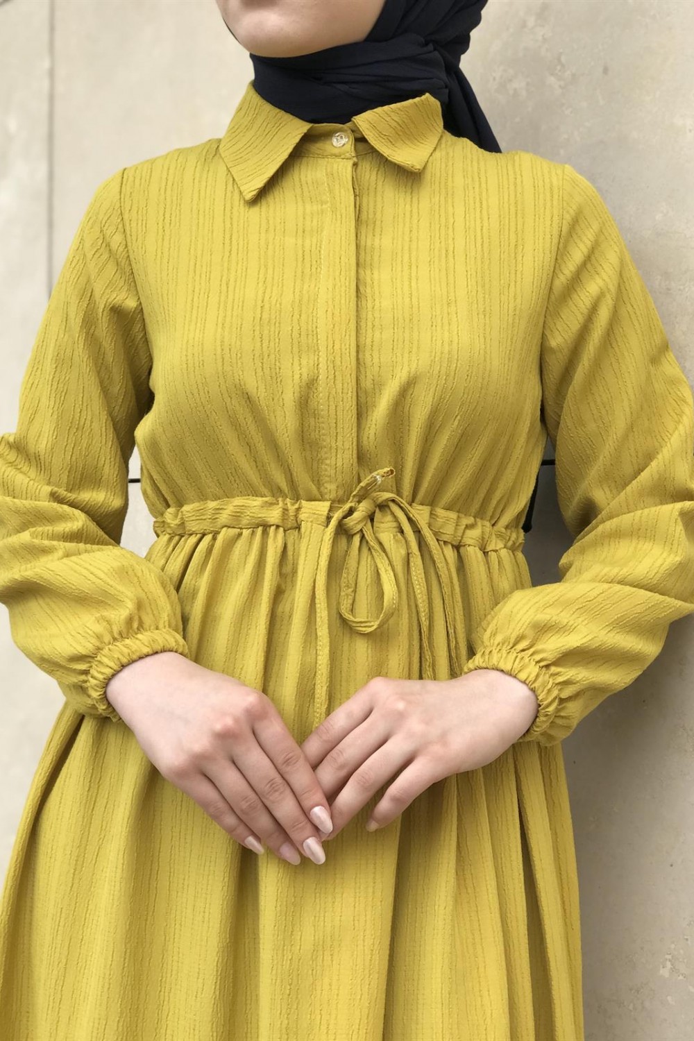 Beli Bağcıklı Gömlek Yaka Merven Elbise YağYeşili