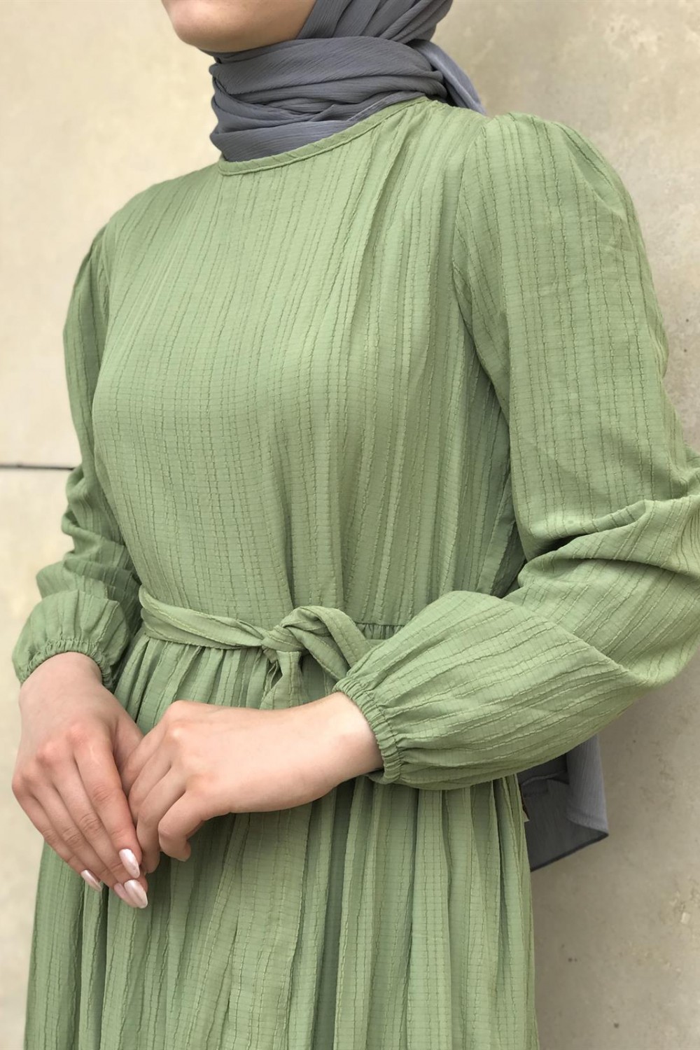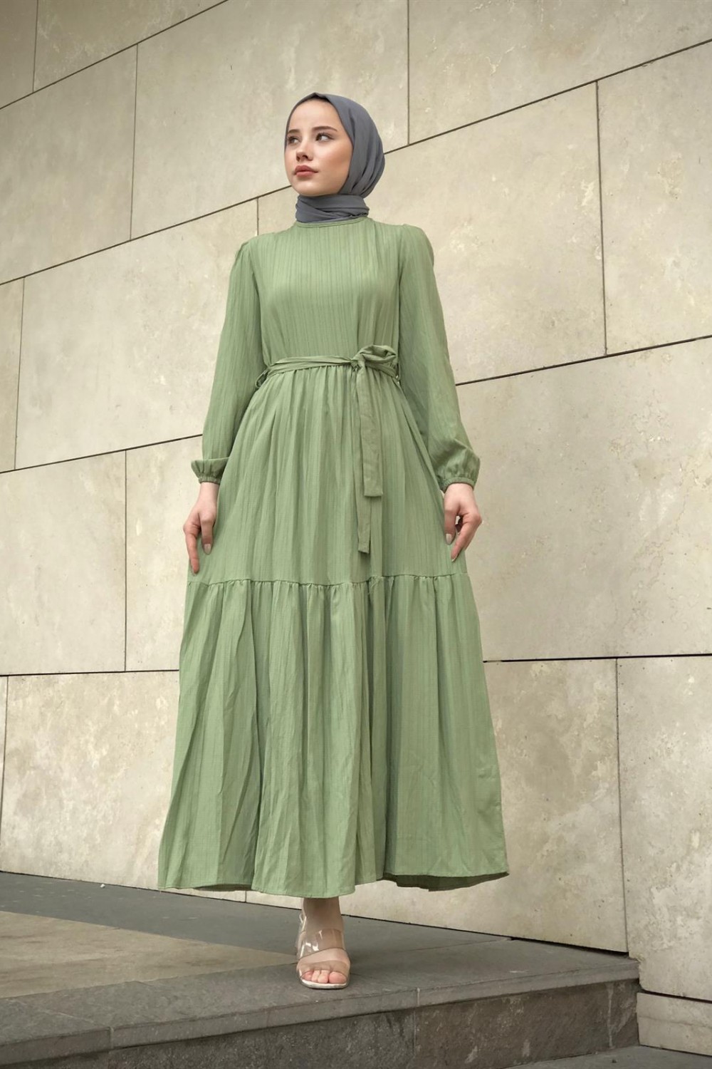 Kendinden Çizgili Maxi Elbise Çağla