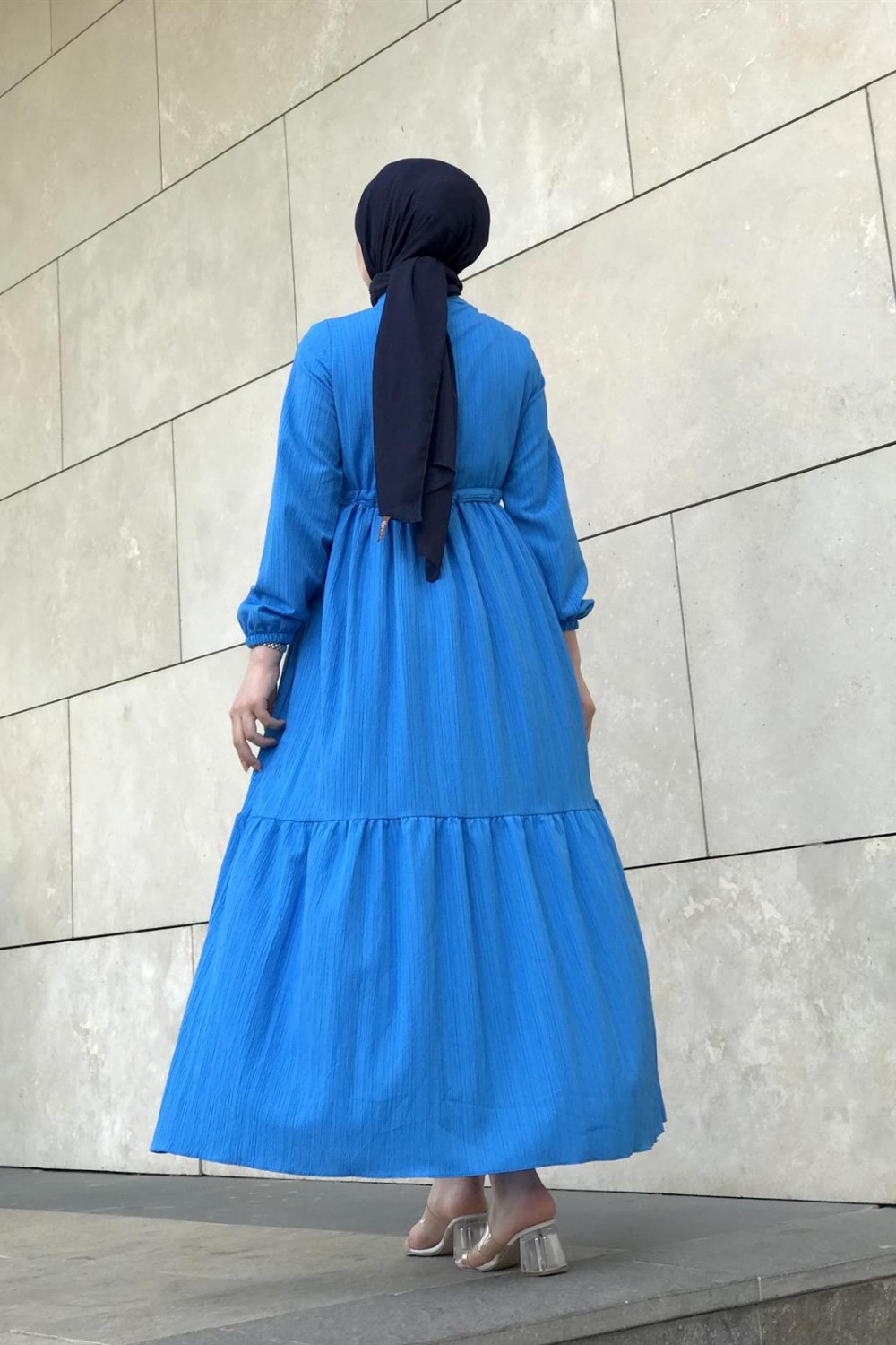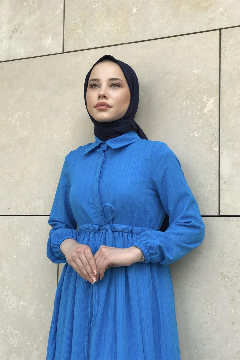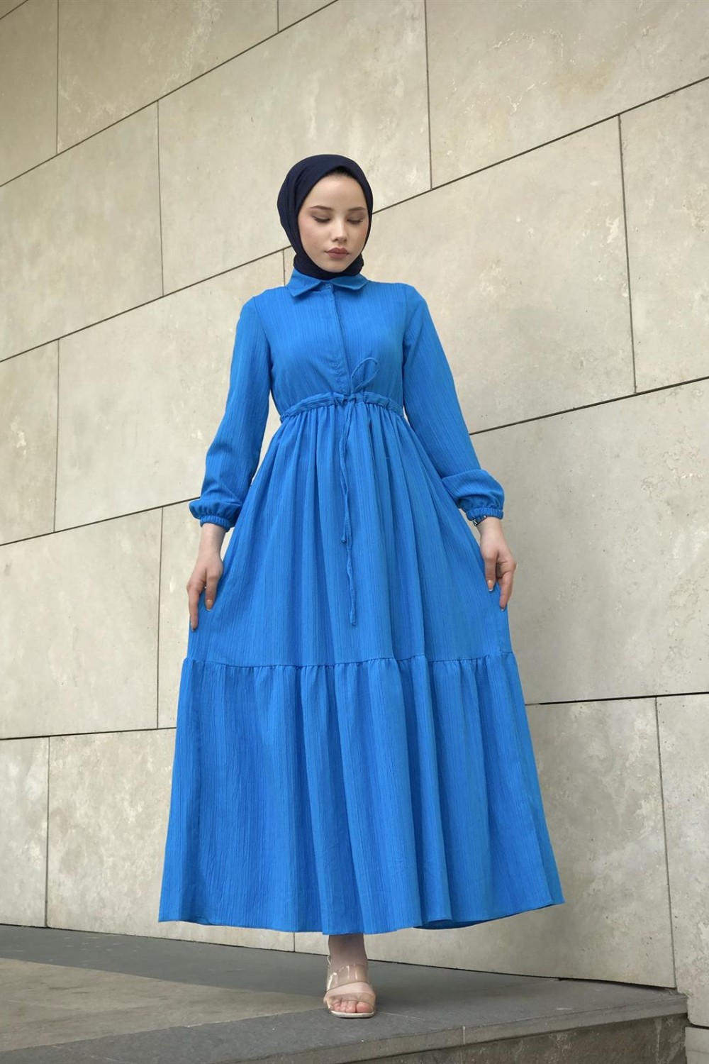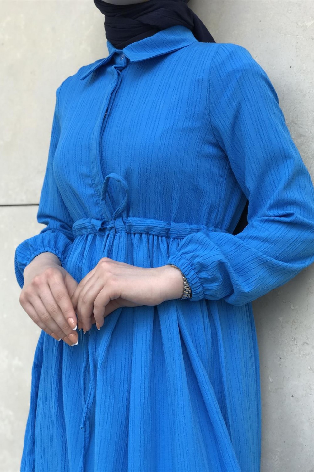 Beli Bağcıklı Gömlek Yaka Merven Elbise İndigo