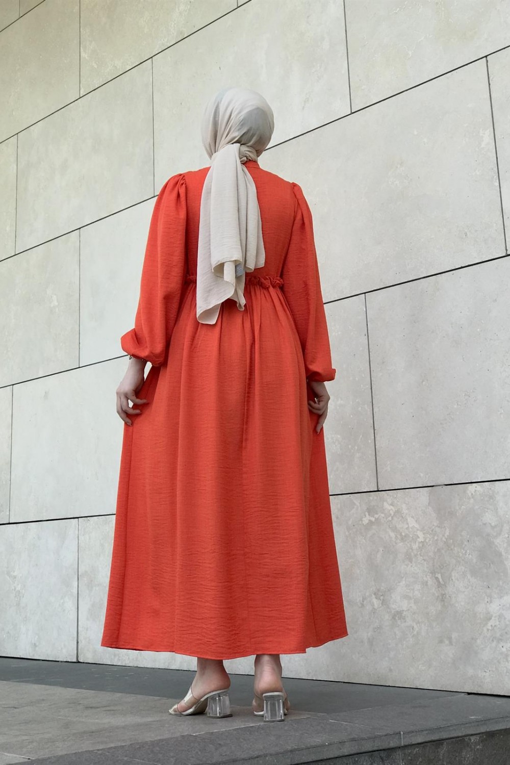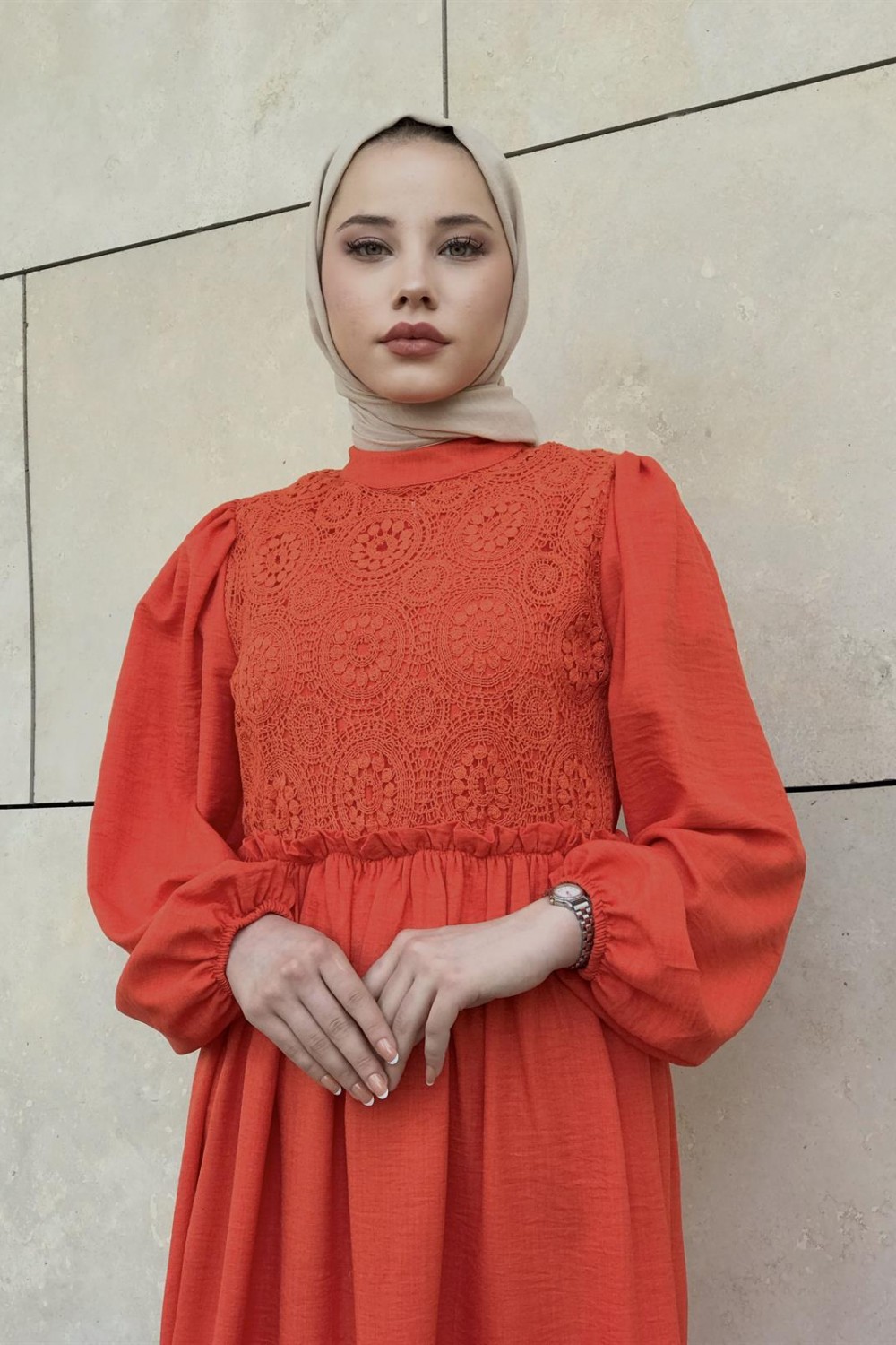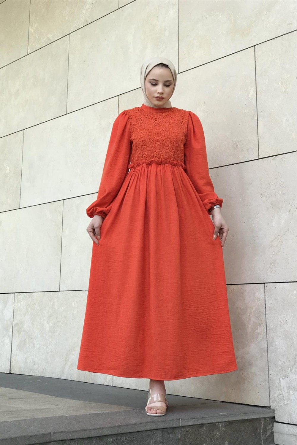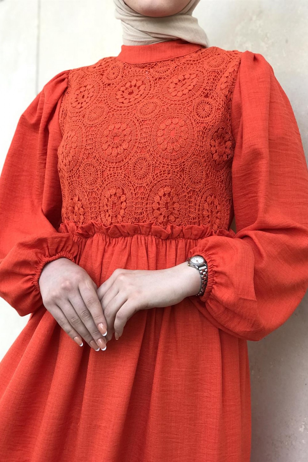 Balon Kol Beli Lastikli Güpür Detay Elbise Turuncu