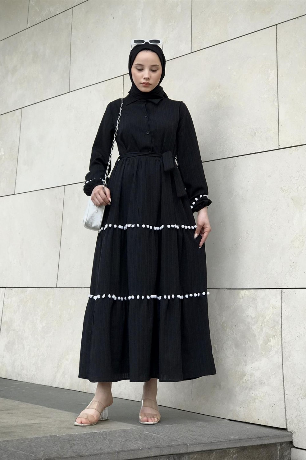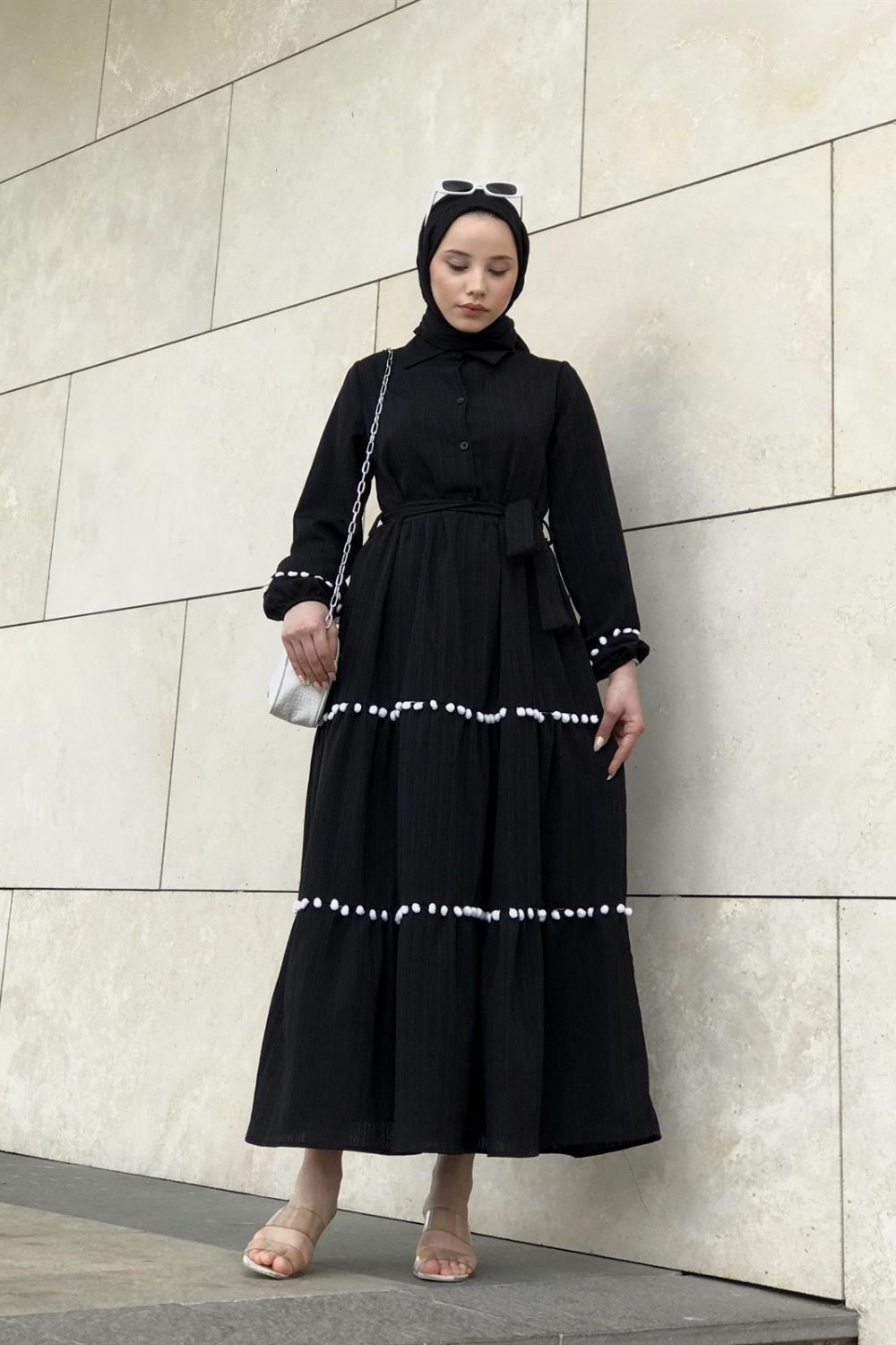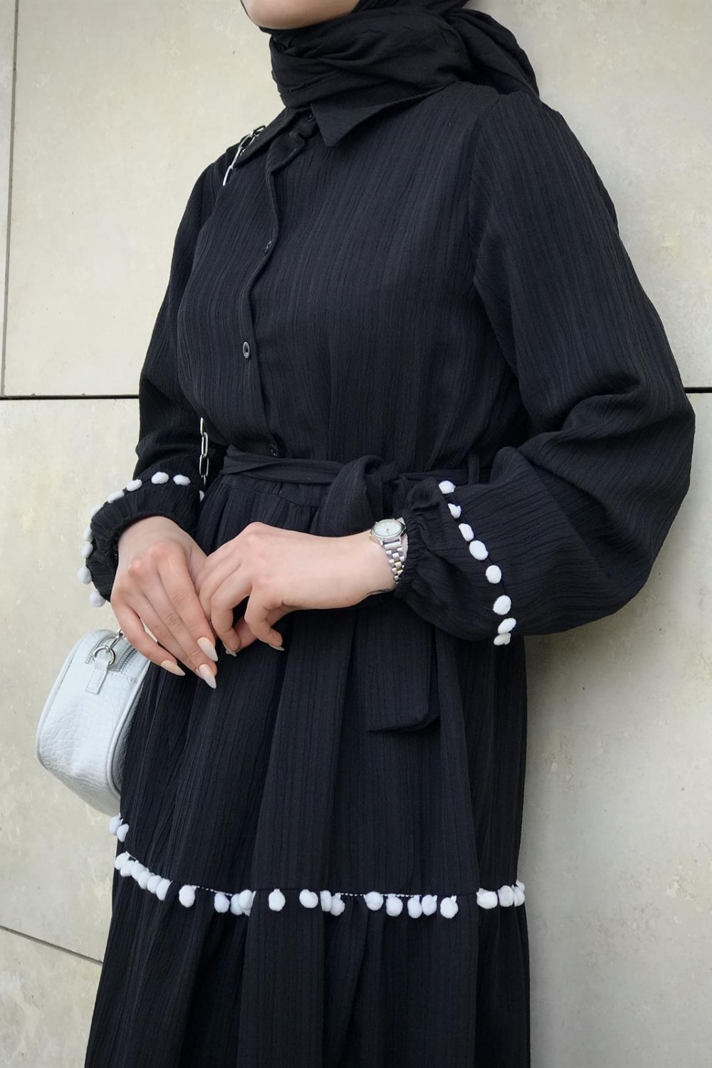 Mini Ponpon İşlemeli Tesettür Elbise Siyah