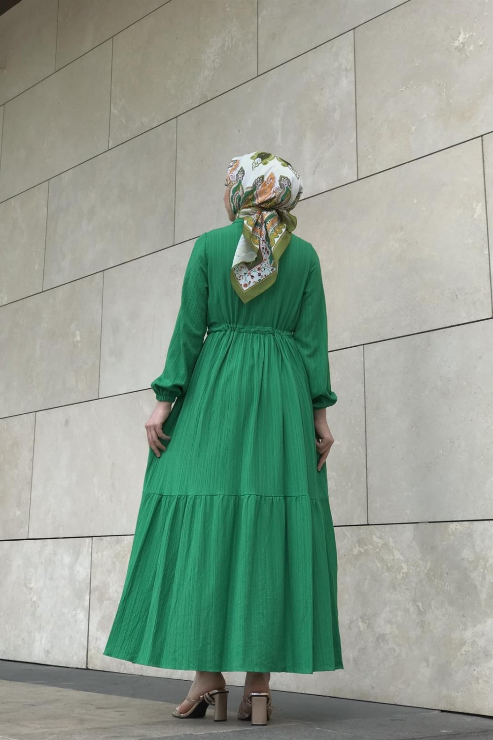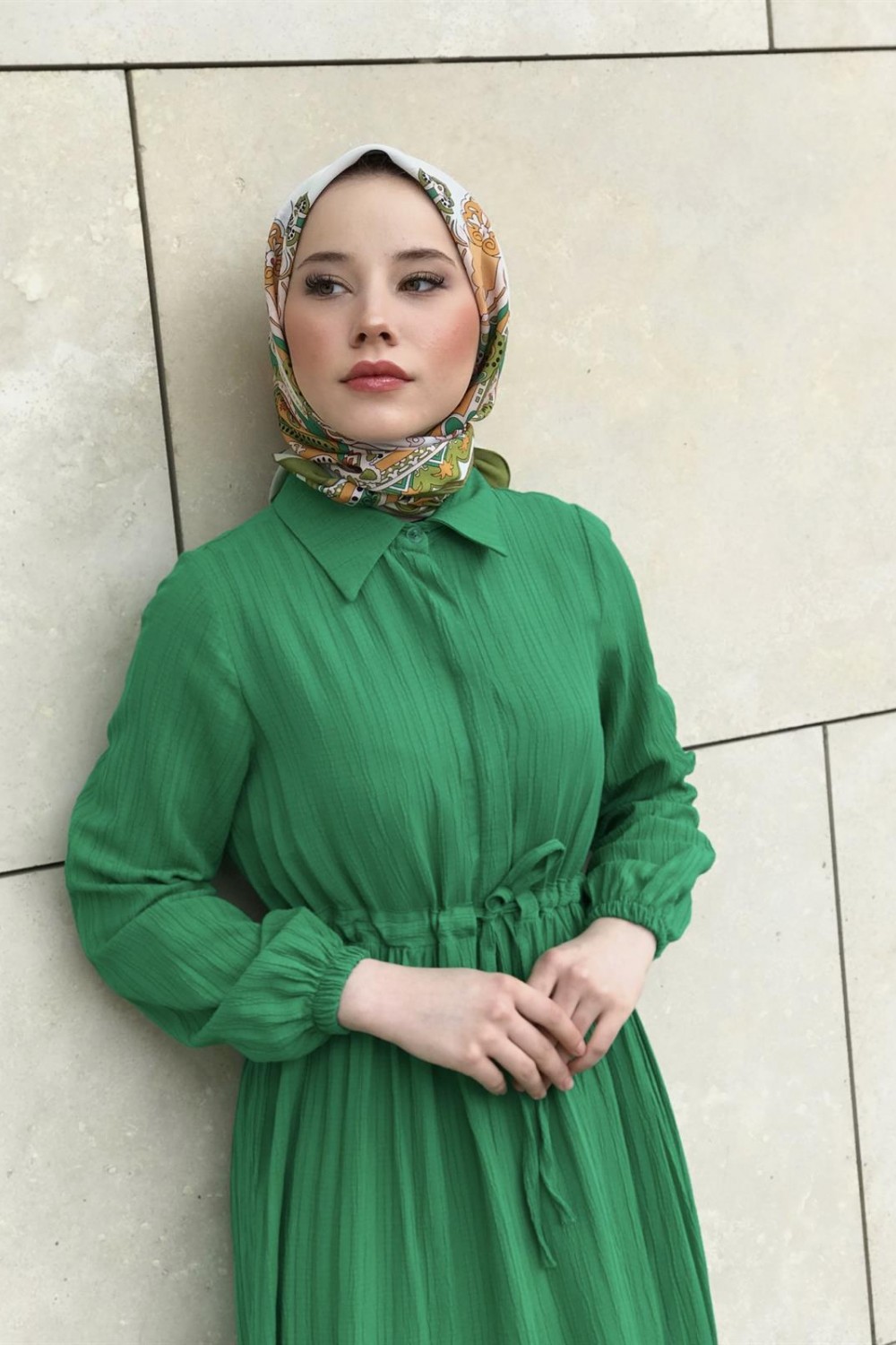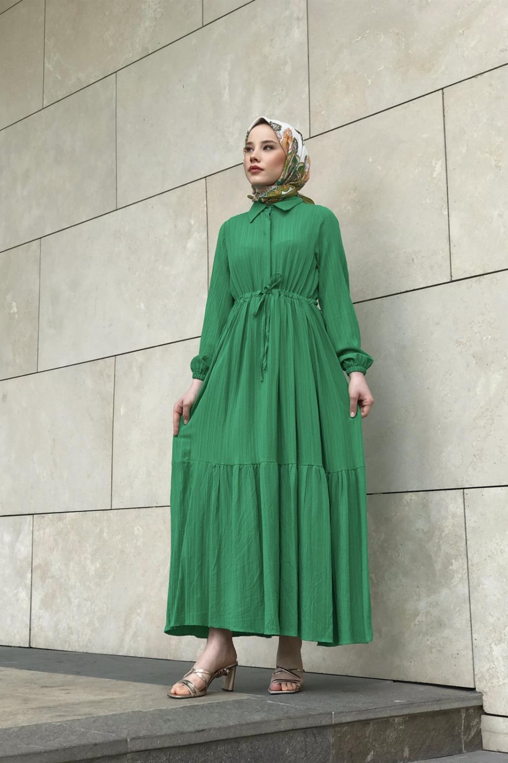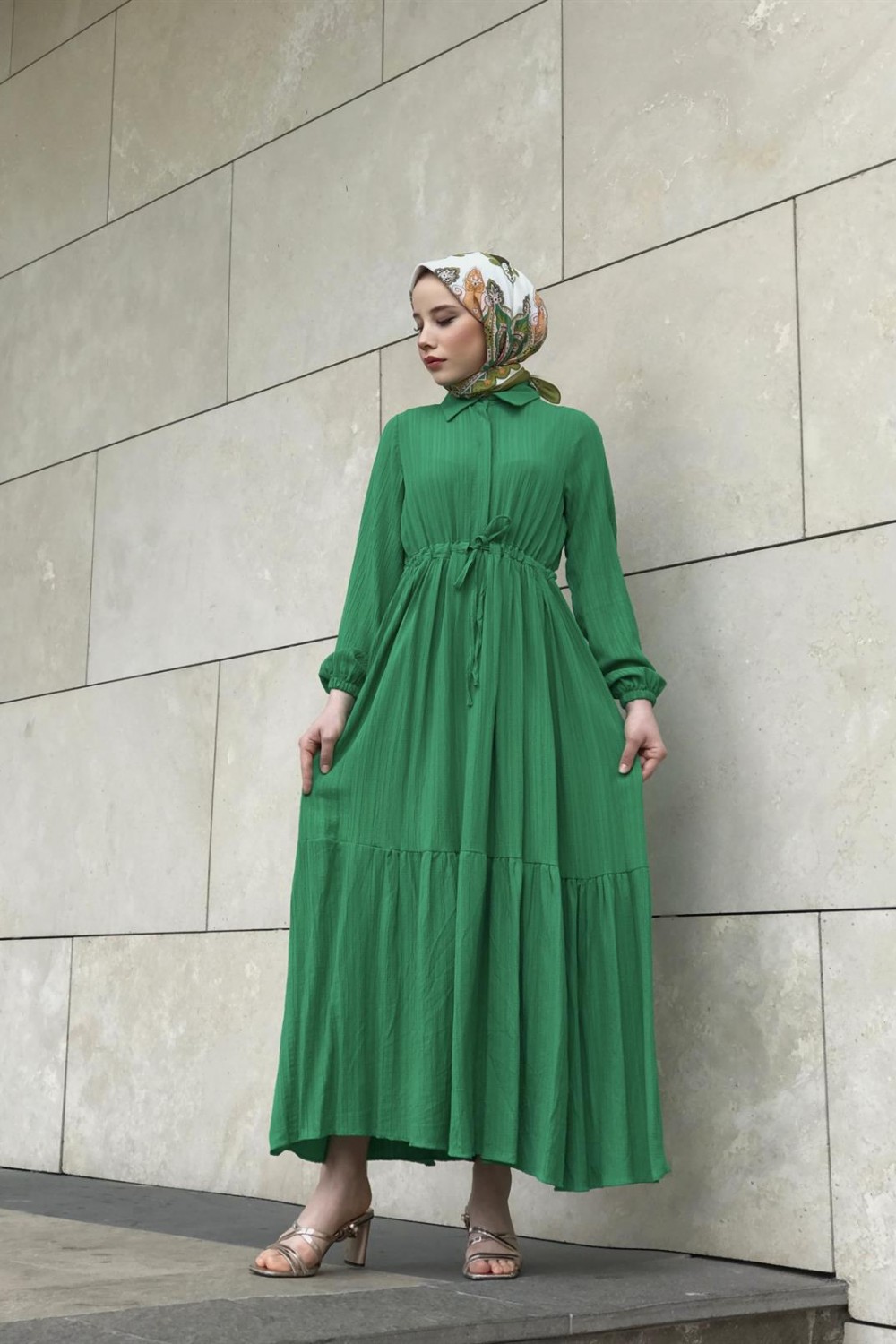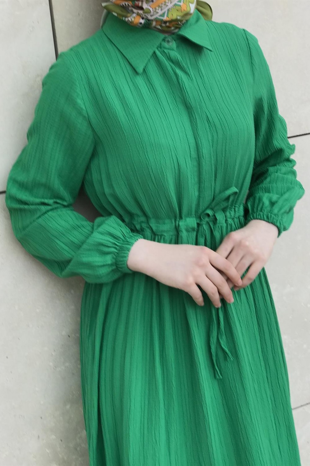 Beli Bağcıklı Gömlek Yaka Merven Elbise Yeşil