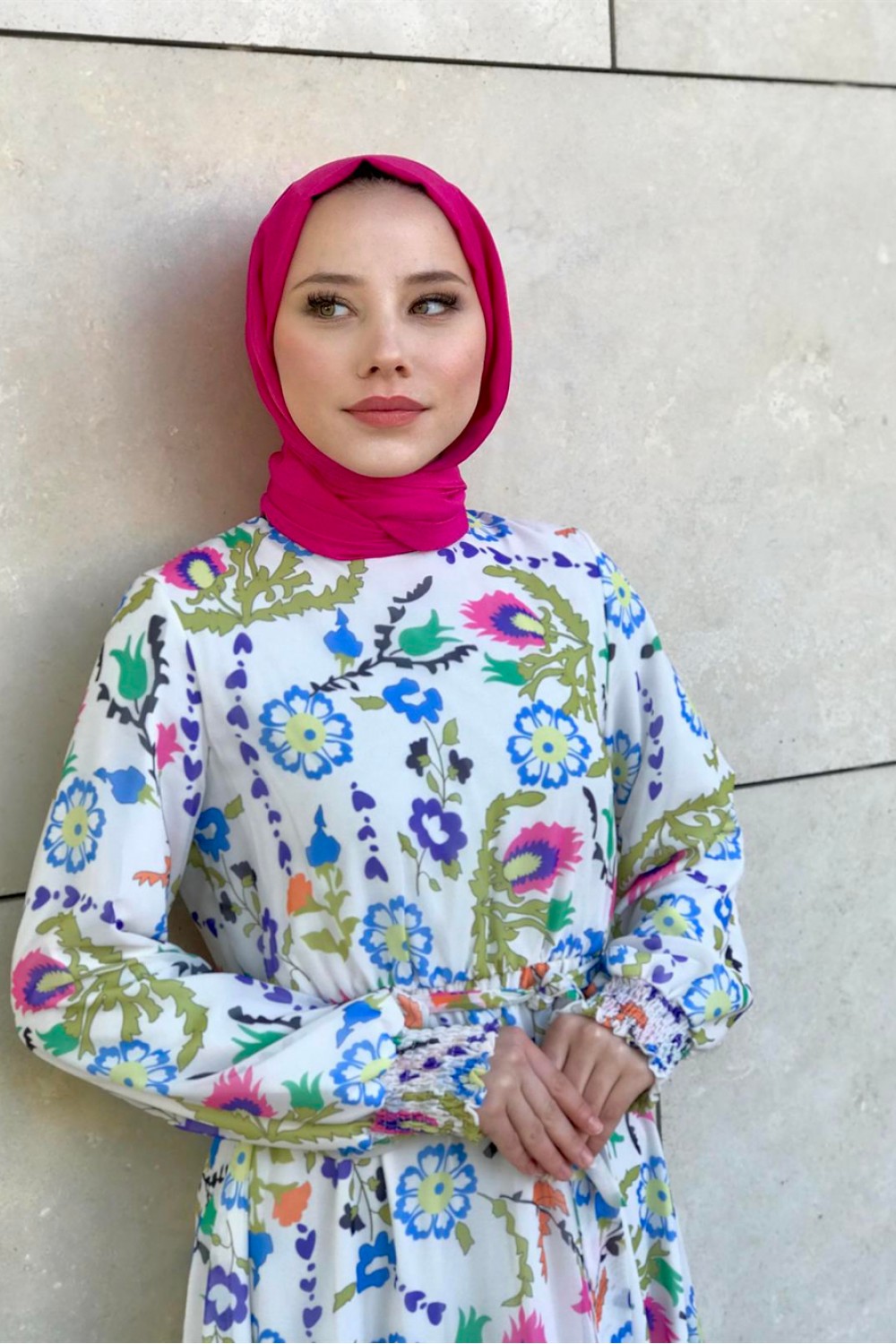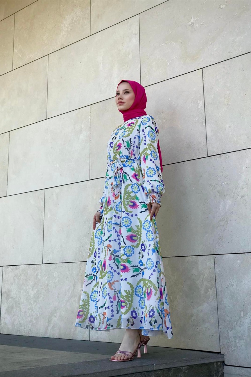Kilim Desen Balon Kol Şifon Elbise Mavi