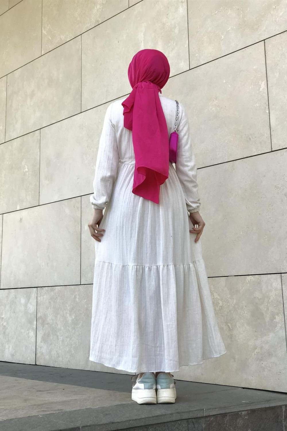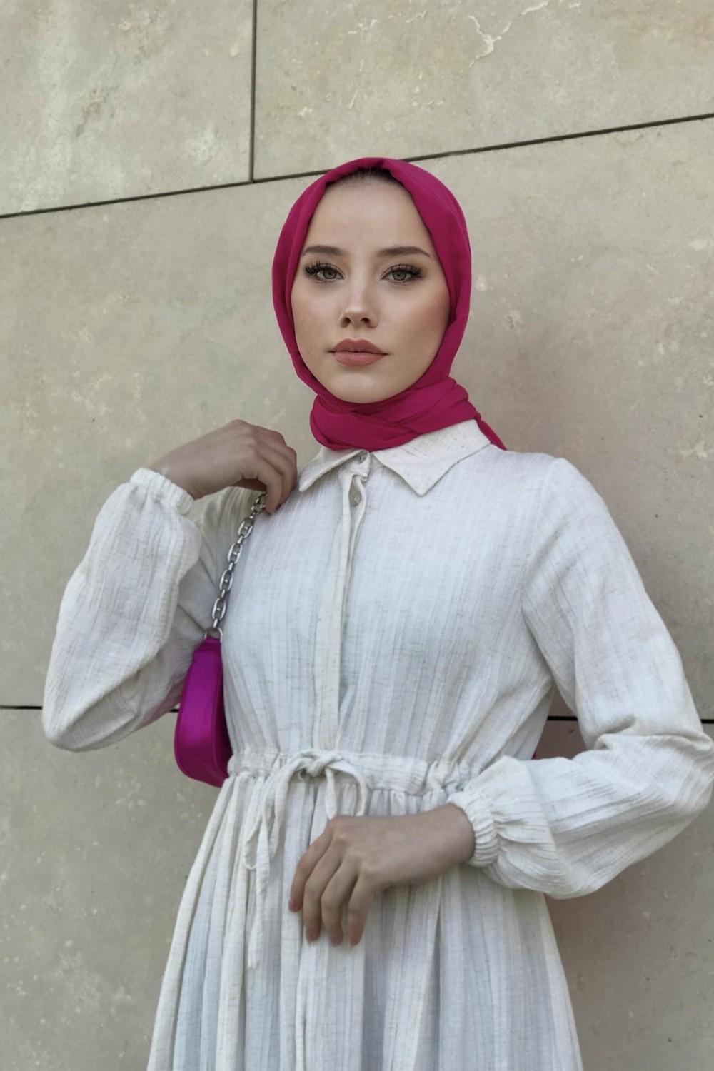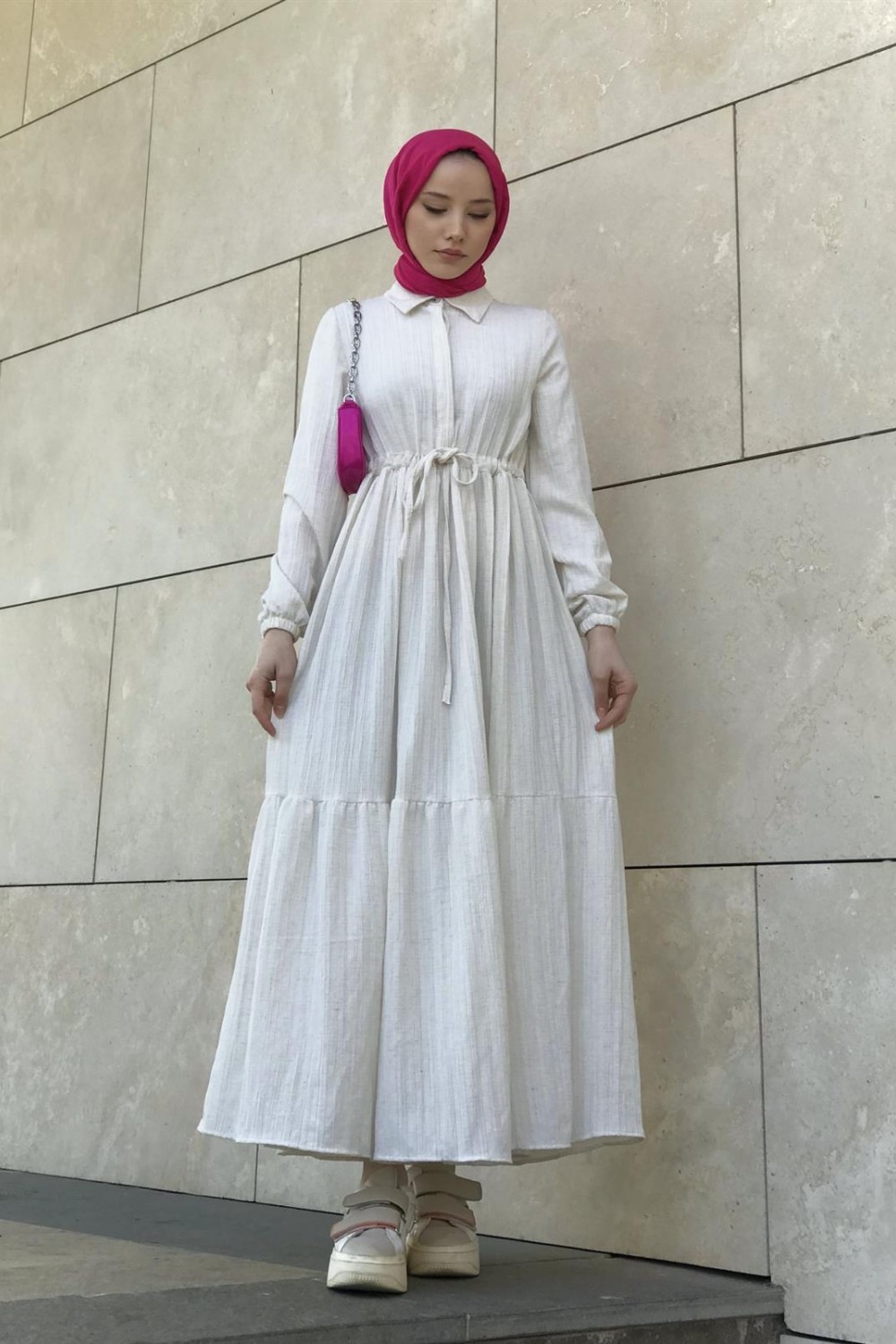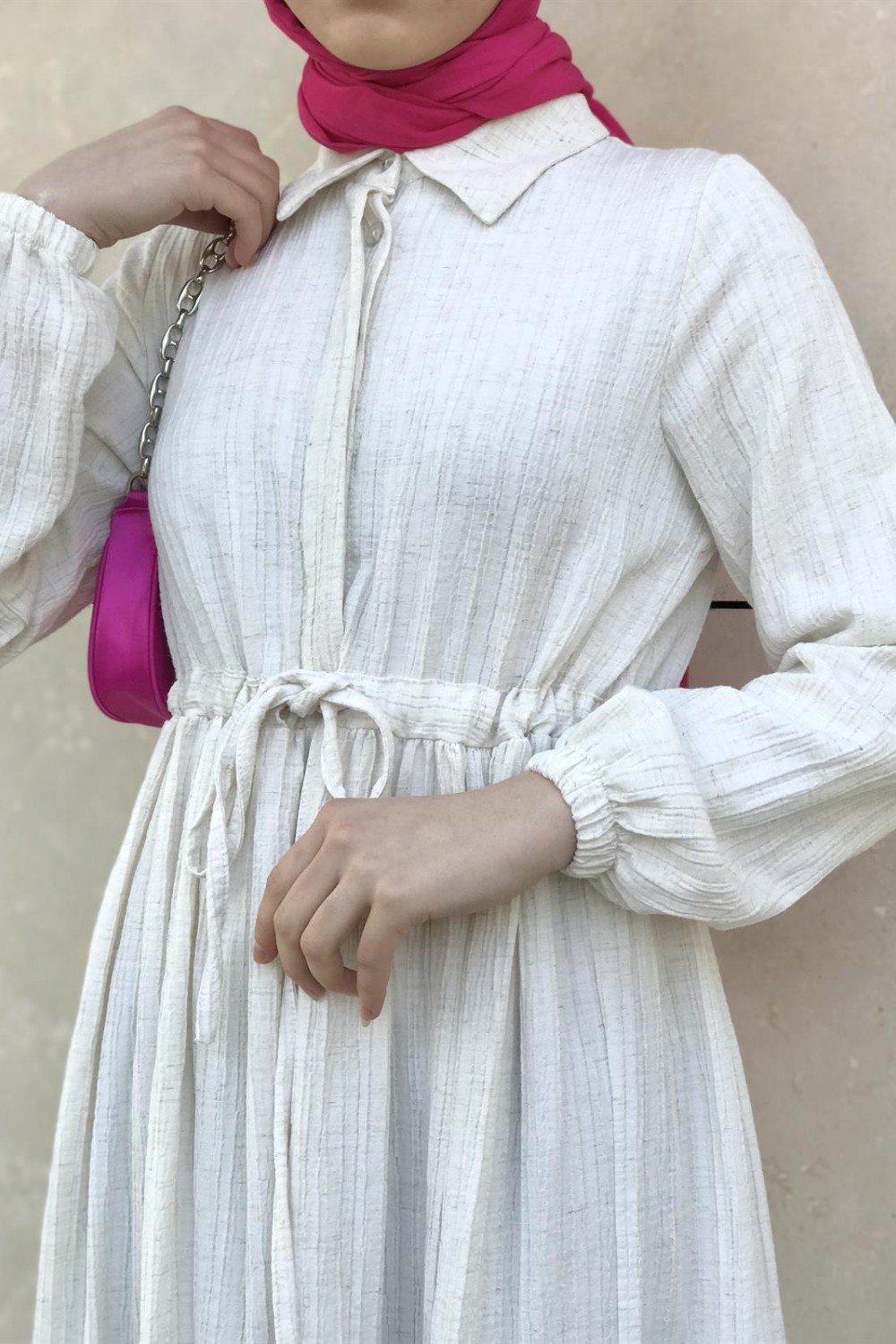 Beli Bağcıklı Gömlek Yaka Merven Elbise Beyaz