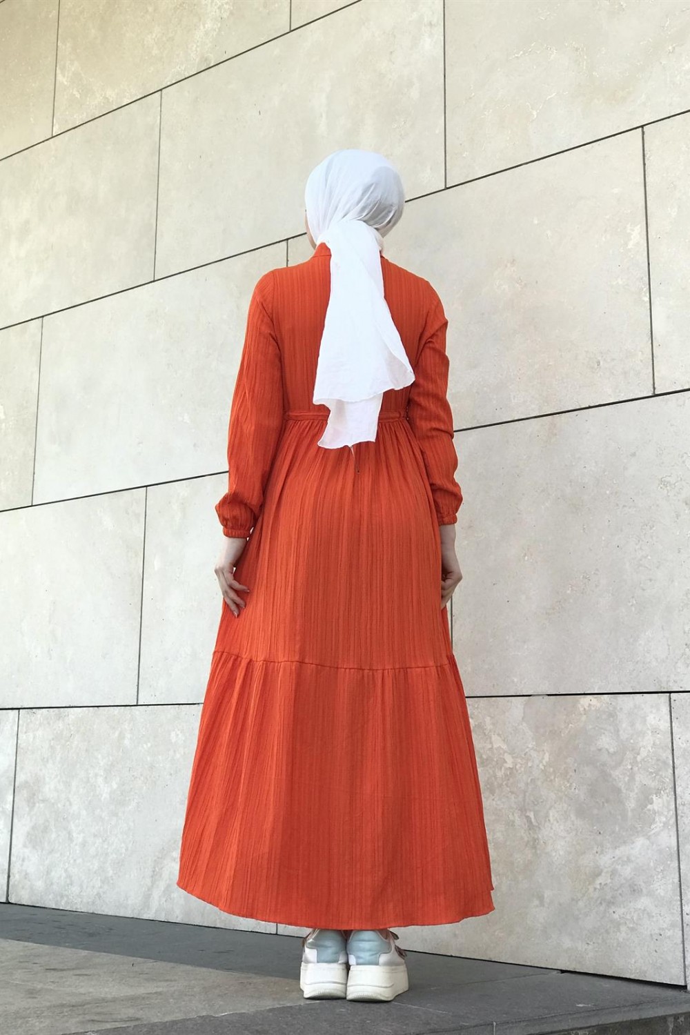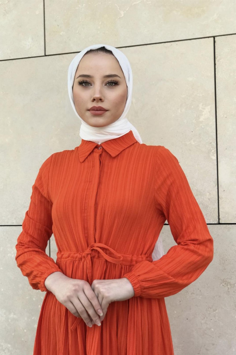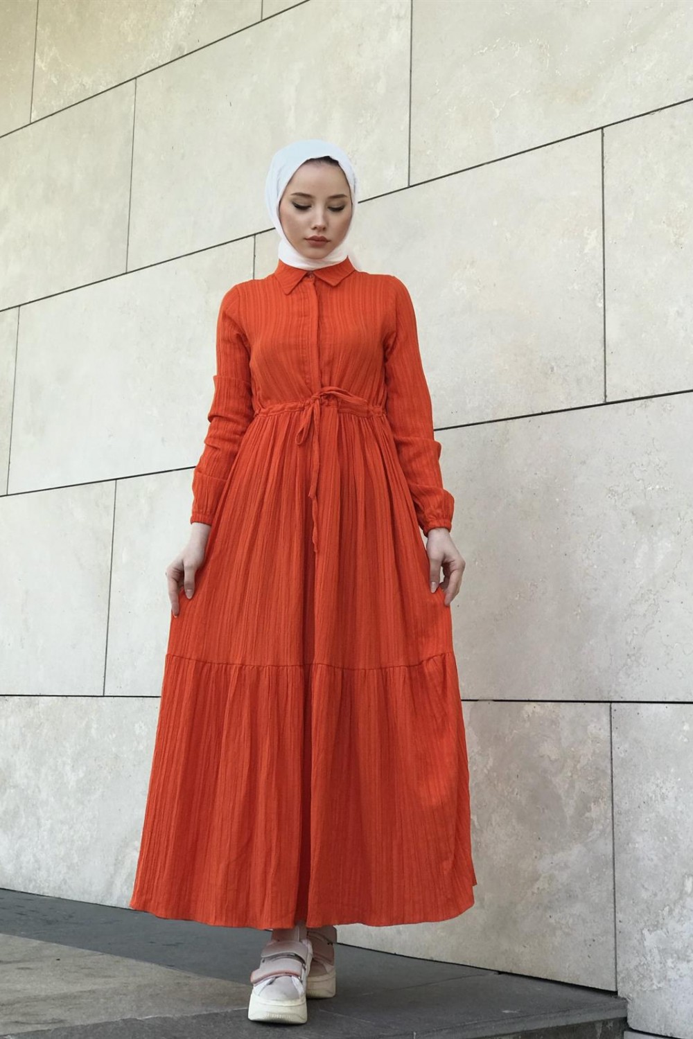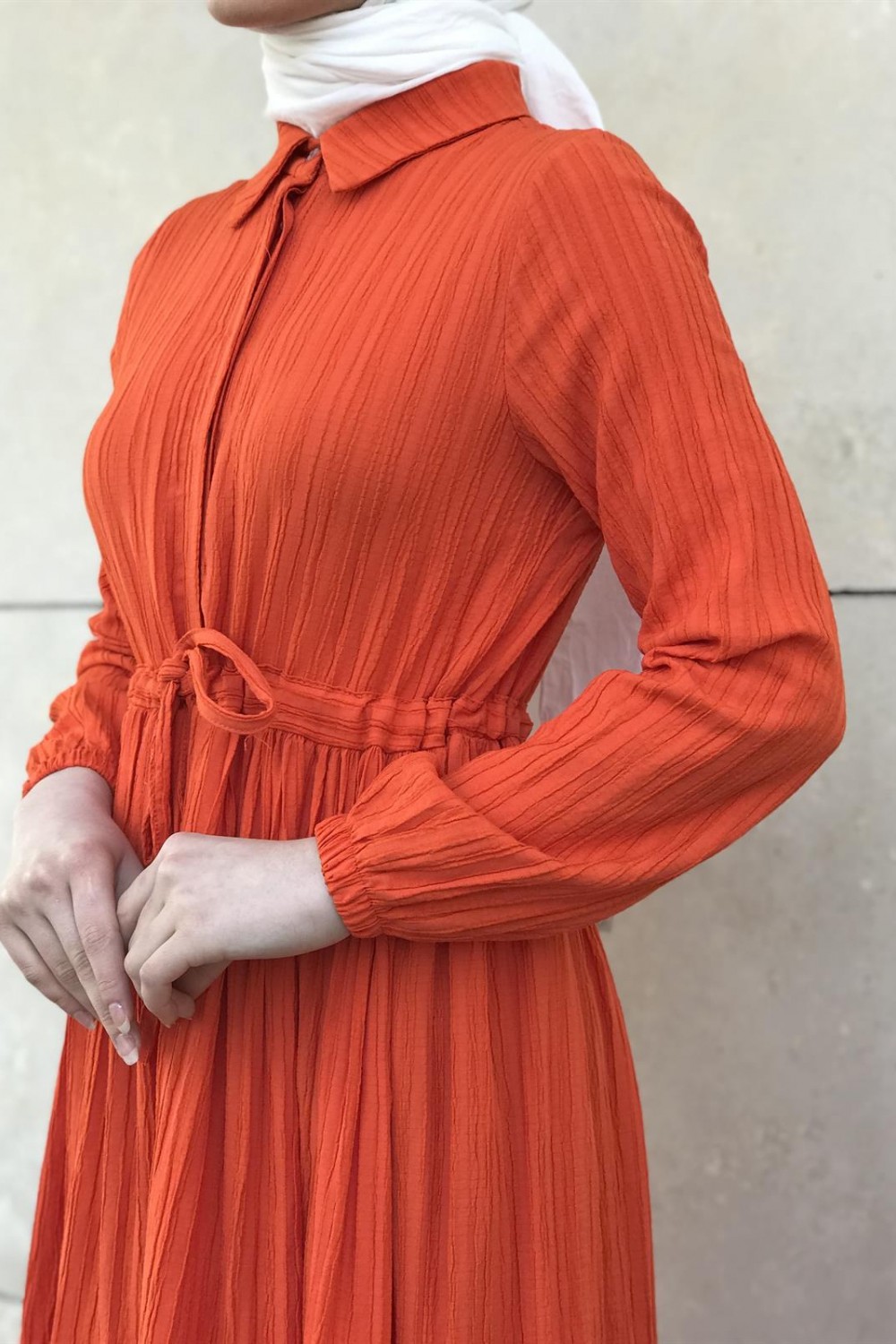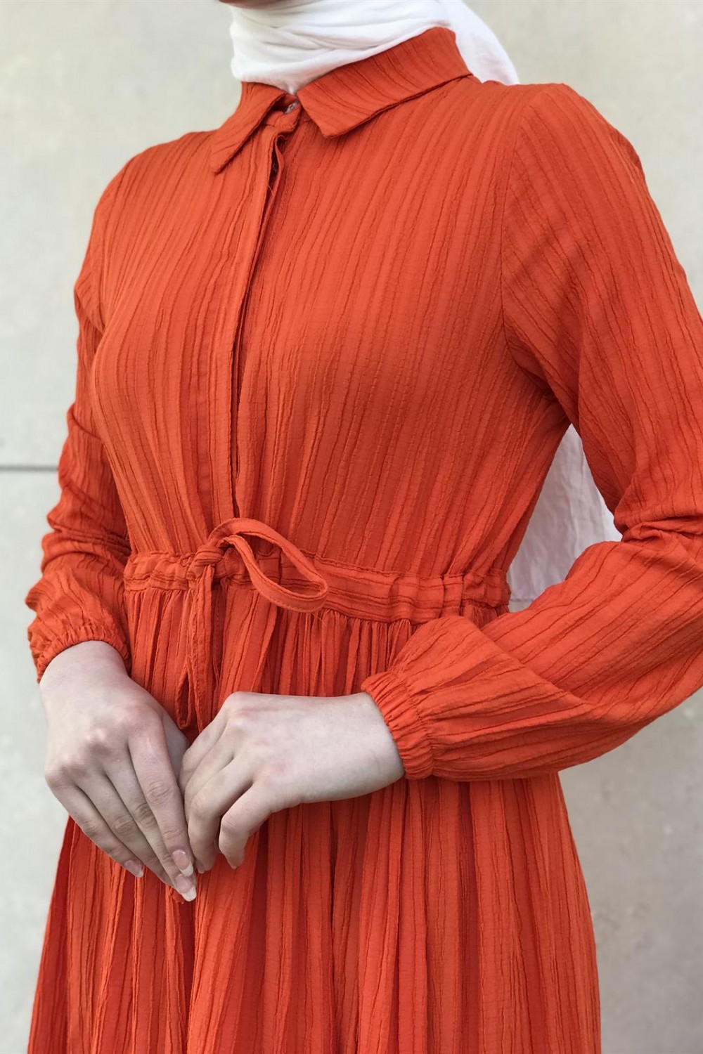 Beli Bağcıklı Gömlek Yaka Merven Elbise Turuncu