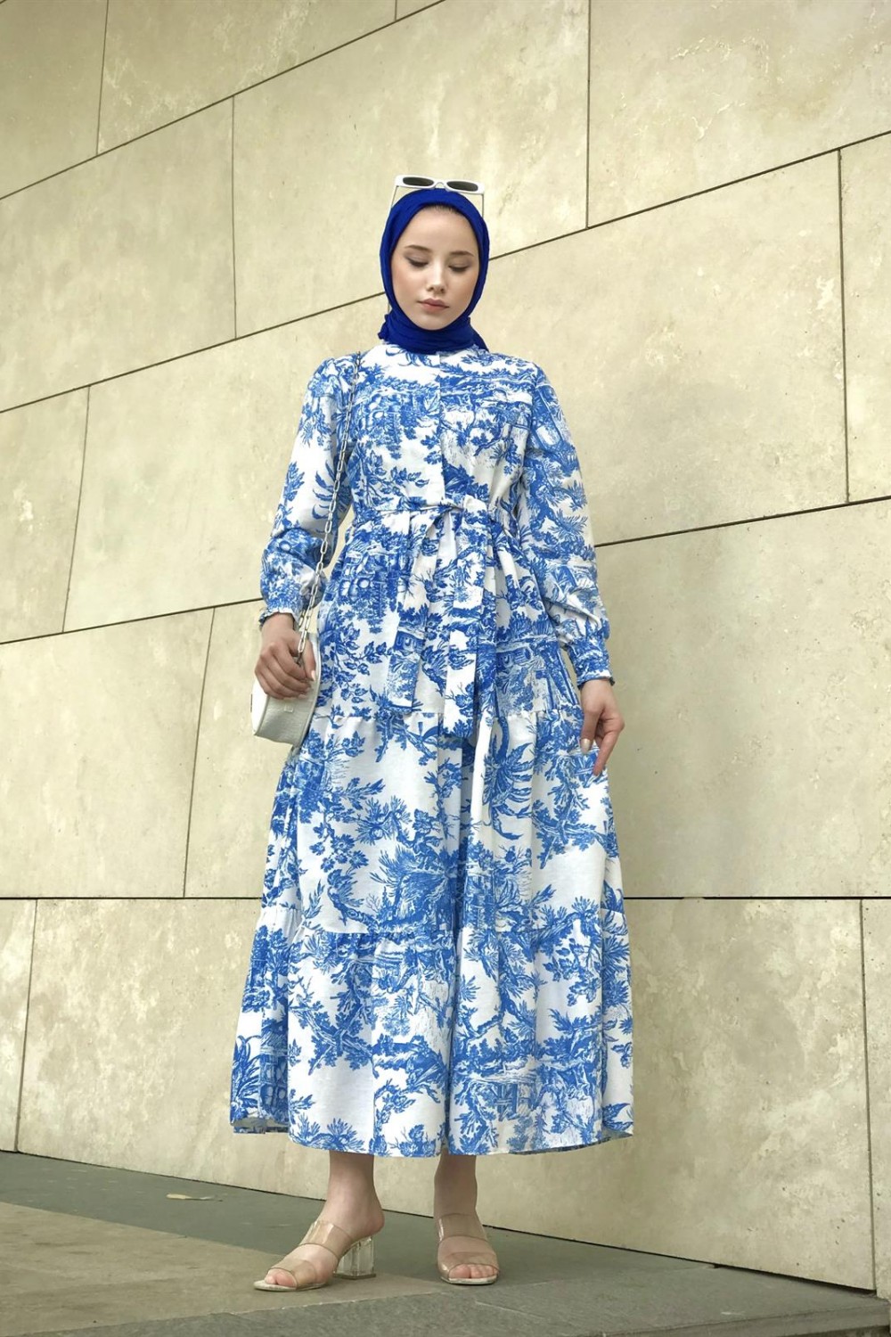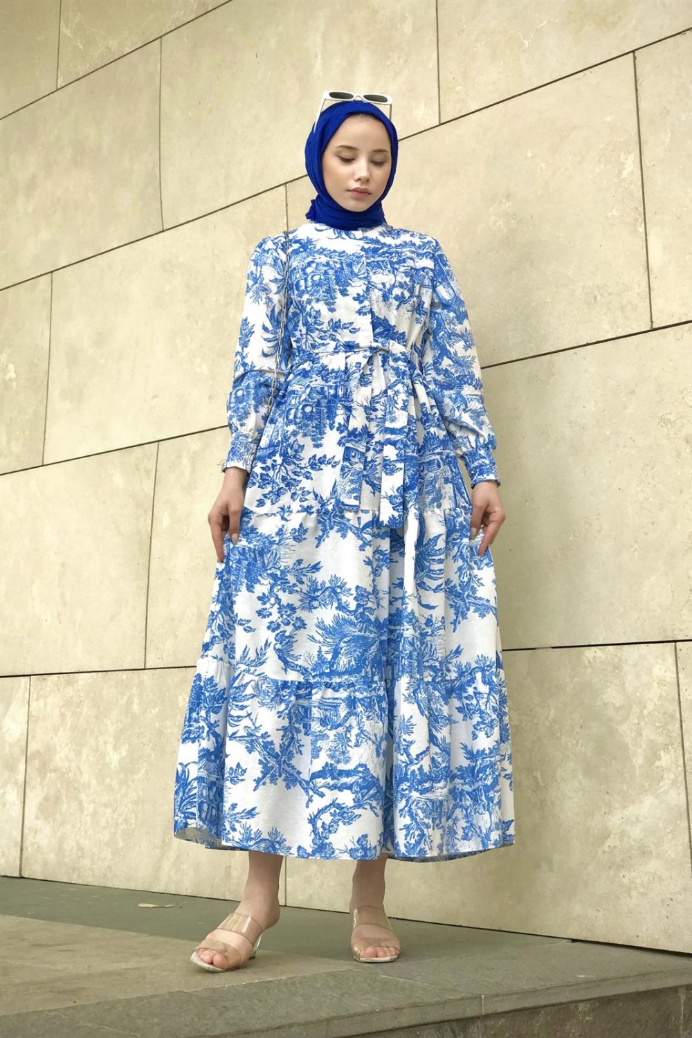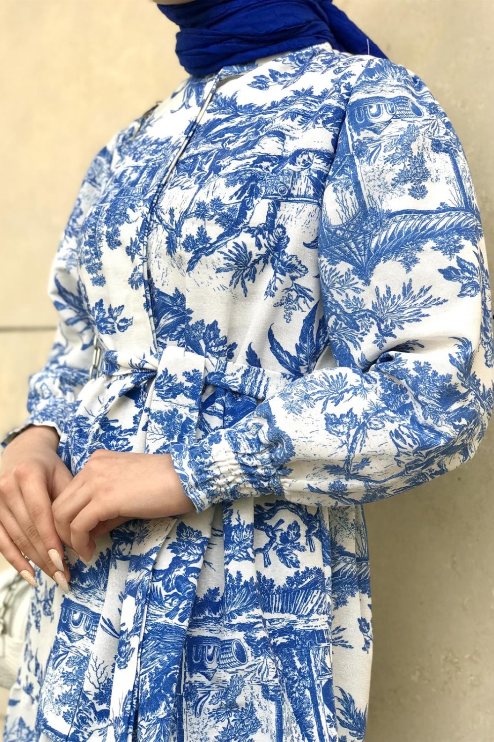 Kolları Büzgülü Yarım Düğmeli Etnik Desen Elbise Mavi