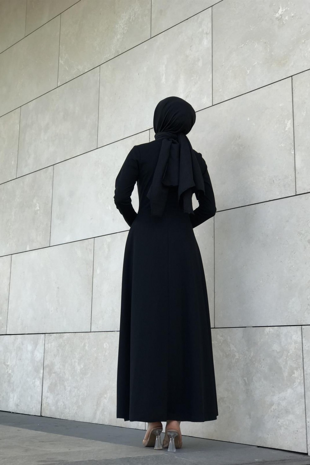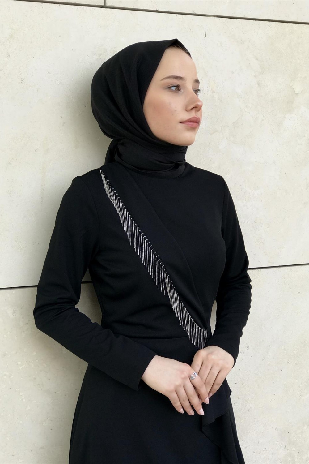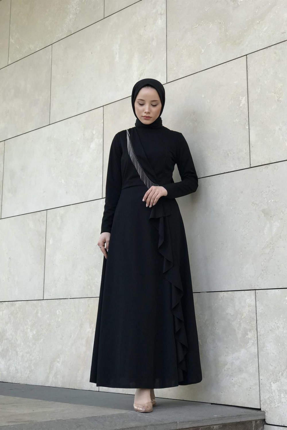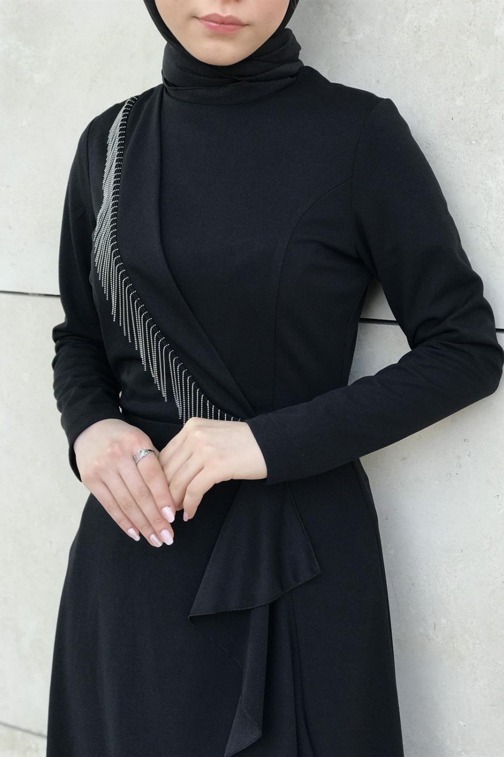 Önü Çapraz Zincirli Fırfıt Detay Elbise Siyah