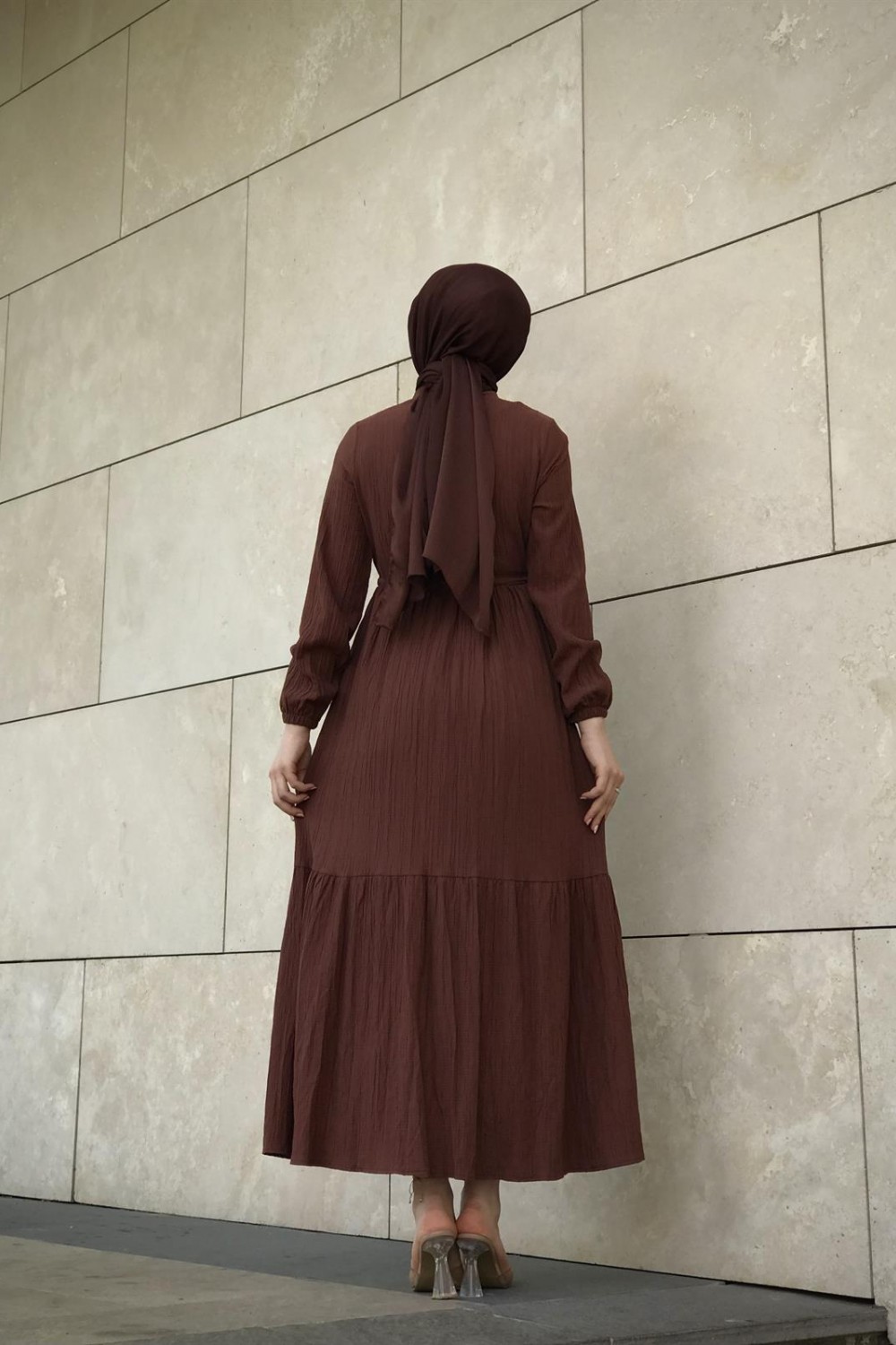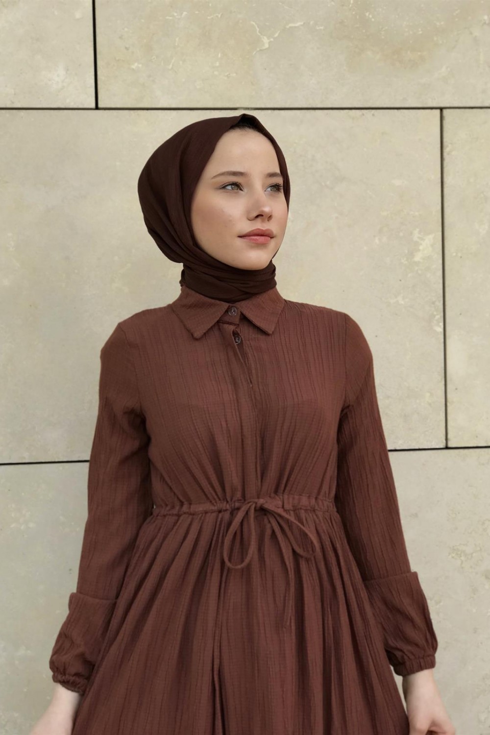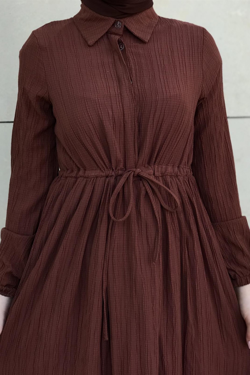 Beli Bağcıklı Gömlek Yaka Merven Elbise Kahverengi