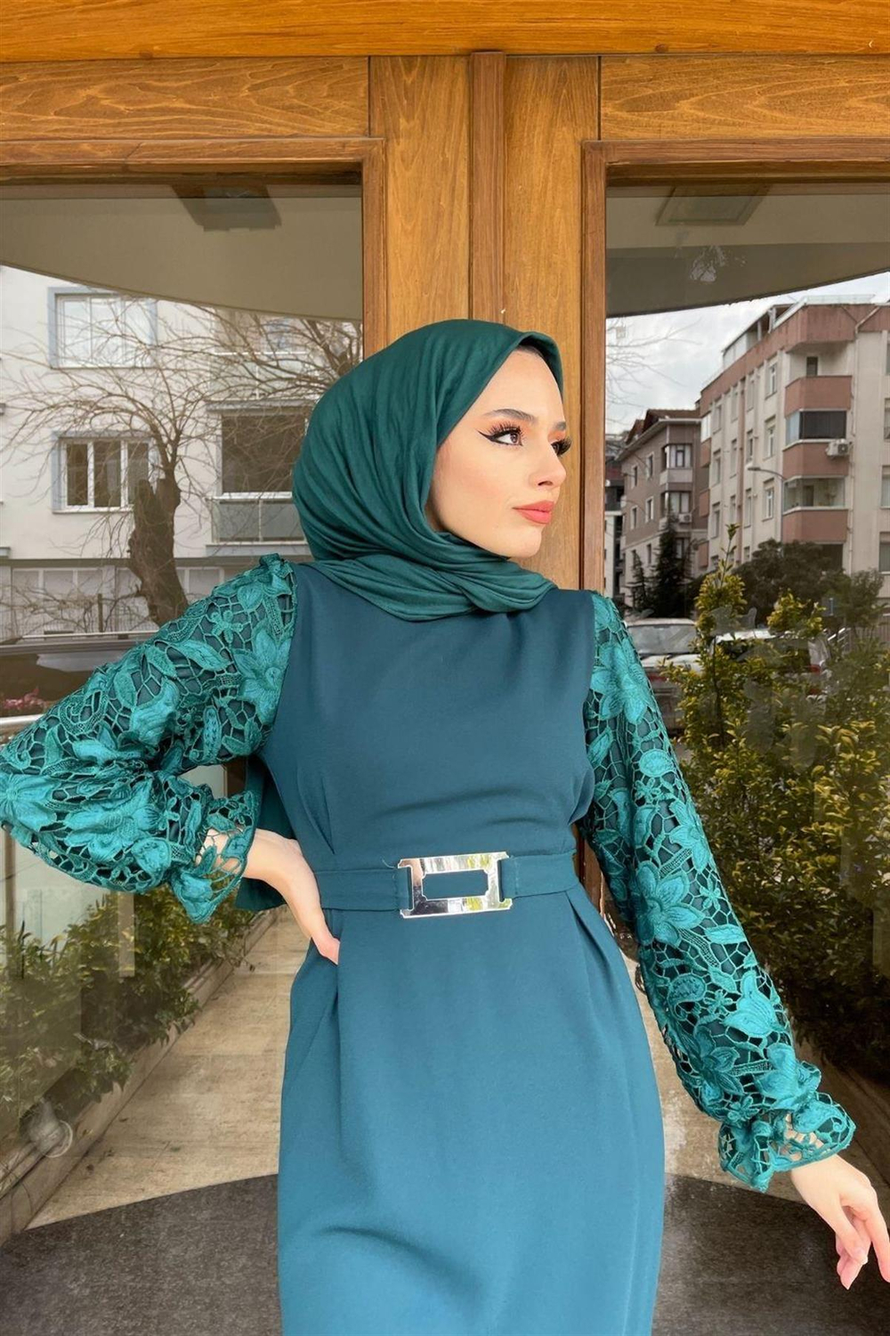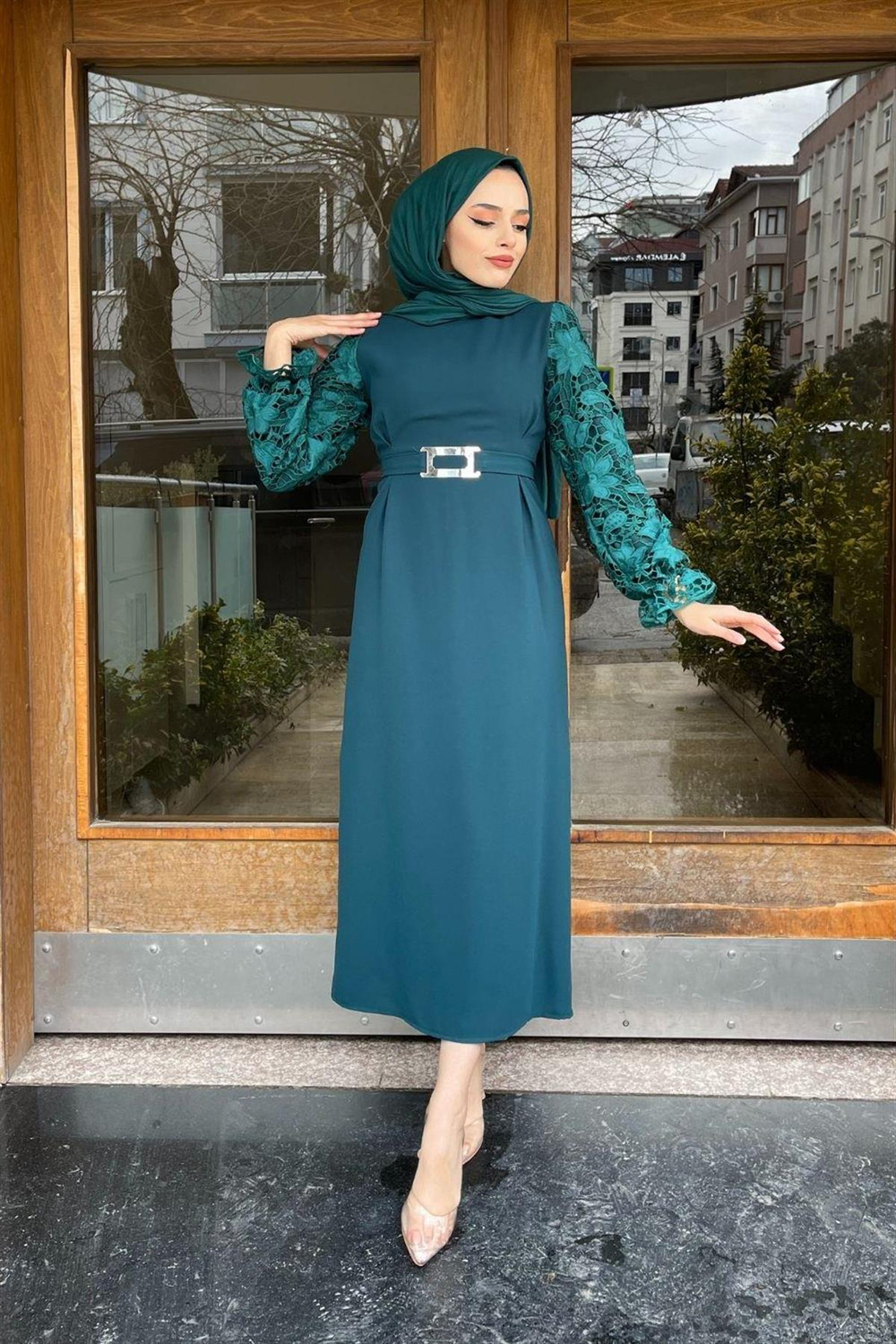 Kolları Dantelli Krep Elbise Zümrüt