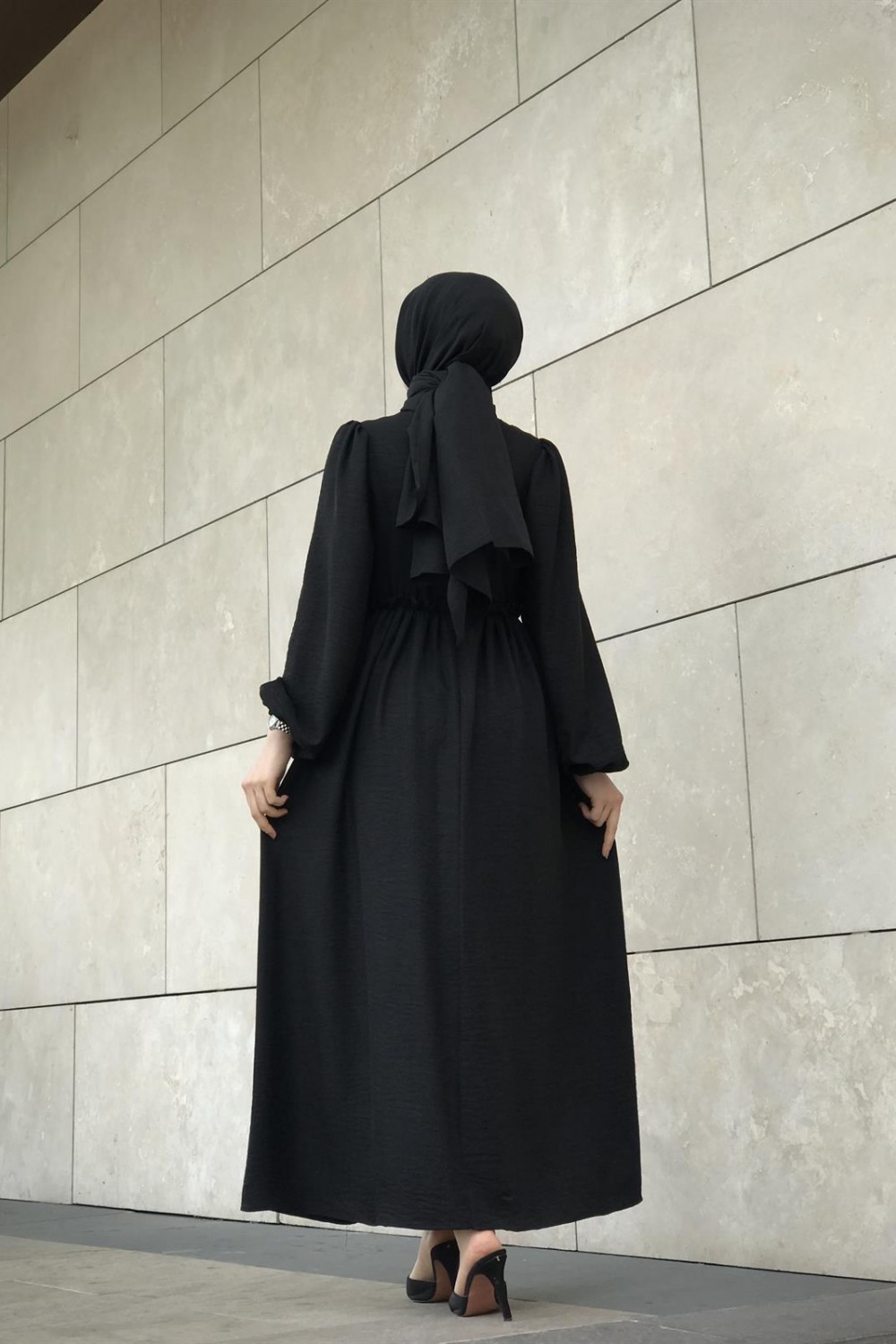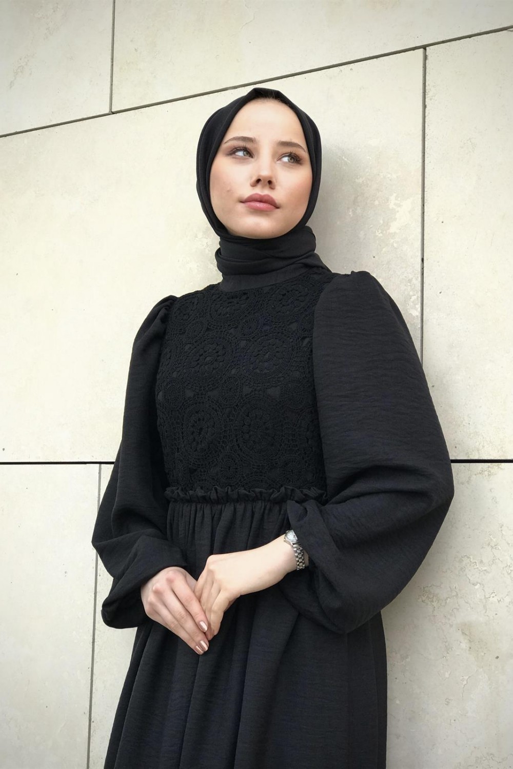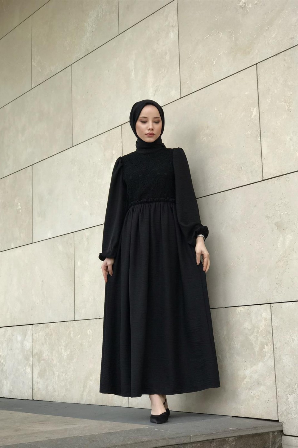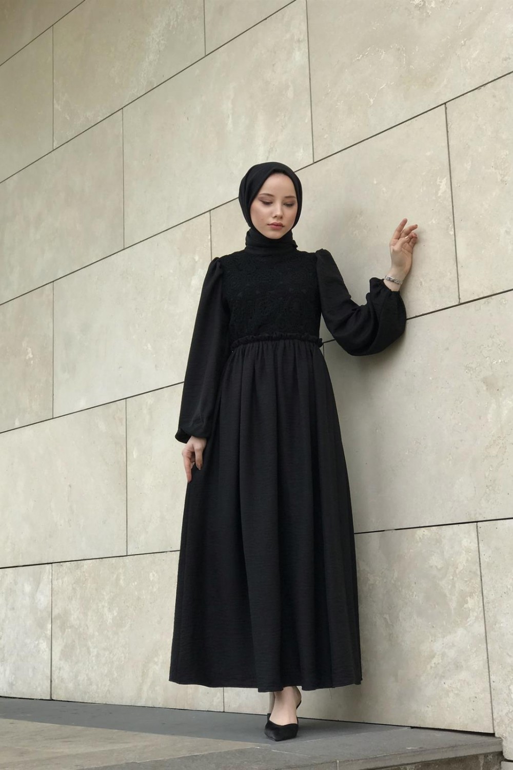 Balon Kol Beli Lastikli Güpür Detay Elbise Siyah