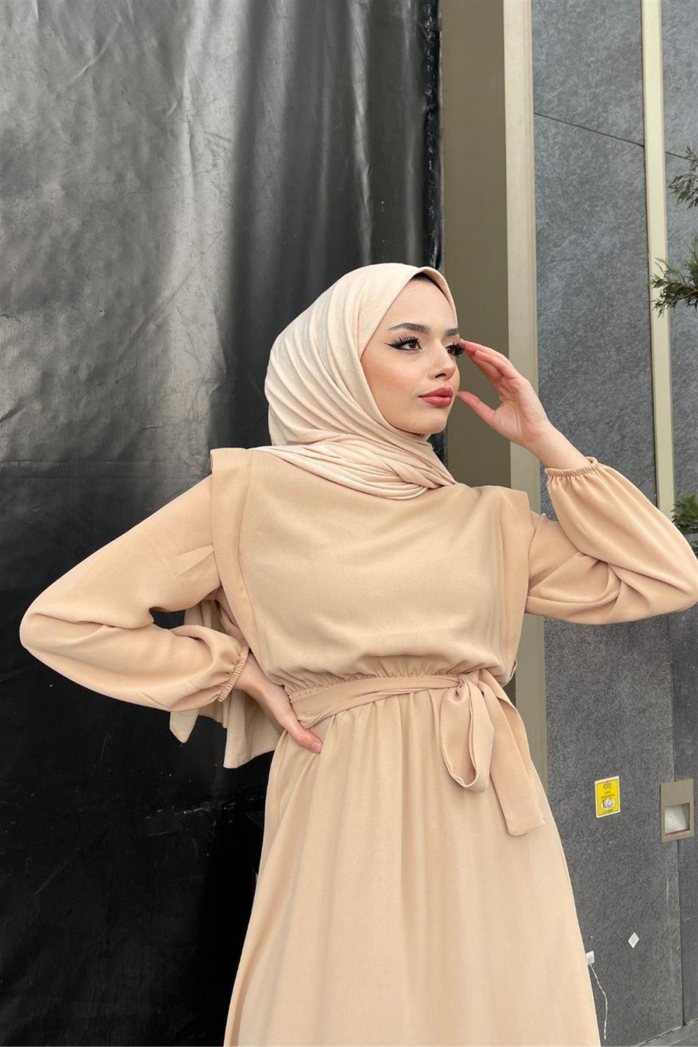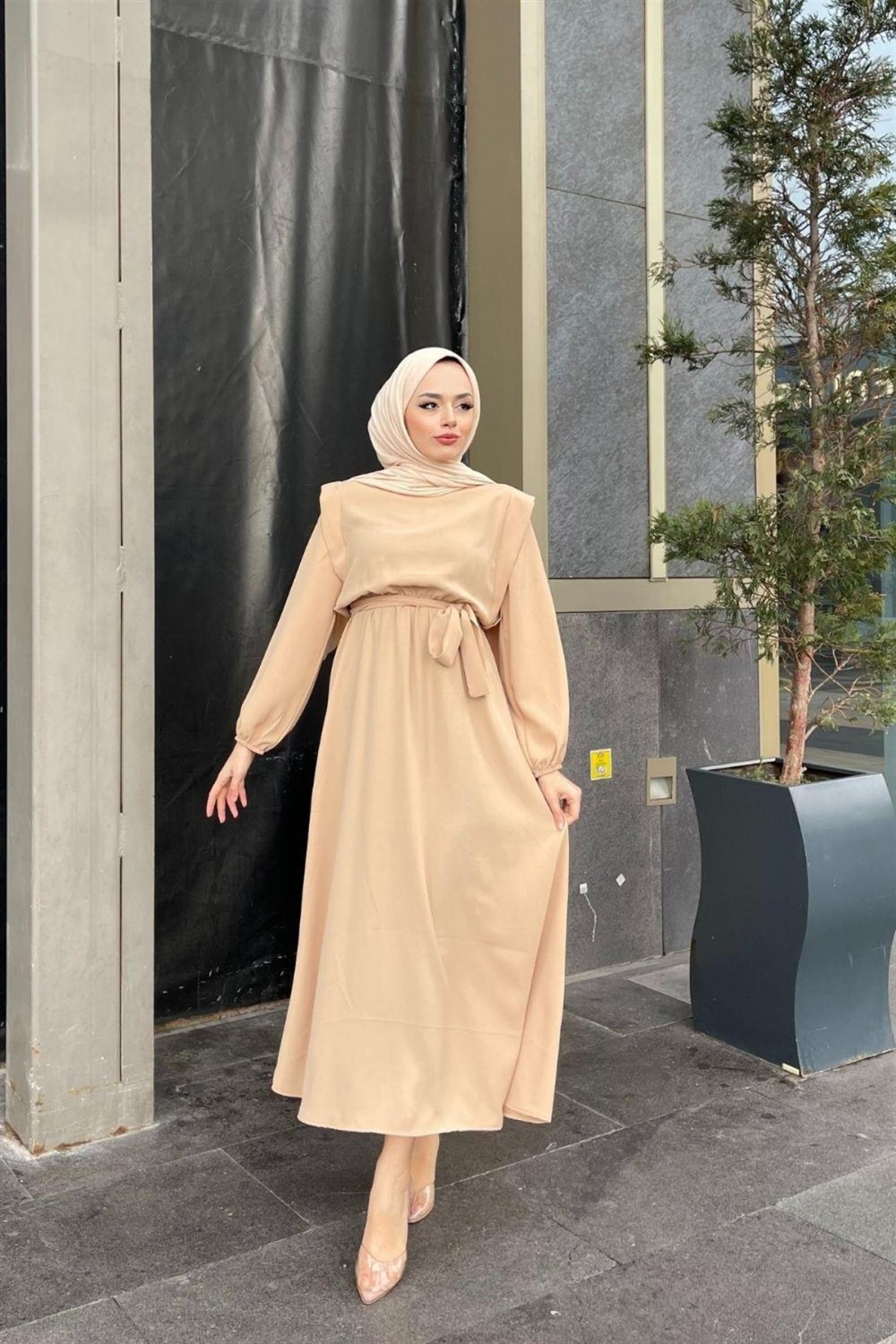Beli Lastikli Omzu Dökümlü Elbise Camel