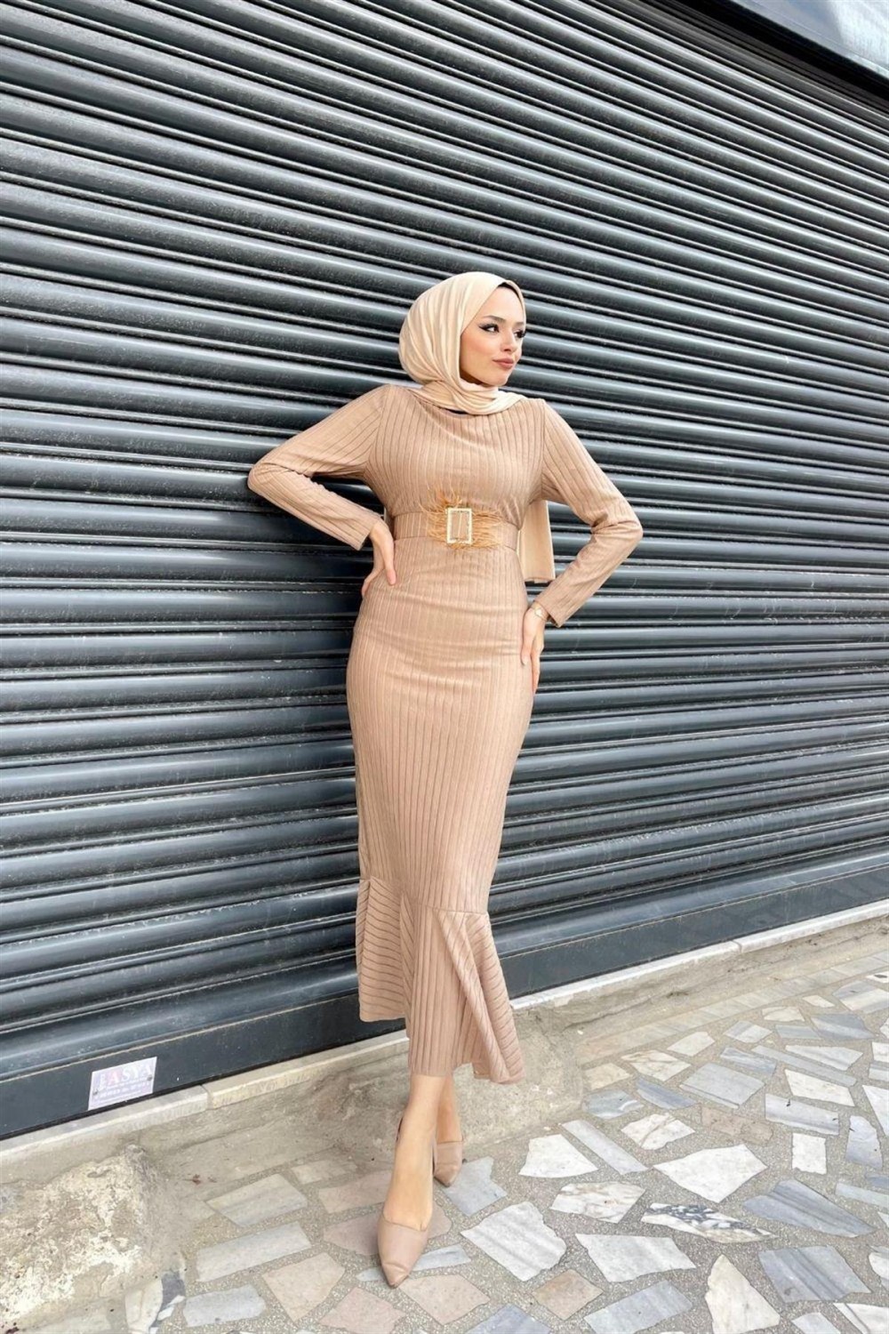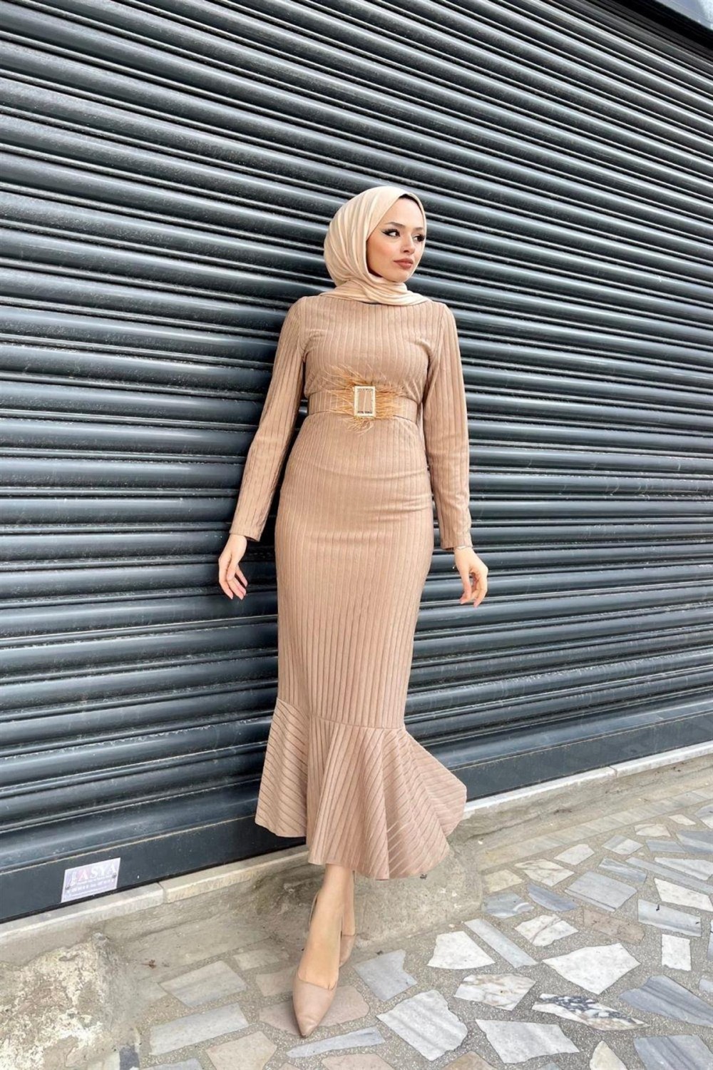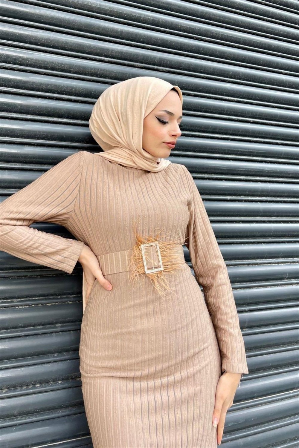 Kemeri Tüylü Kendinden Çizgili Elbise Camel