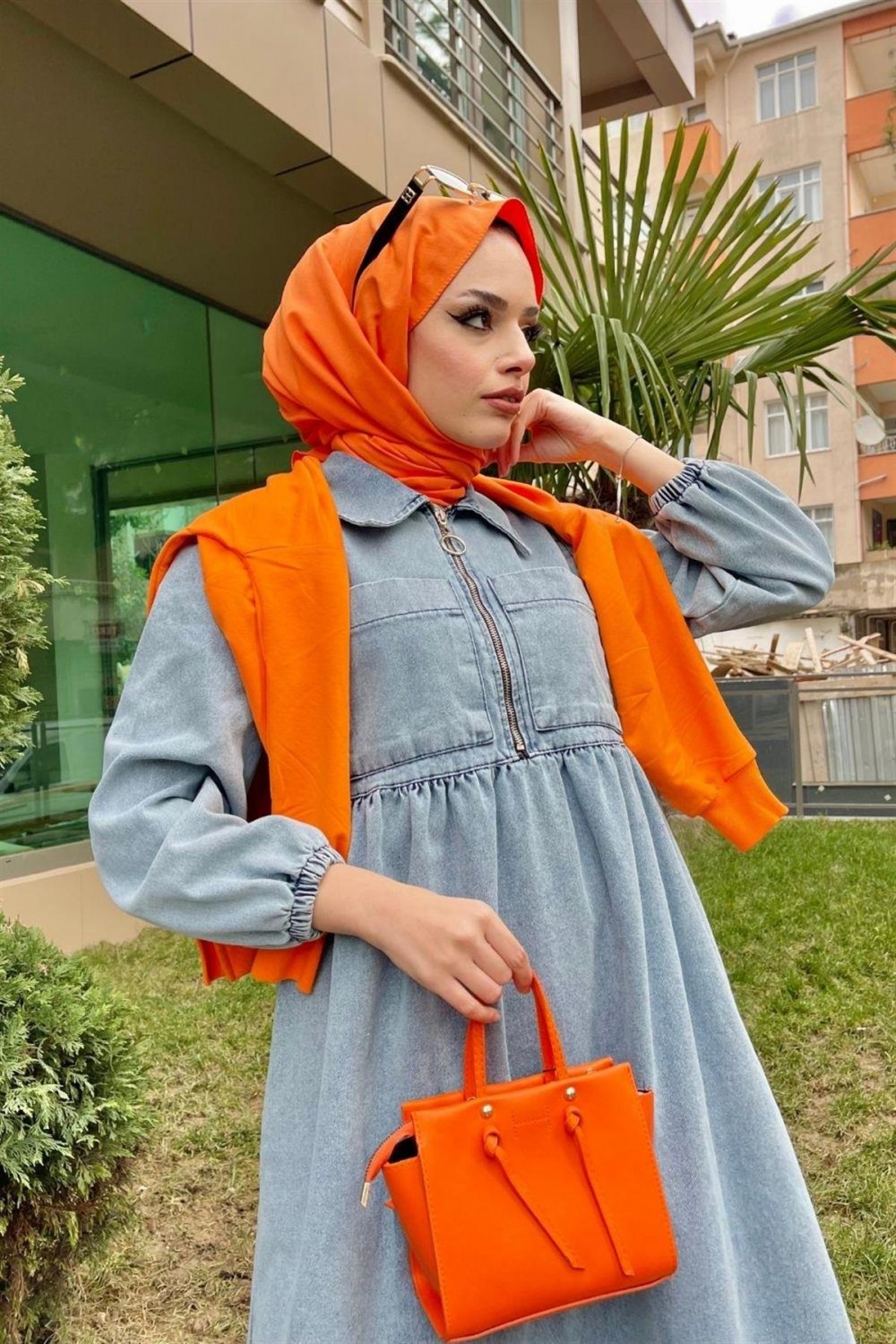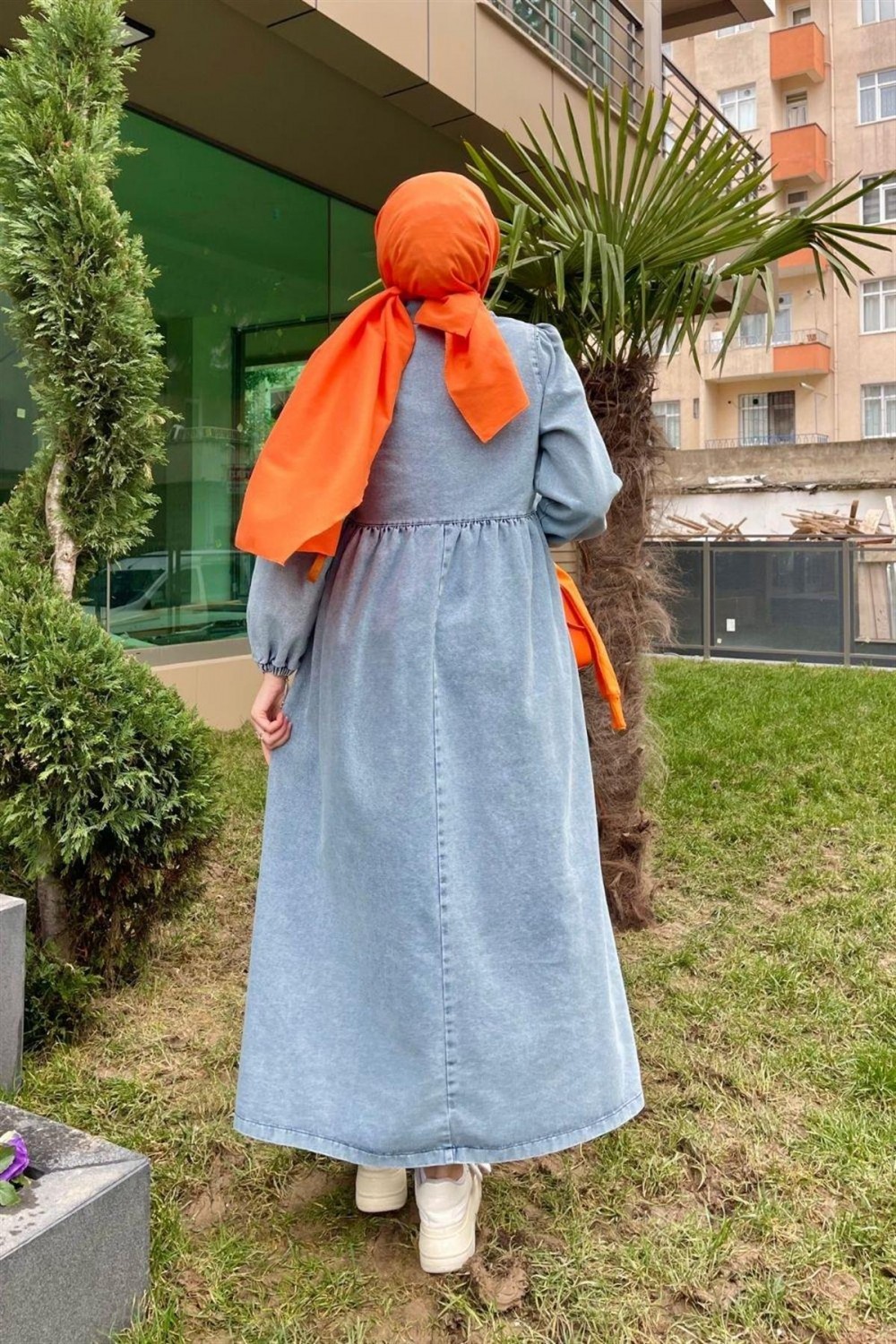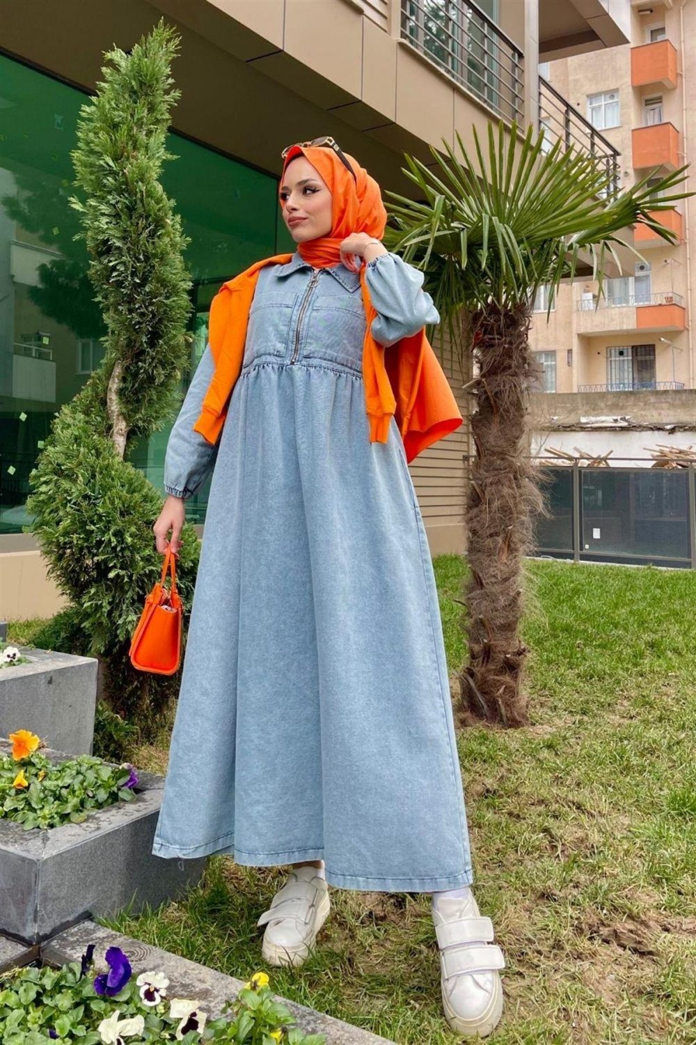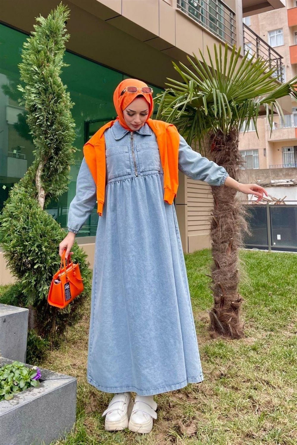 İki Cepli Fermuarlı Kot Elbise Mavi