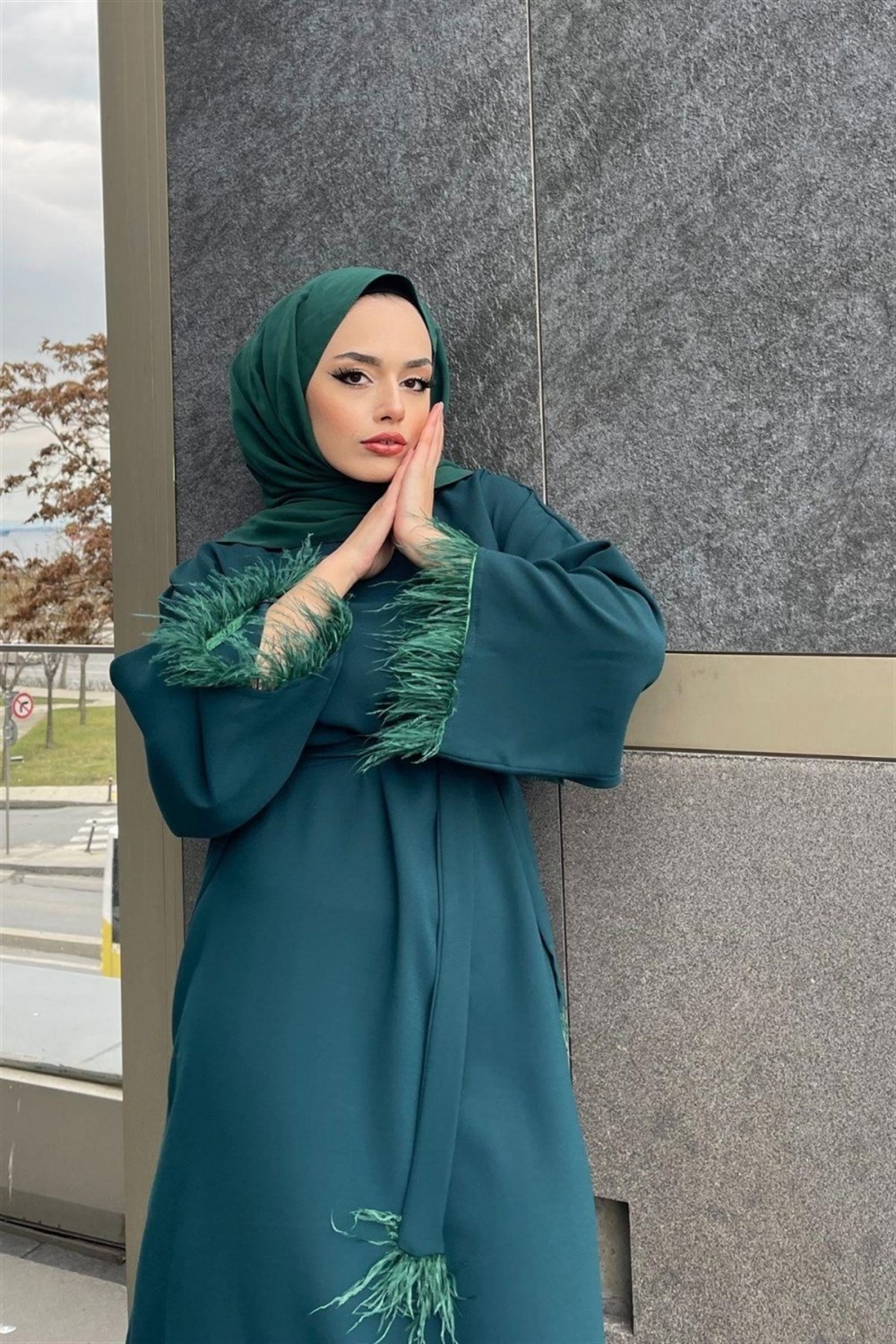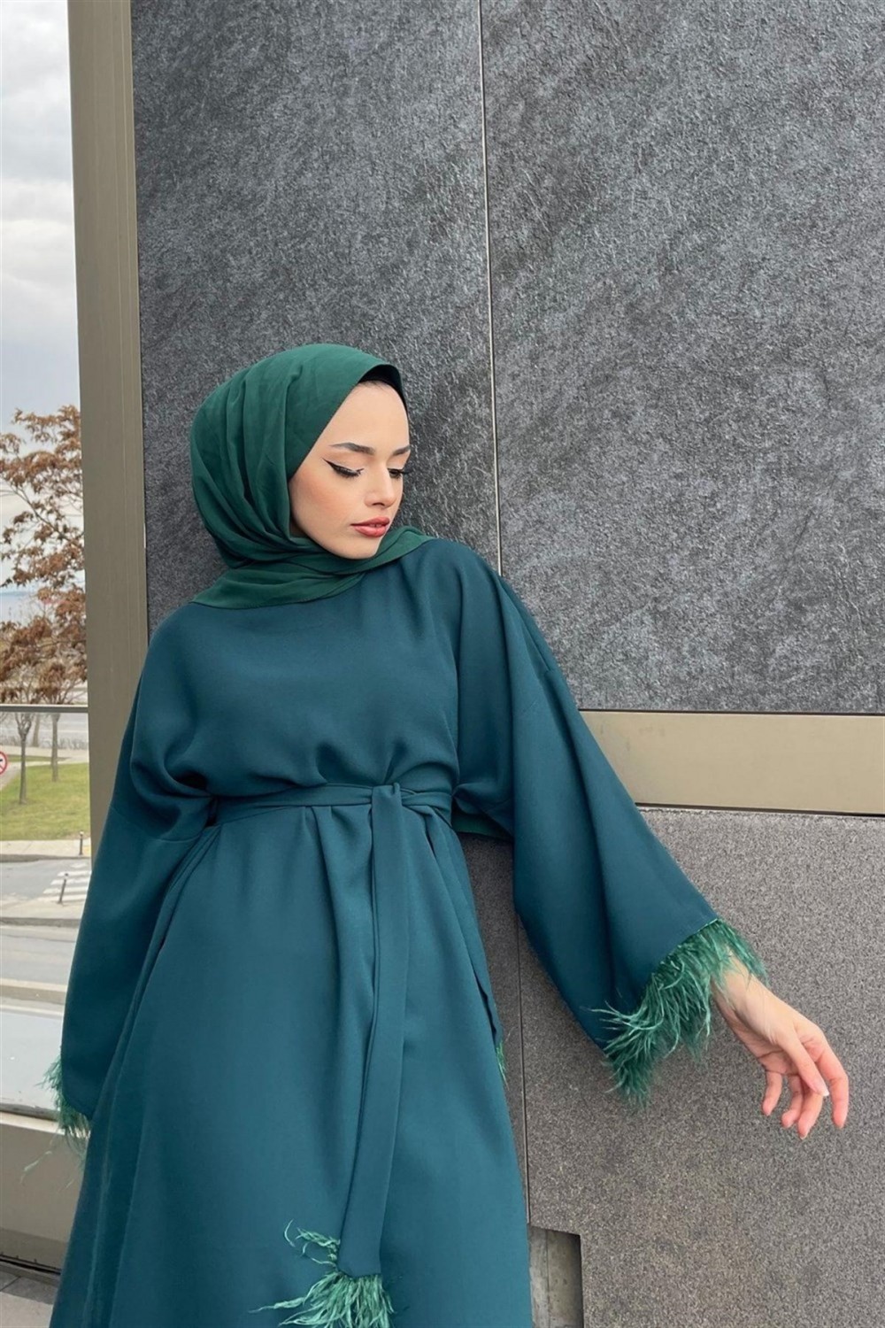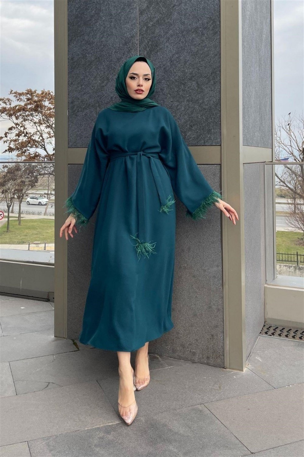 Kolları Tüylü Kuşaklı Elbise Zümrüt