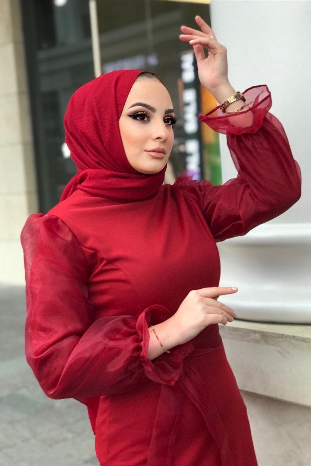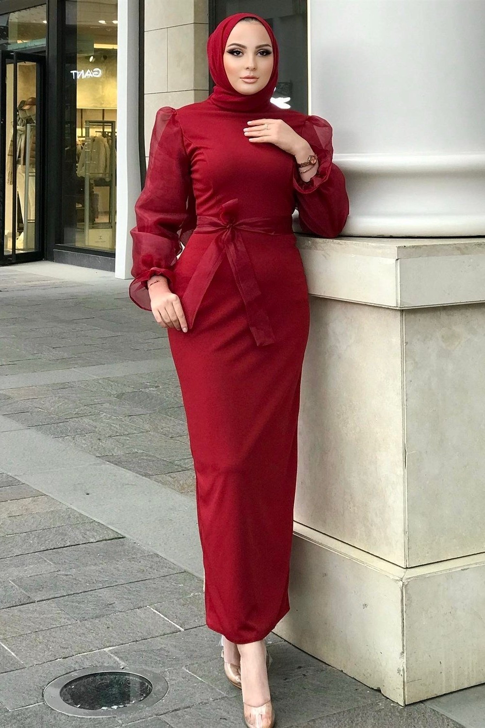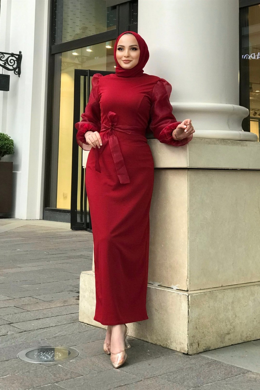 Kolu Tül Detaylı Kalem Elbise Kırmızı