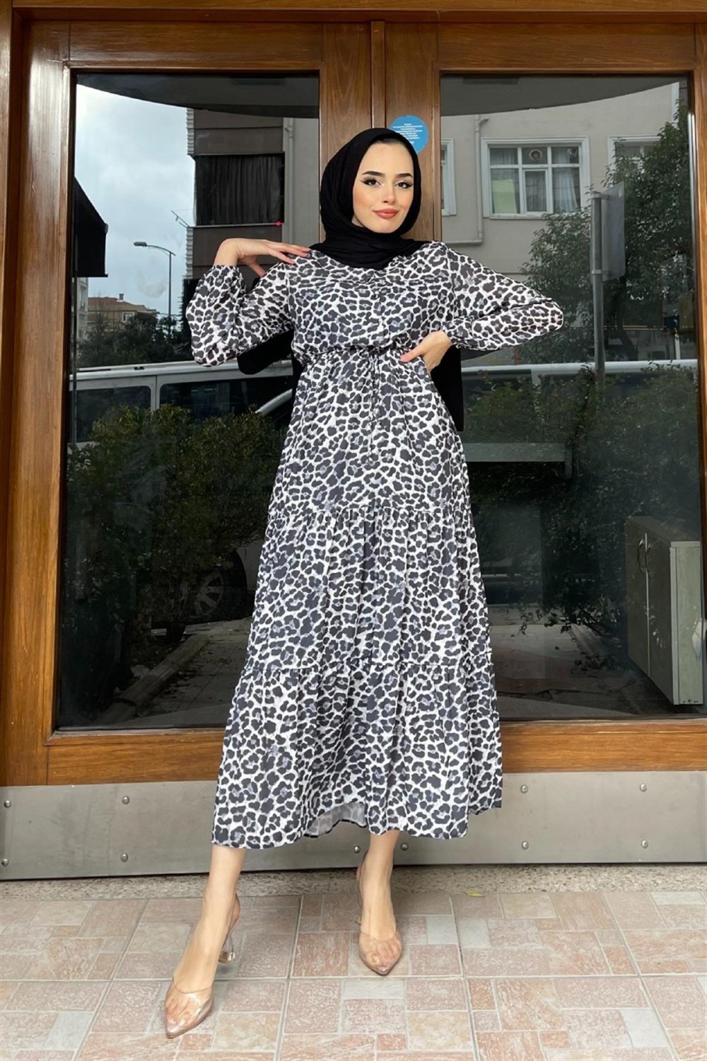 Leopar Desen Beli Sıkmalı Elbise Siyah