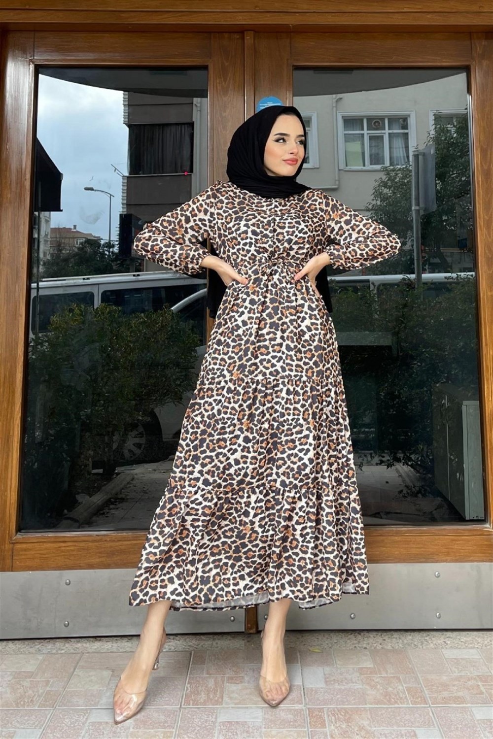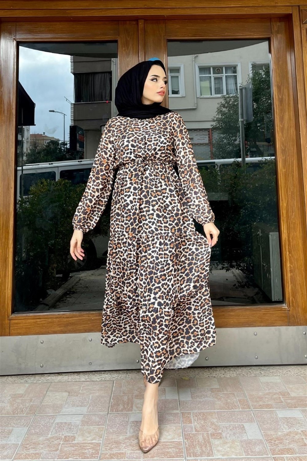 Leopar Desen Beli Sıkmalı Elbise Kahverengi