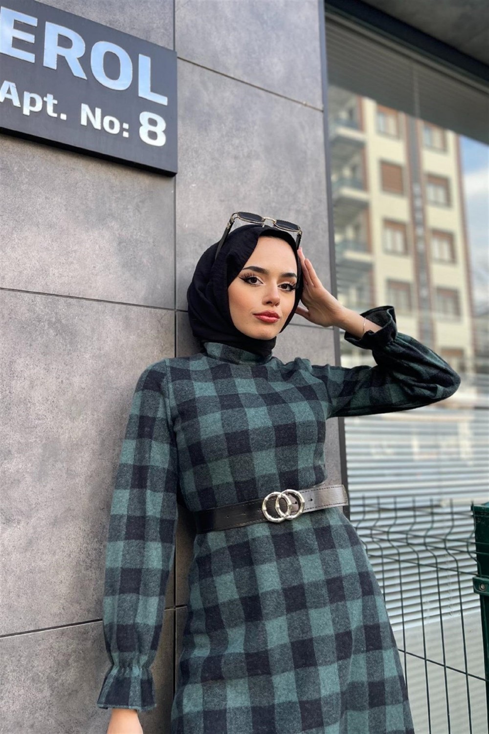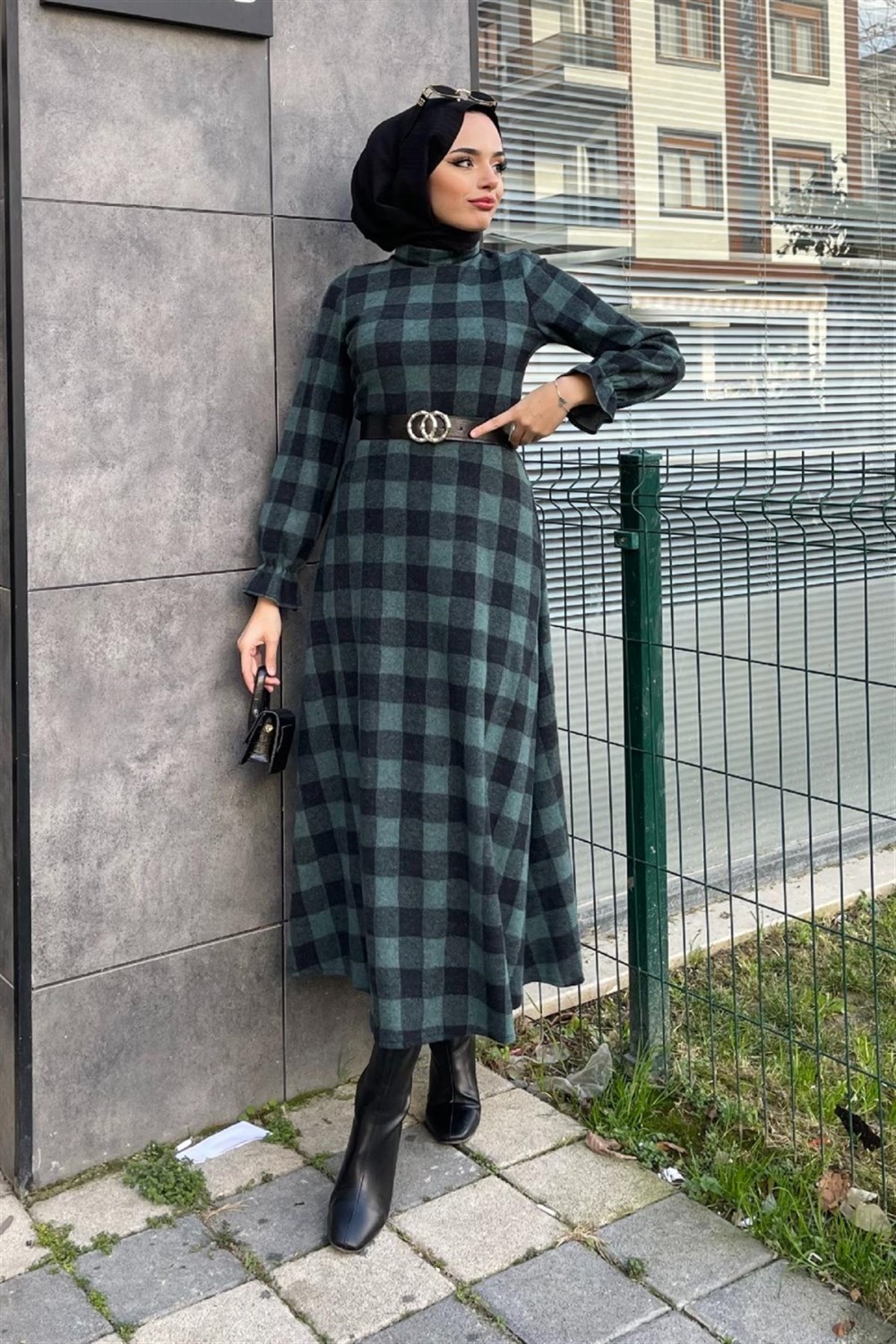 Kolu Lastikli Kemerli Kareli Elbise Yeşil