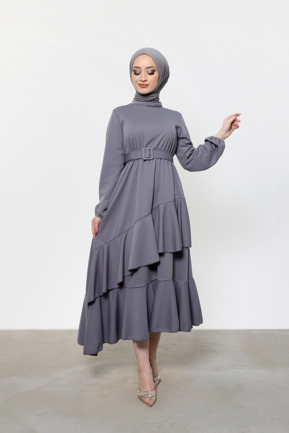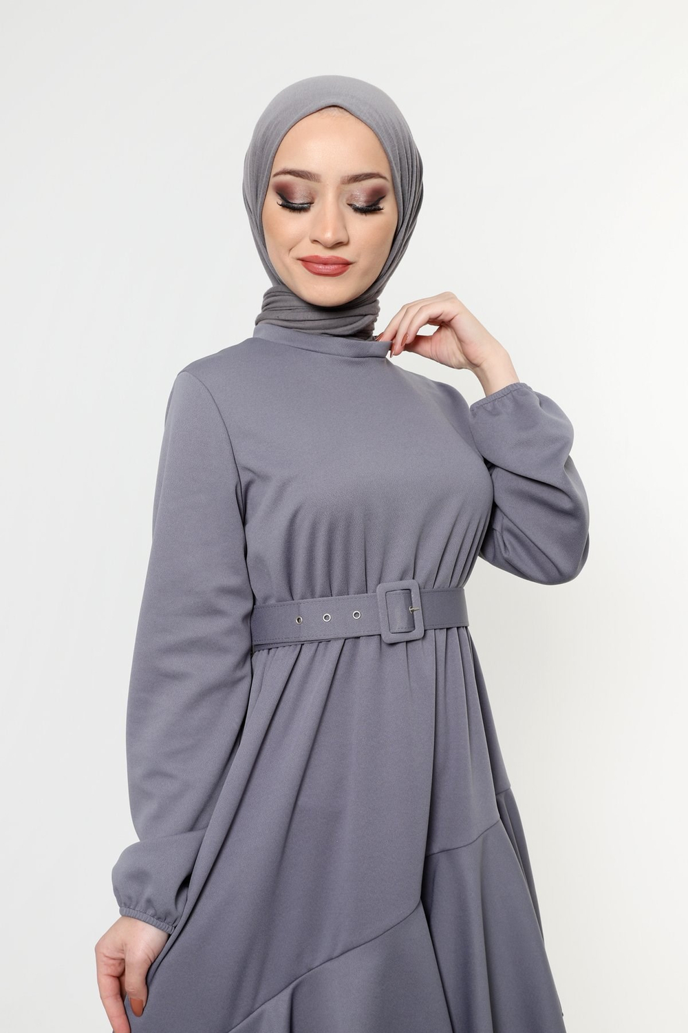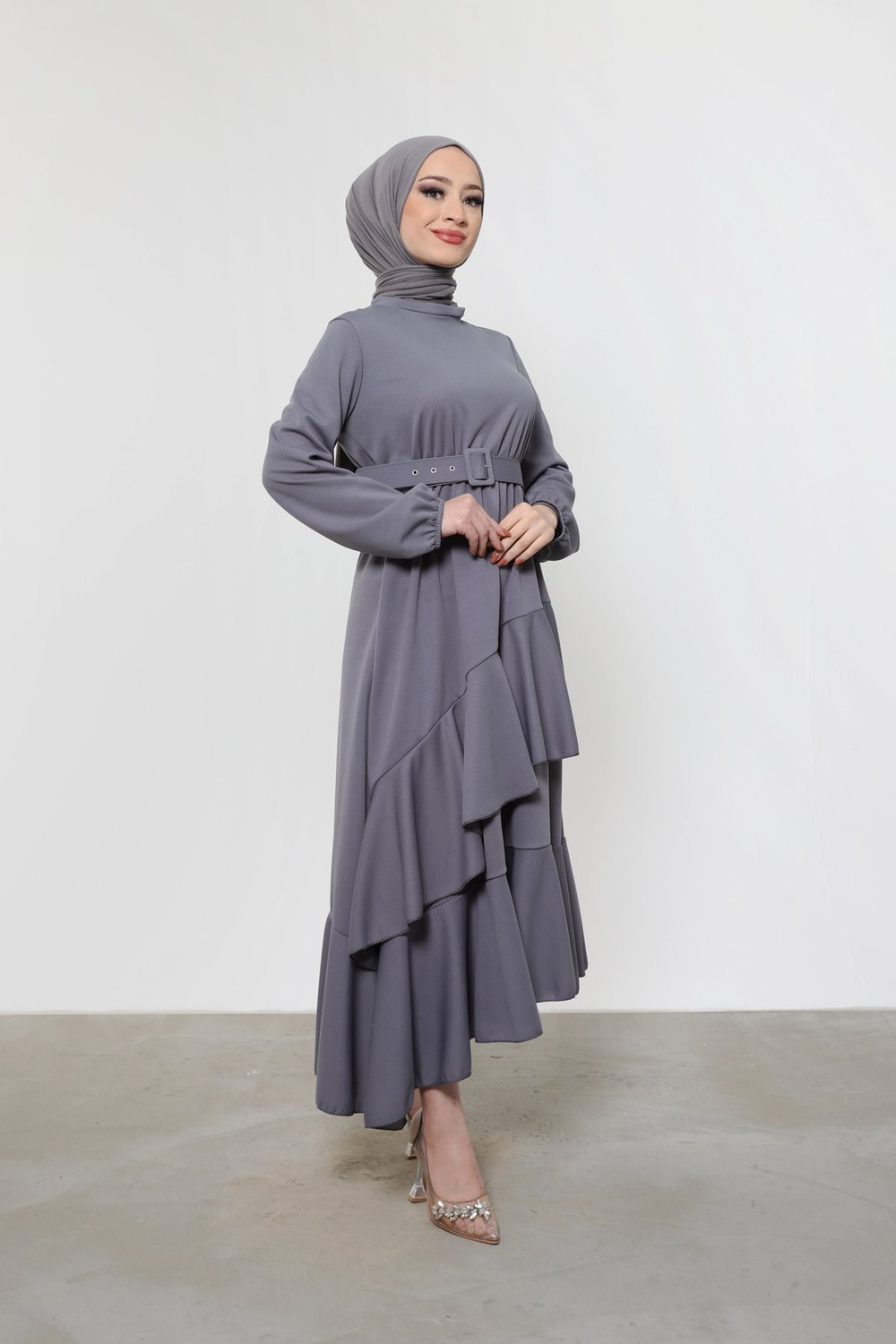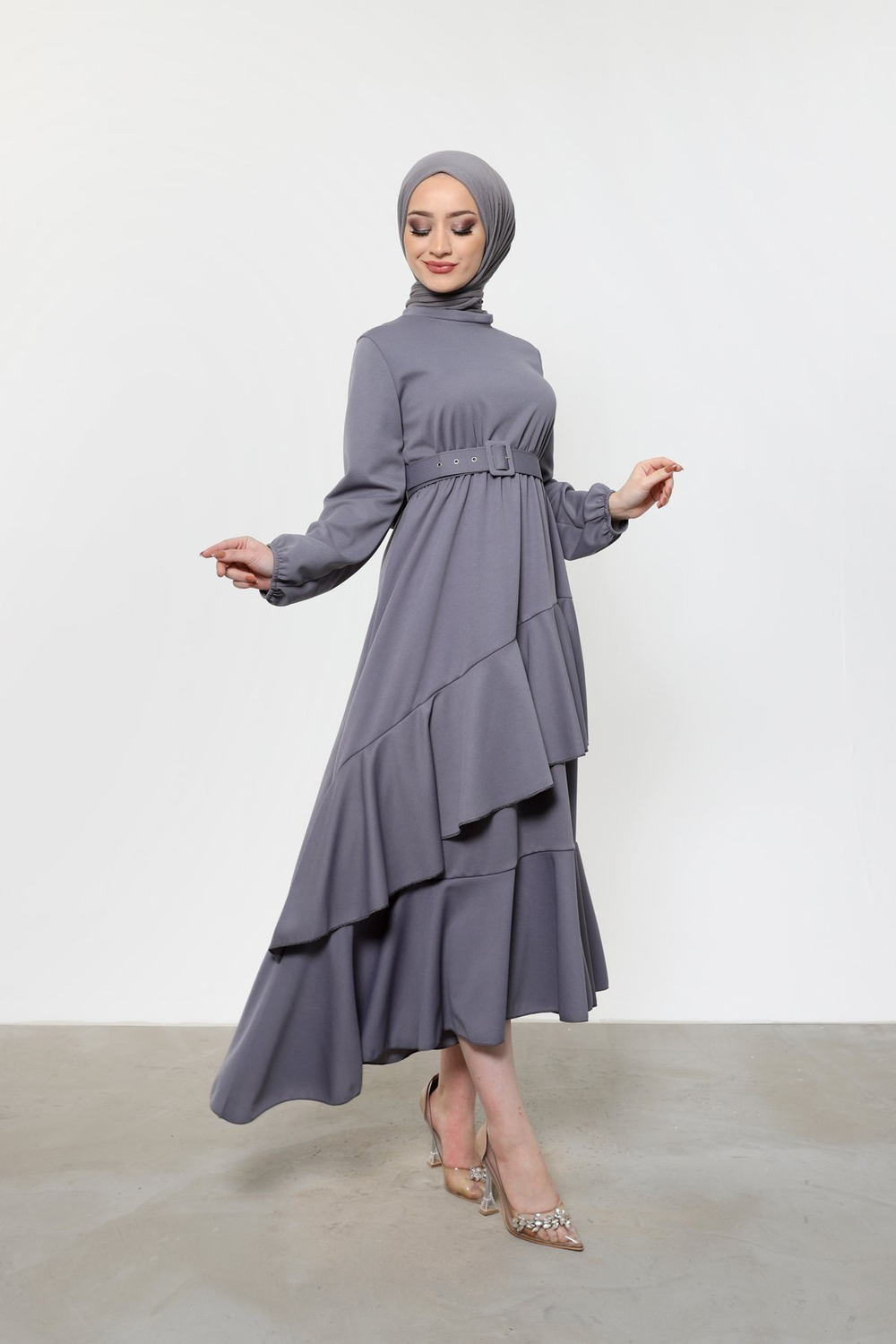 Altı Fırfır Detaylı Kemerli Elbise Gri