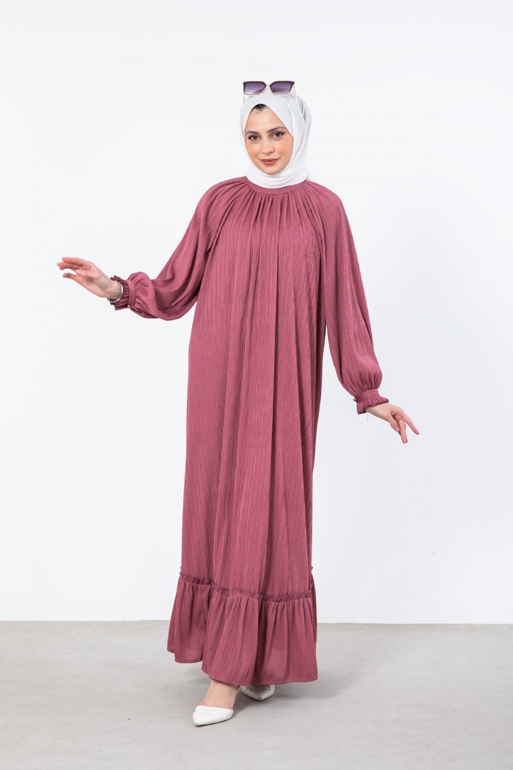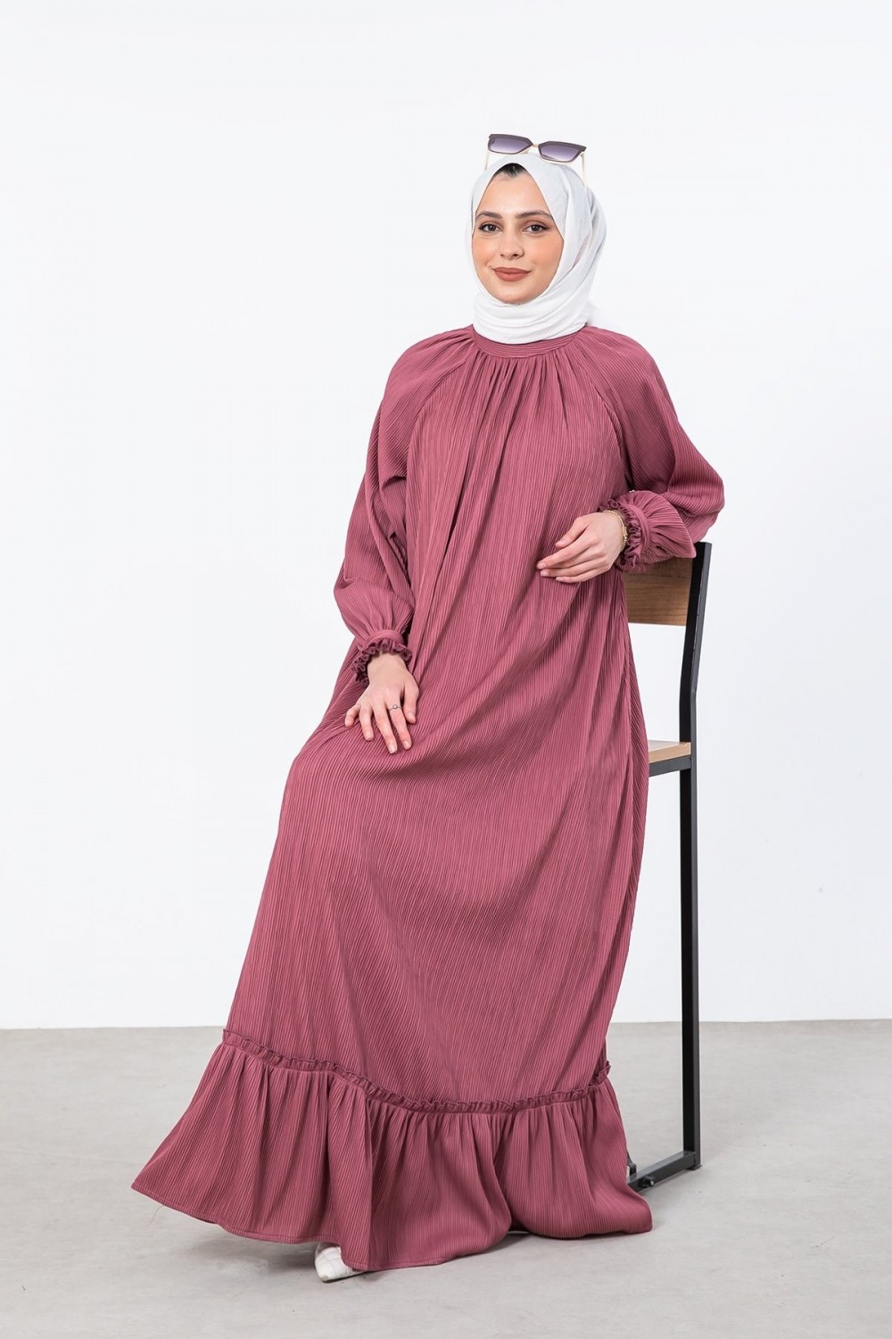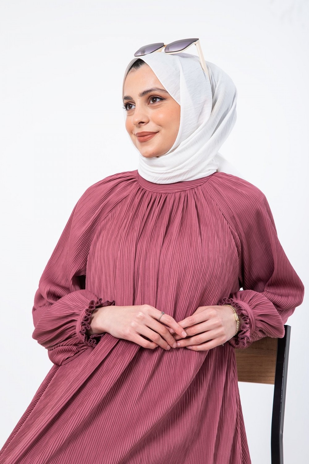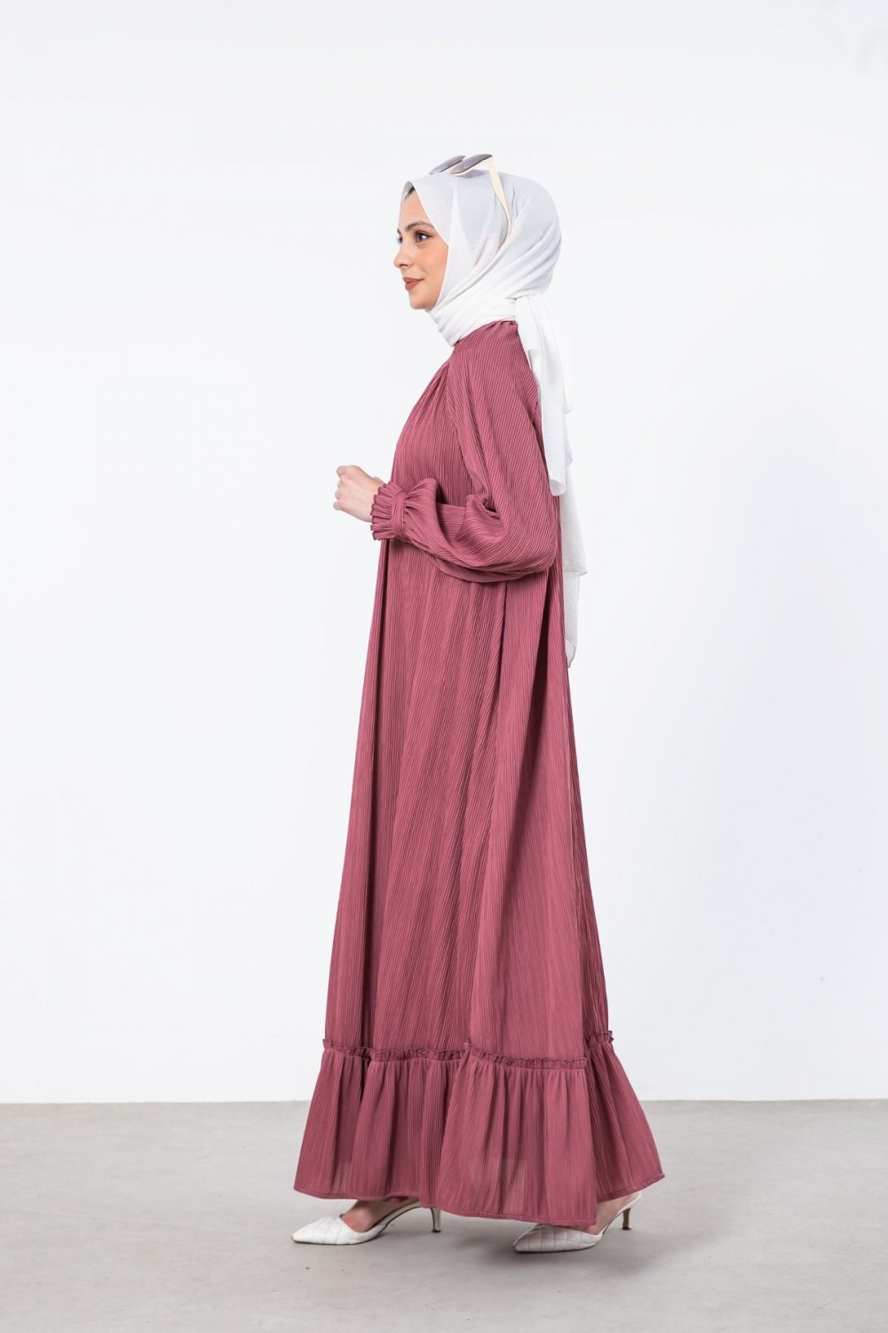 Sık Pileli Kemerli Elbise Gül Kurusu