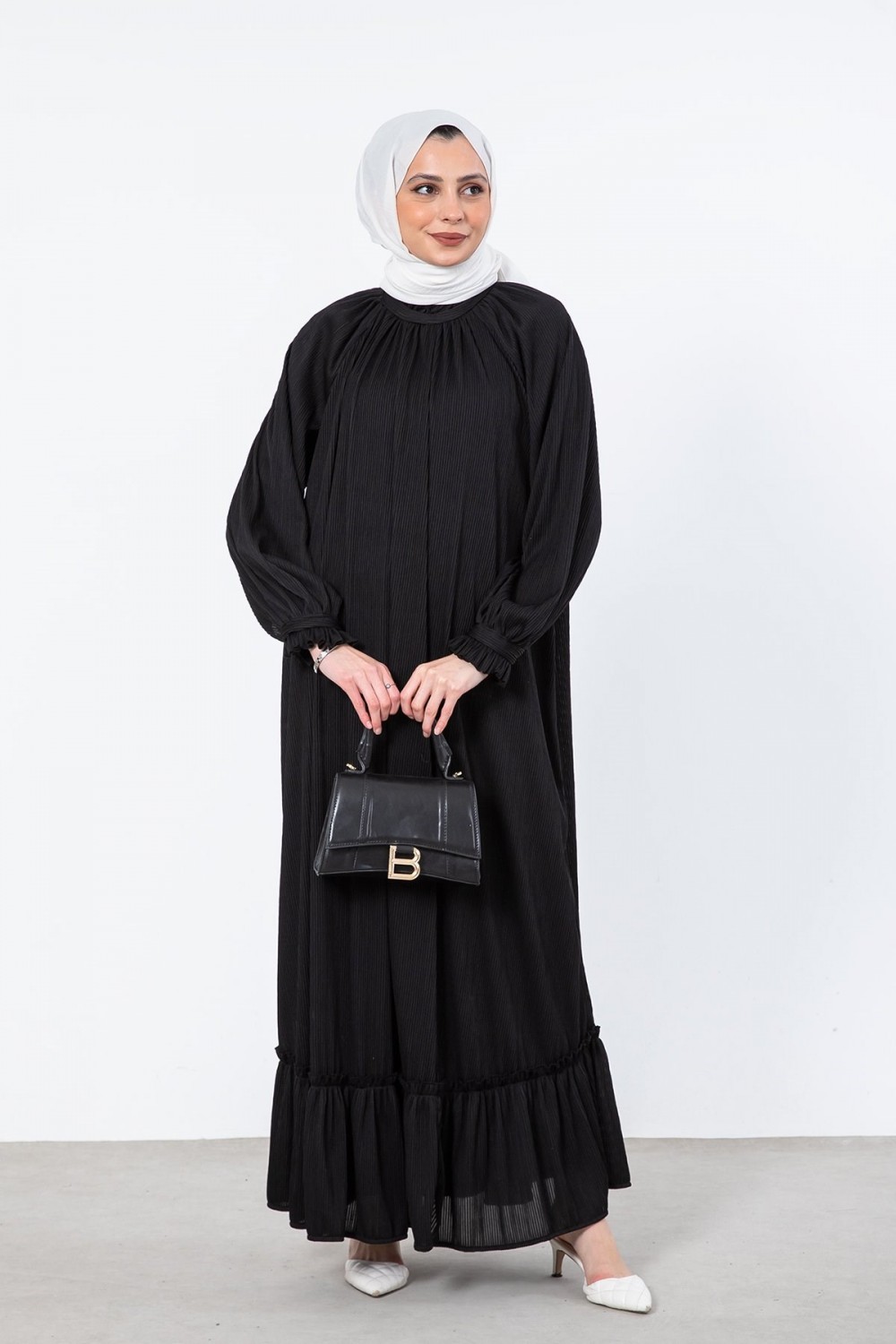 Sık Pileli Kemerli Elbise Siyah