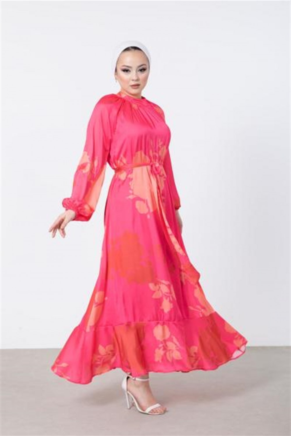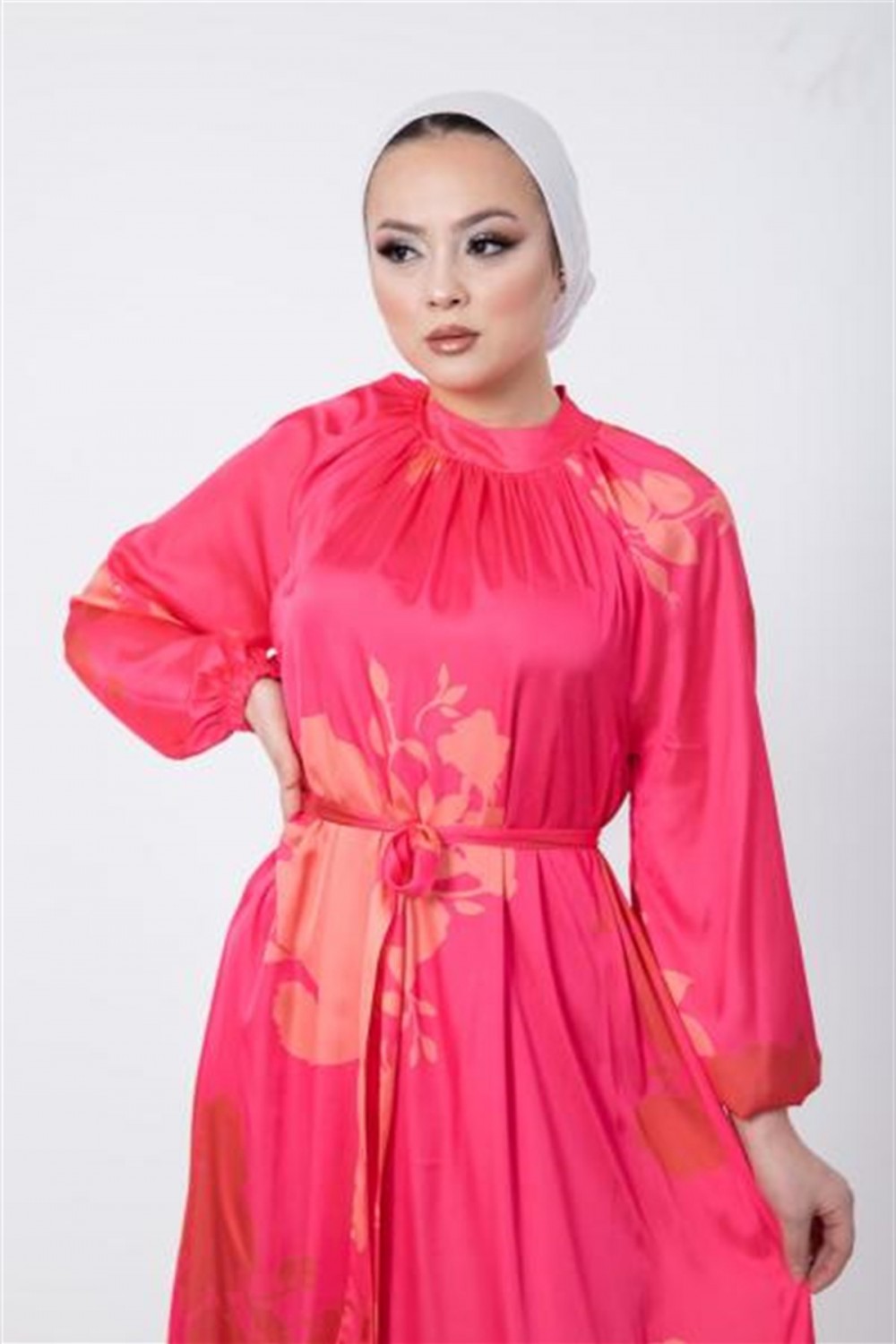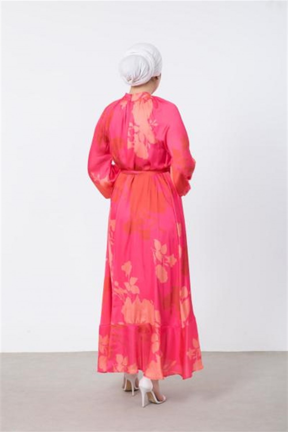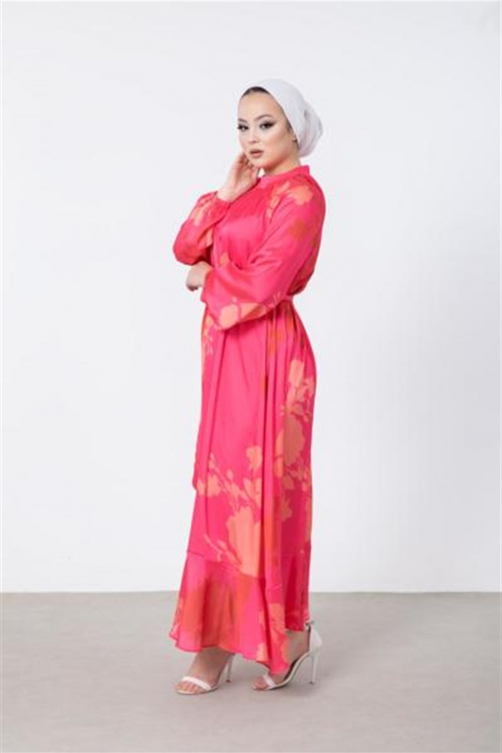 Çiçek Desenli Saten Elbise Pembe