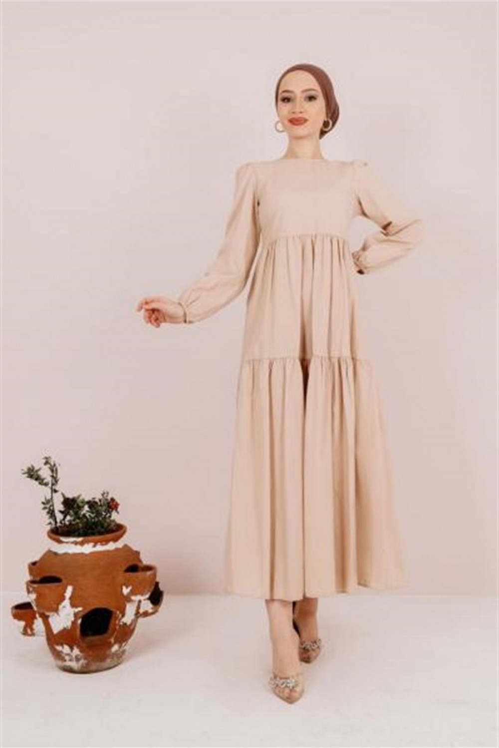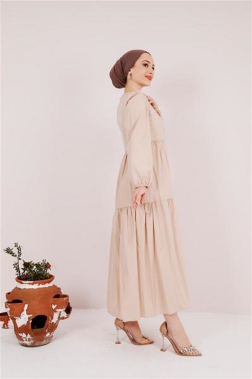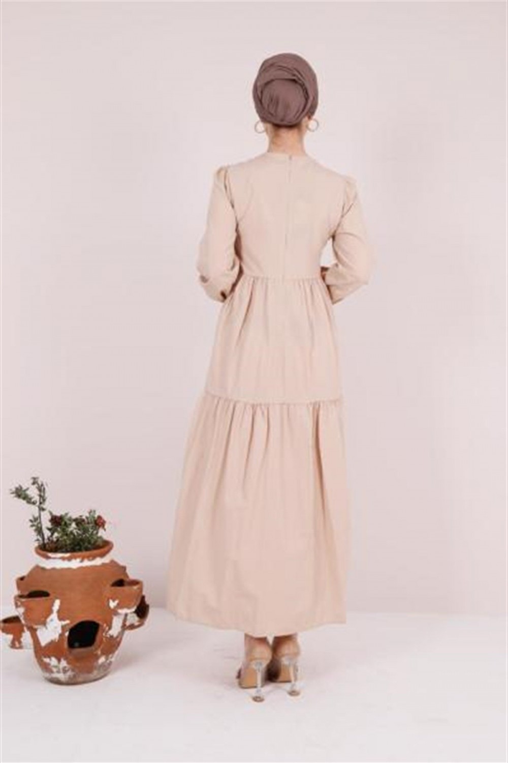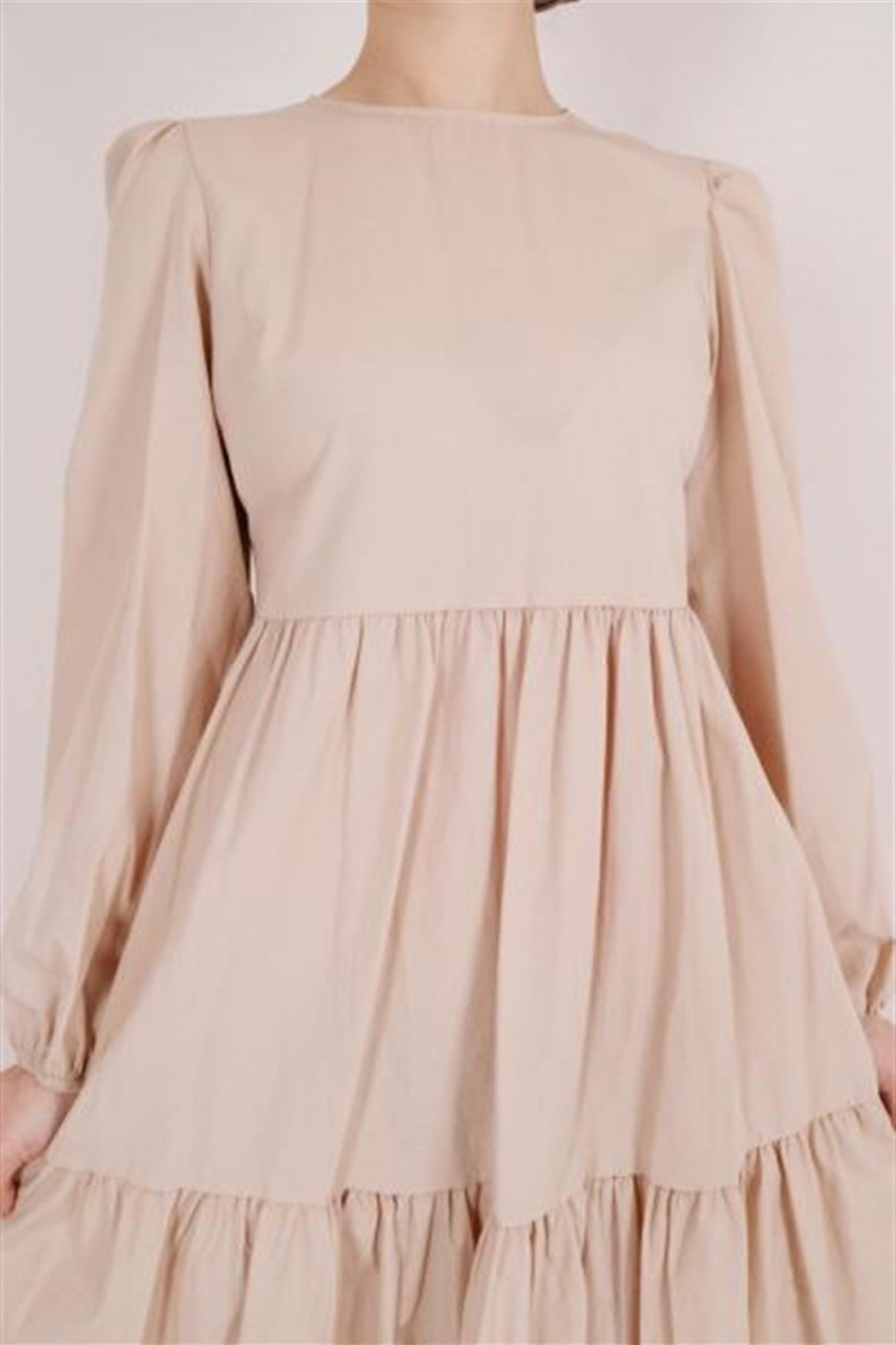 Balon Kol Poplin Elbise Taş