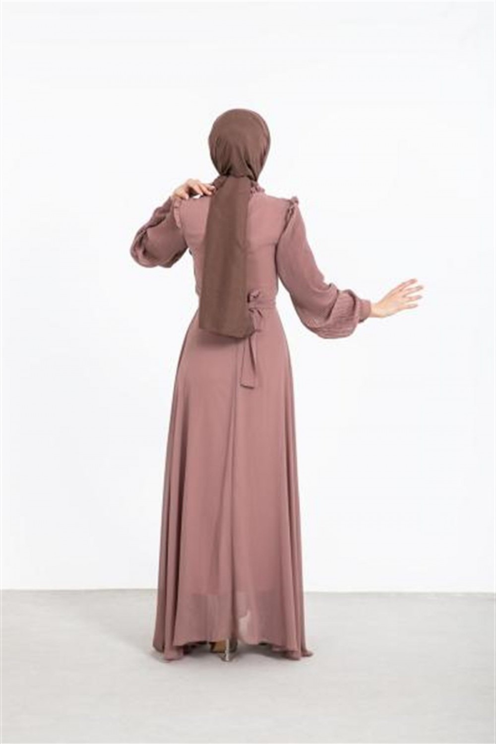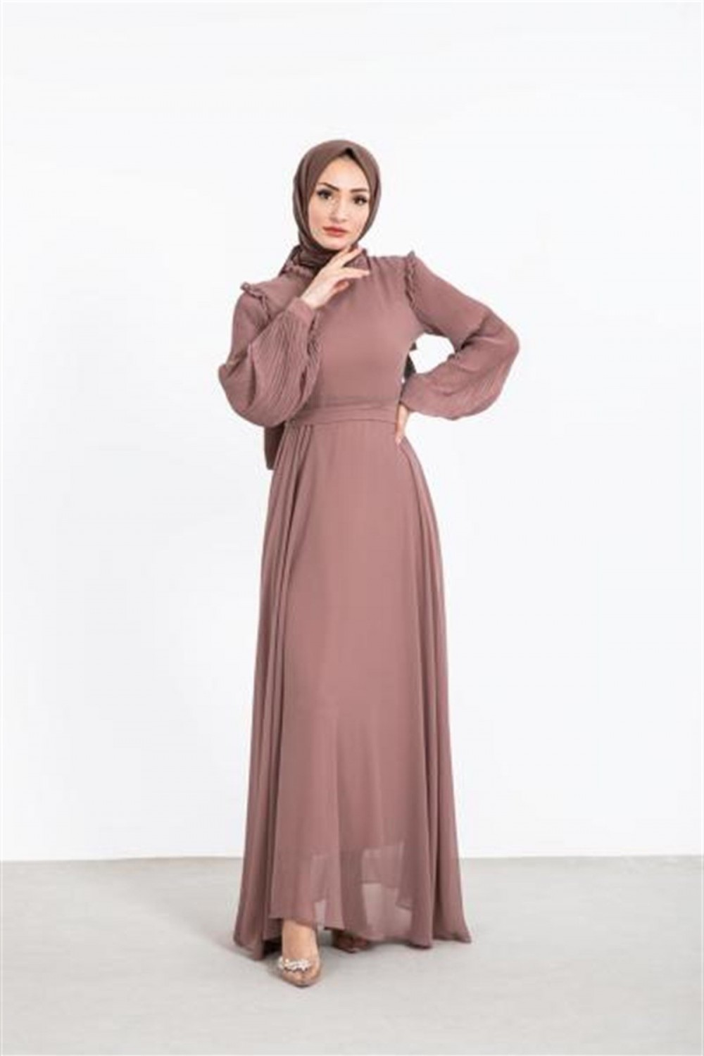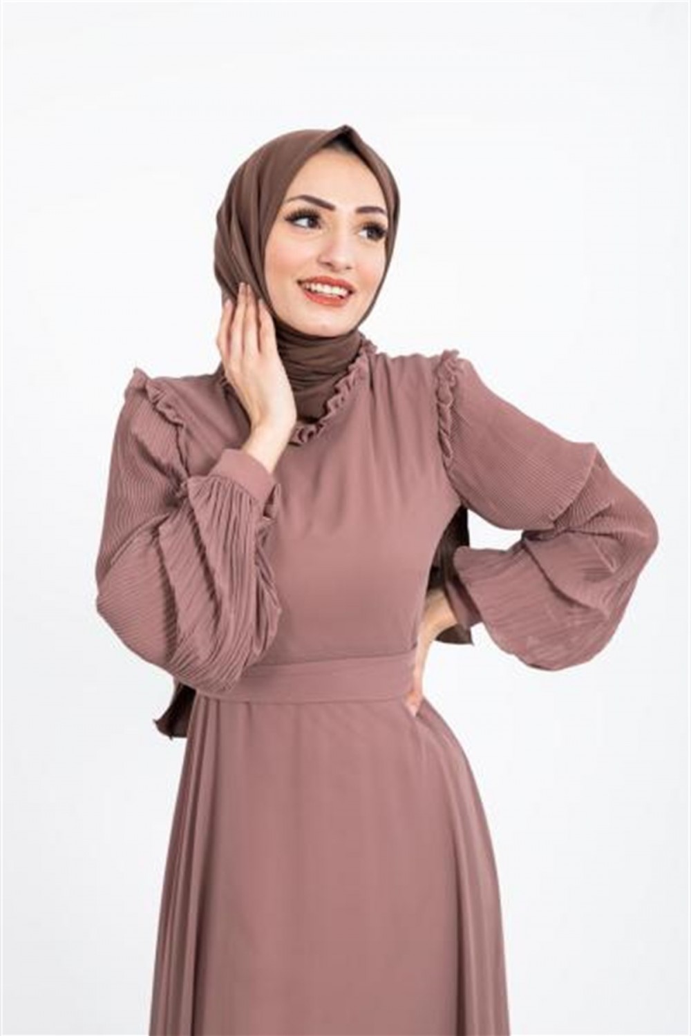Kolları Pileli Kuşaklı Şifon Elbise Kahverengi