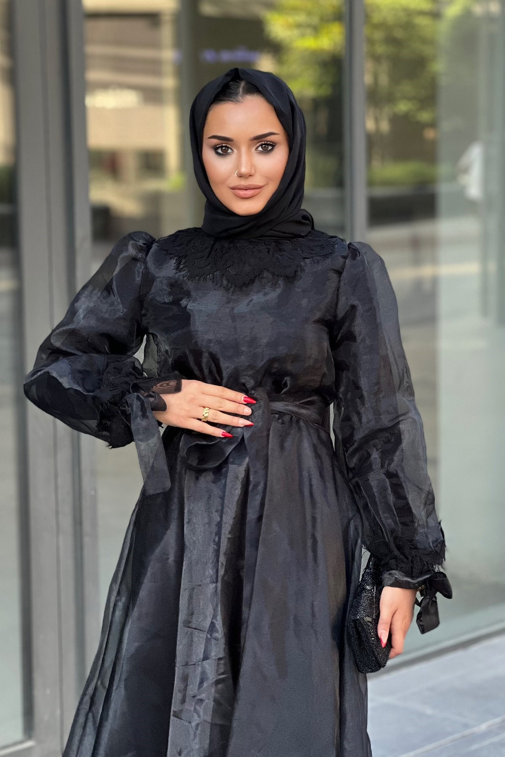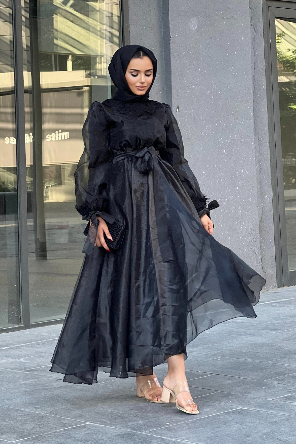 Yakası ve Kolu Dantelli Tül Abiye Siyah