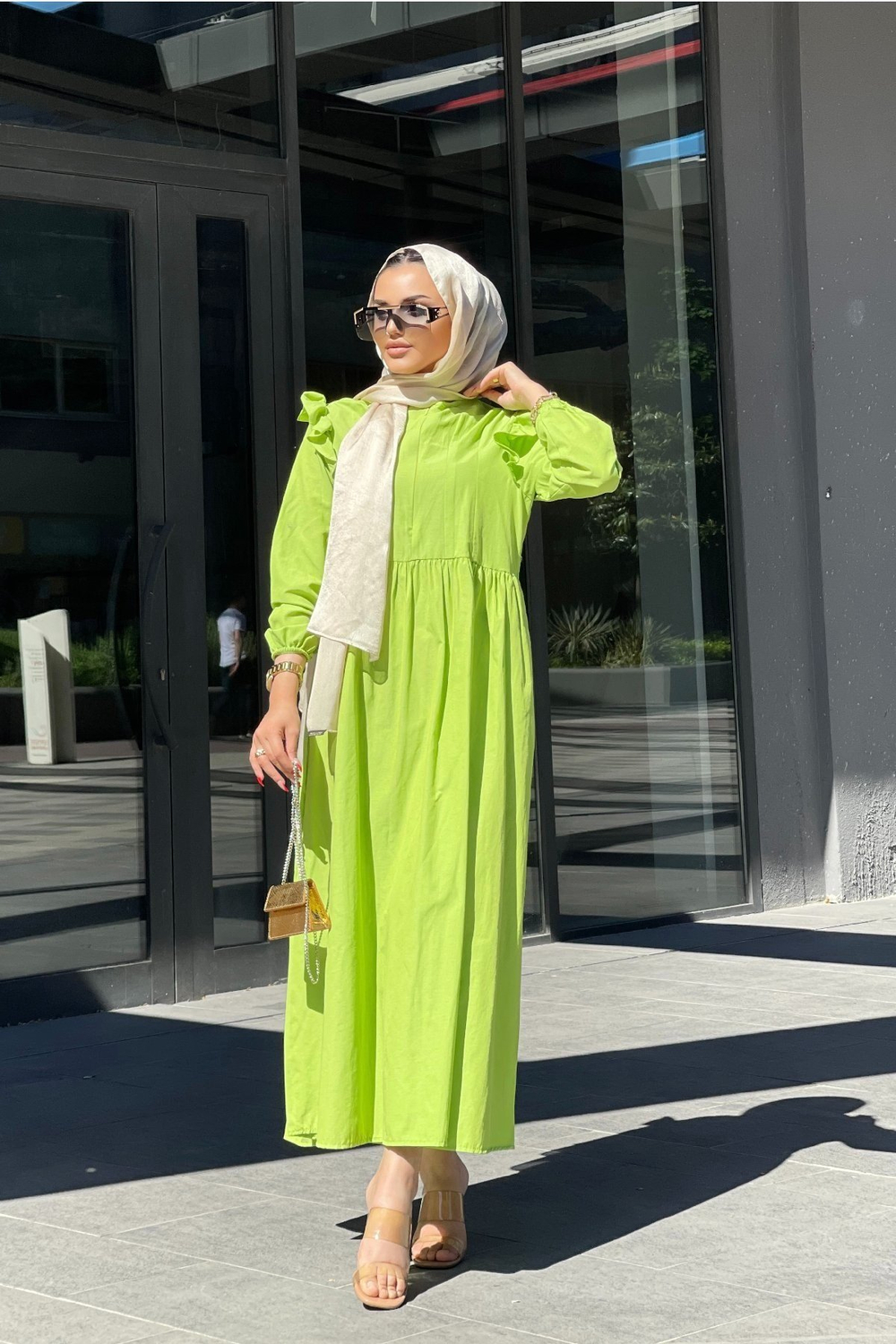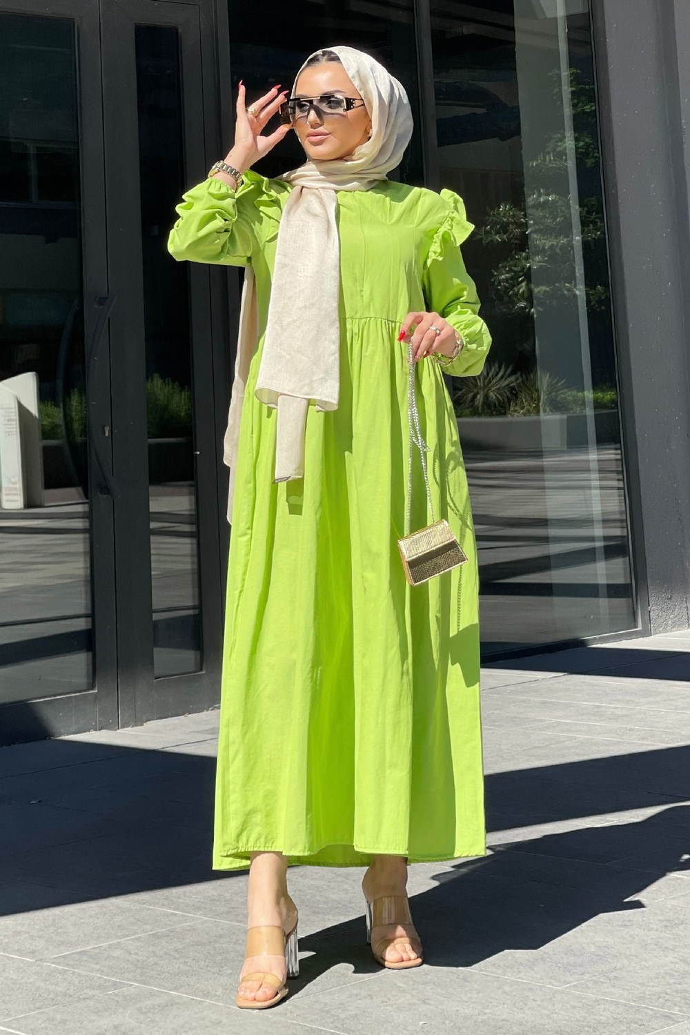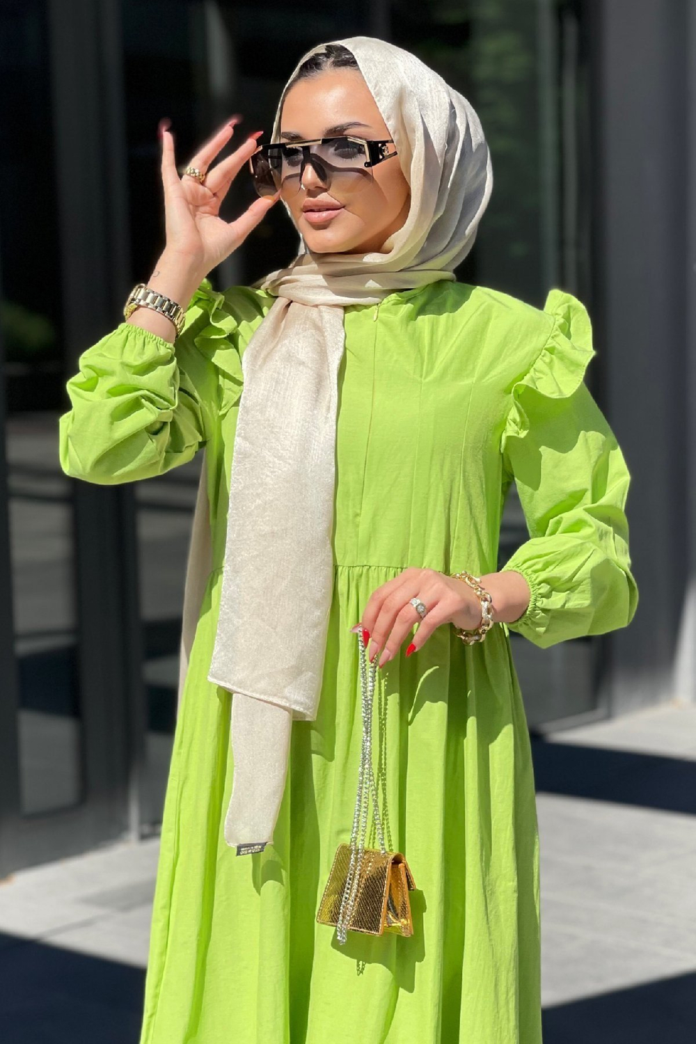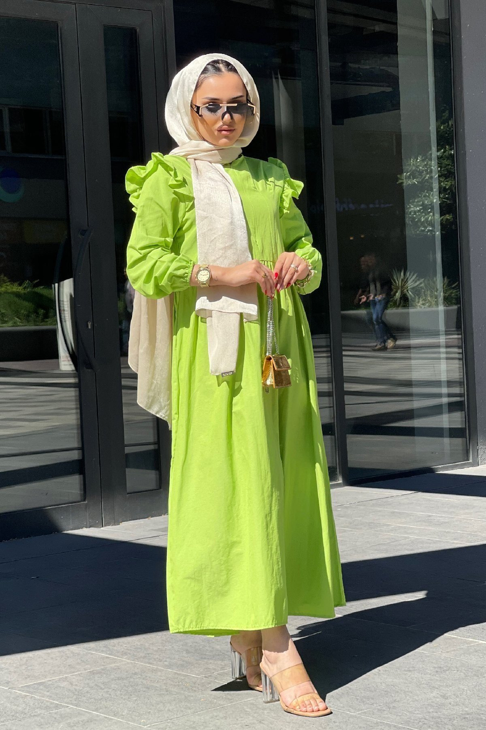 Önü Fermuarlı Kolları Fırfırlı Elbise FıstıkYeşili