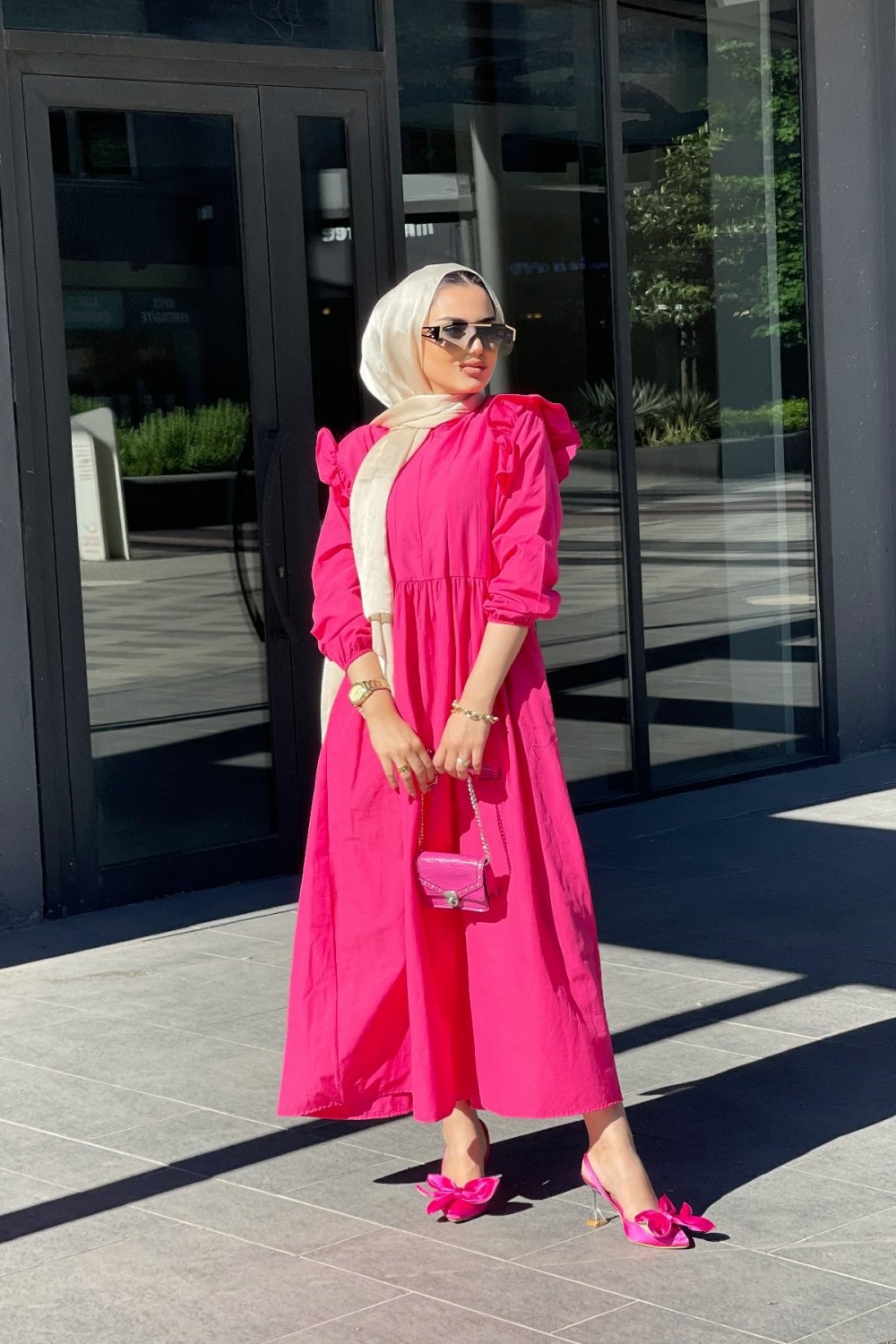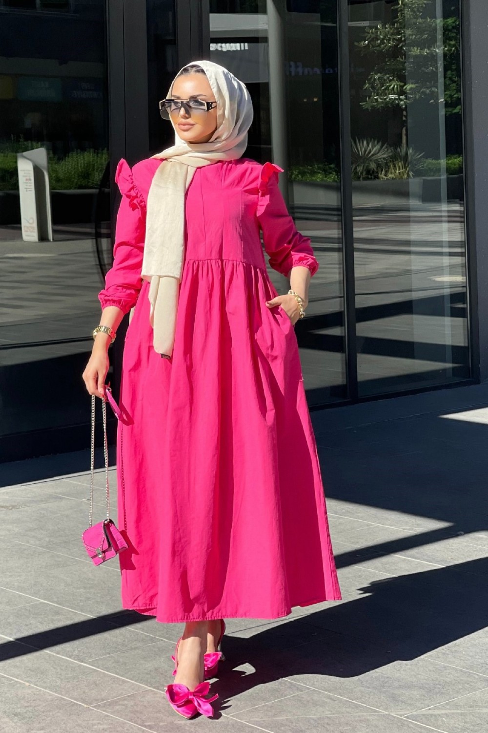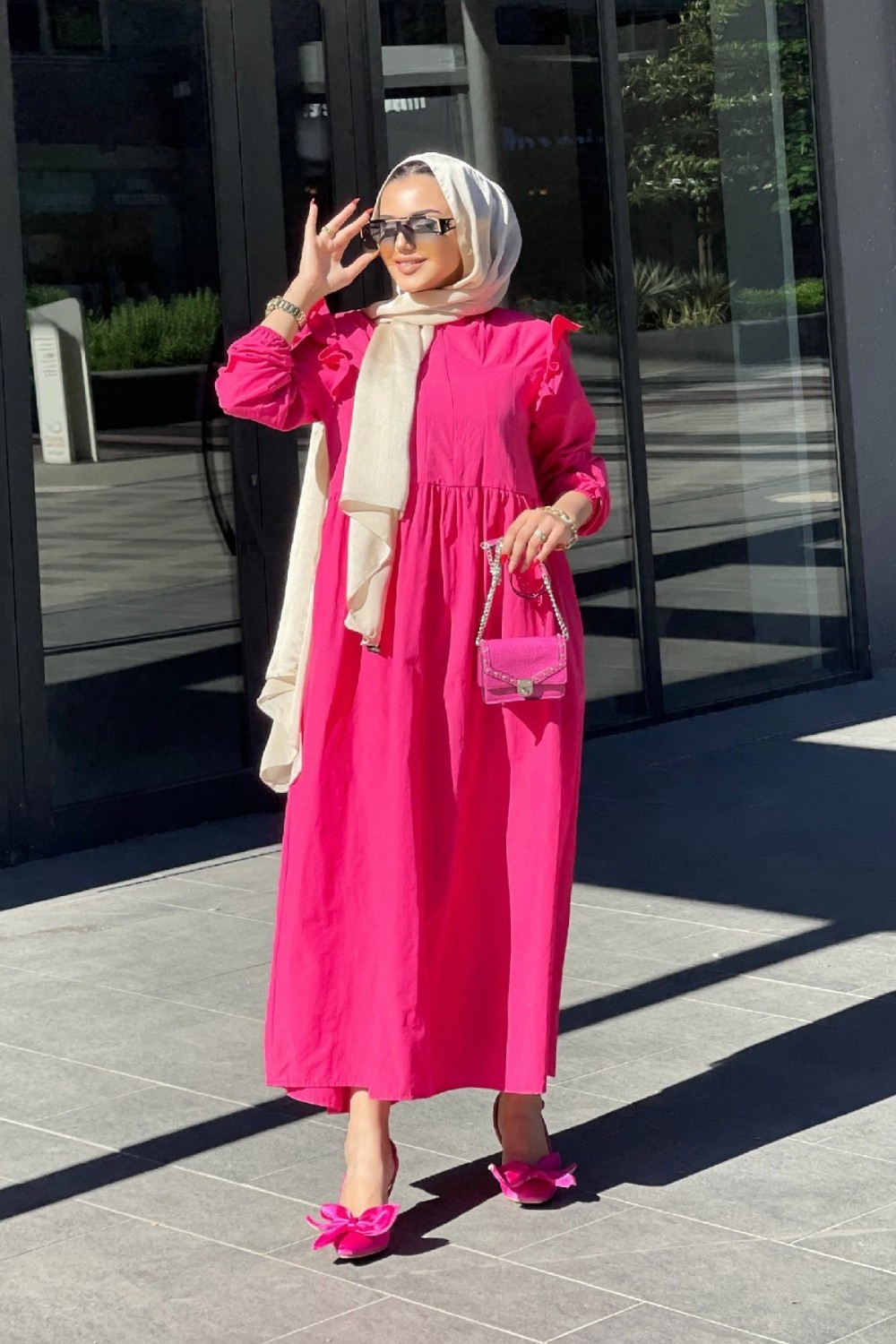 Önü Fermuarlı Kolları Fırfırlı Elbise Pembe