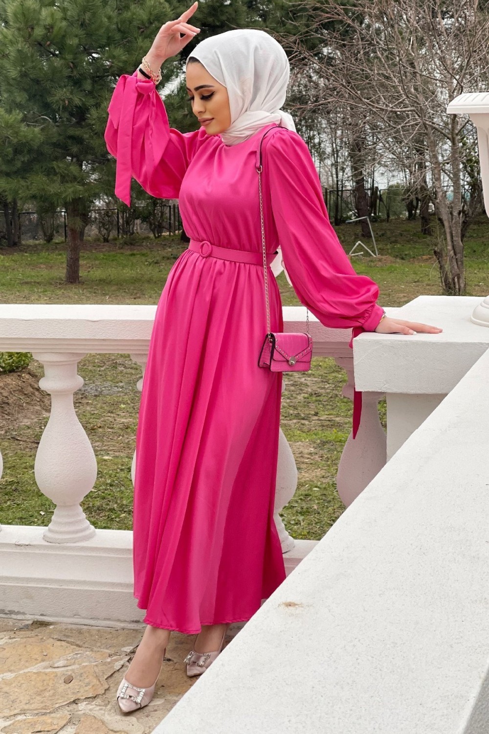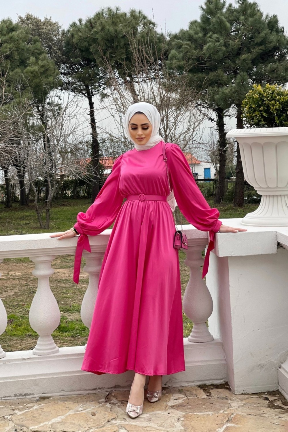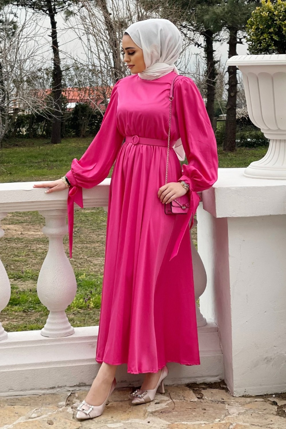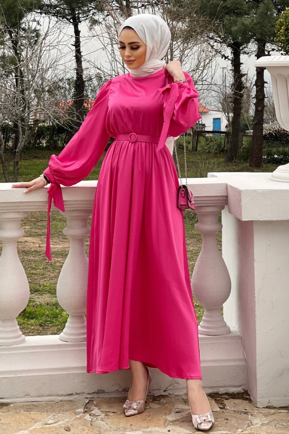 Balon Kol Kemerli Saten Elbise Fuşya
