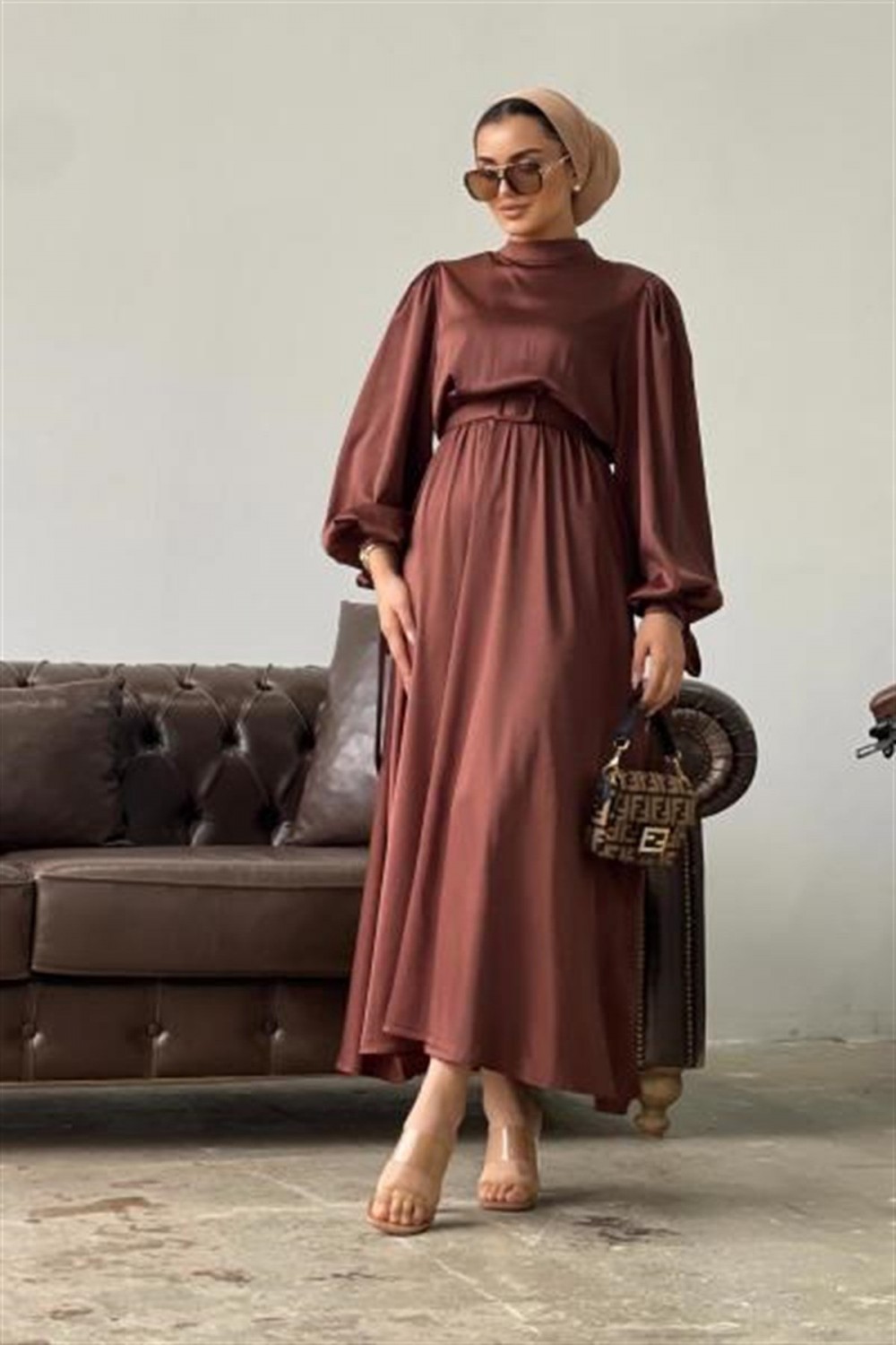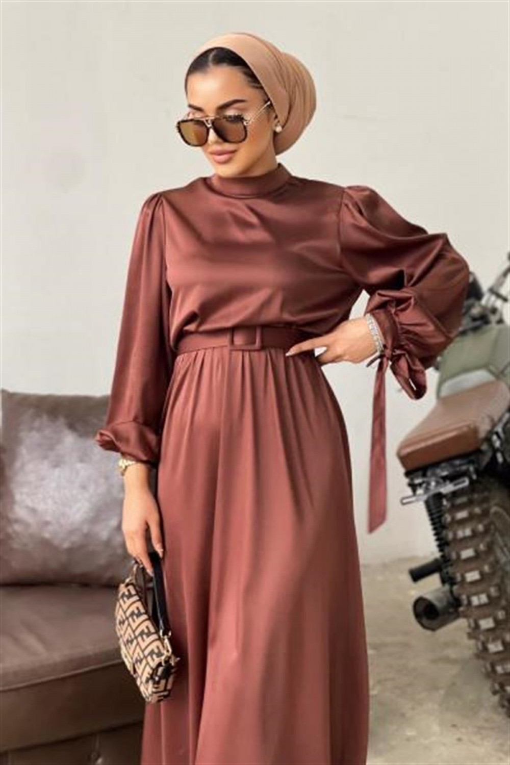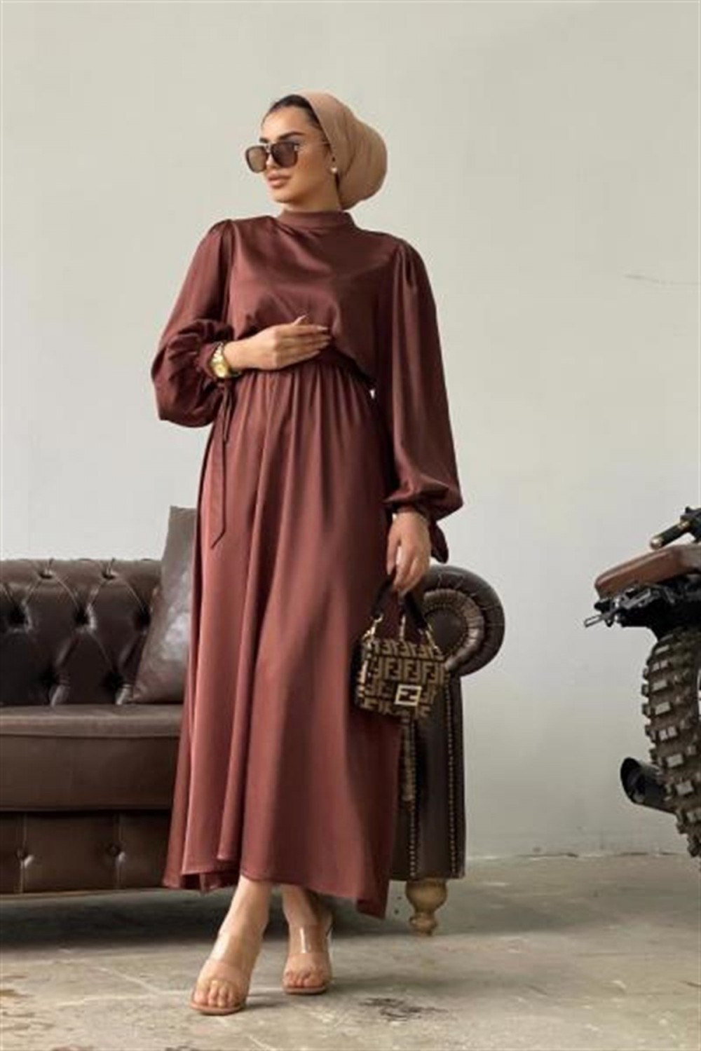 Balon Kol Kemerli Saten Elbise Kahverengi
