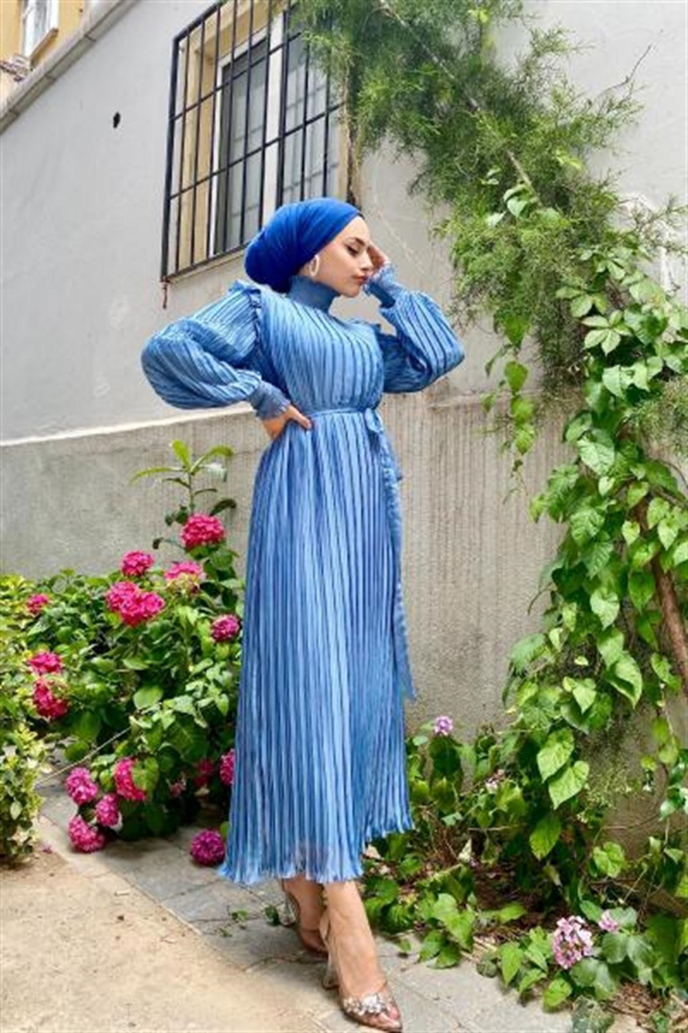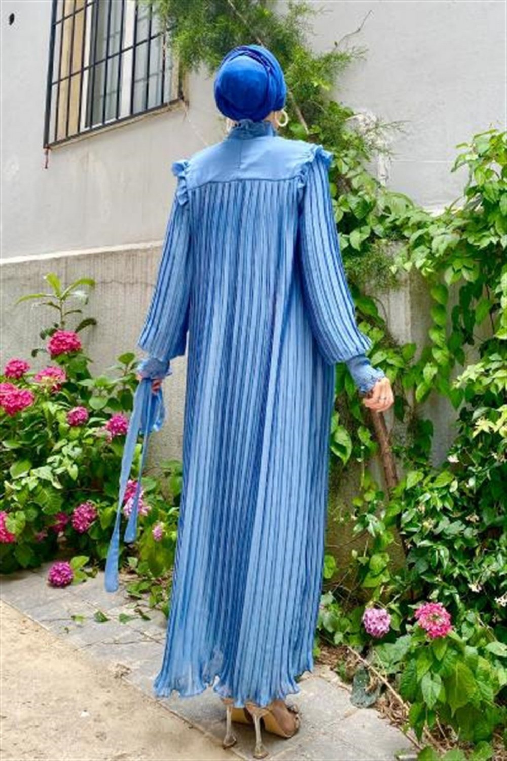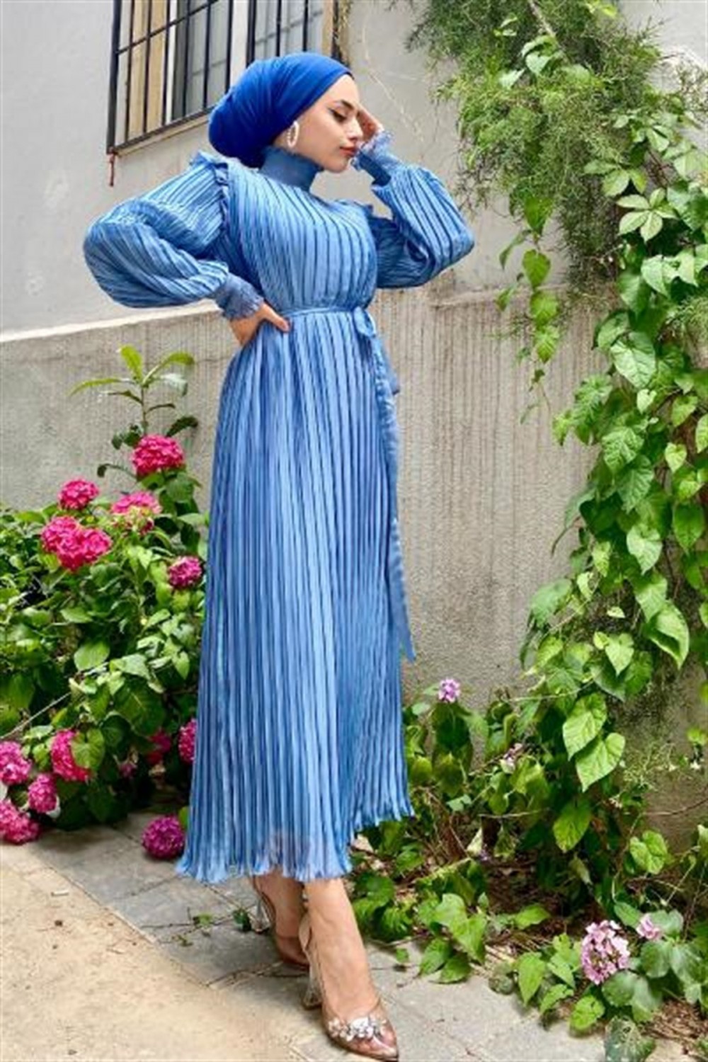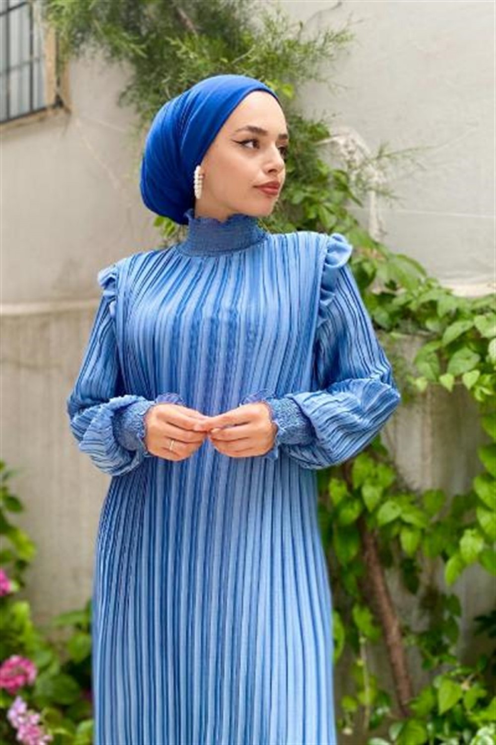 Piliseli Şifon Elbise Mavi