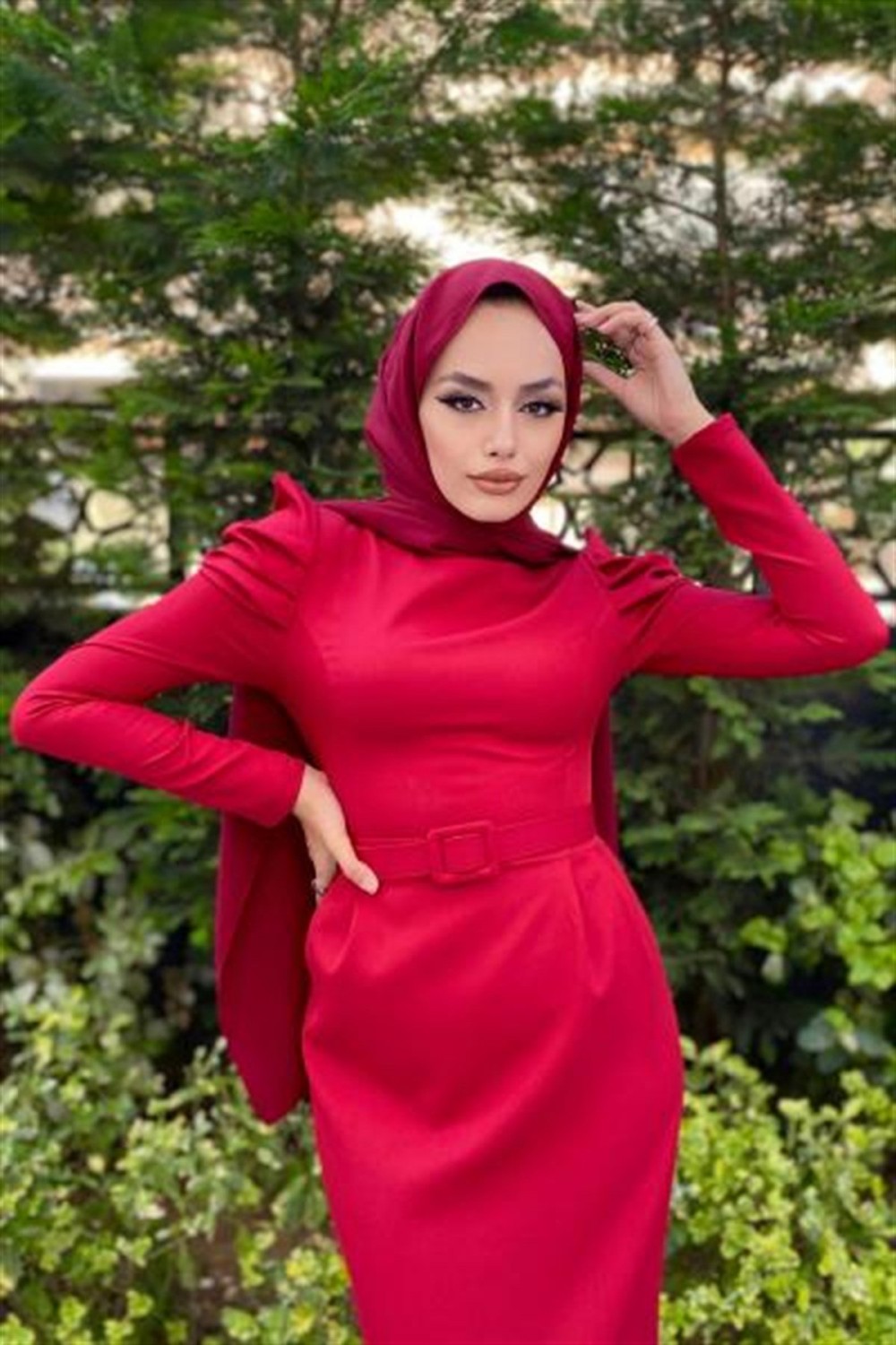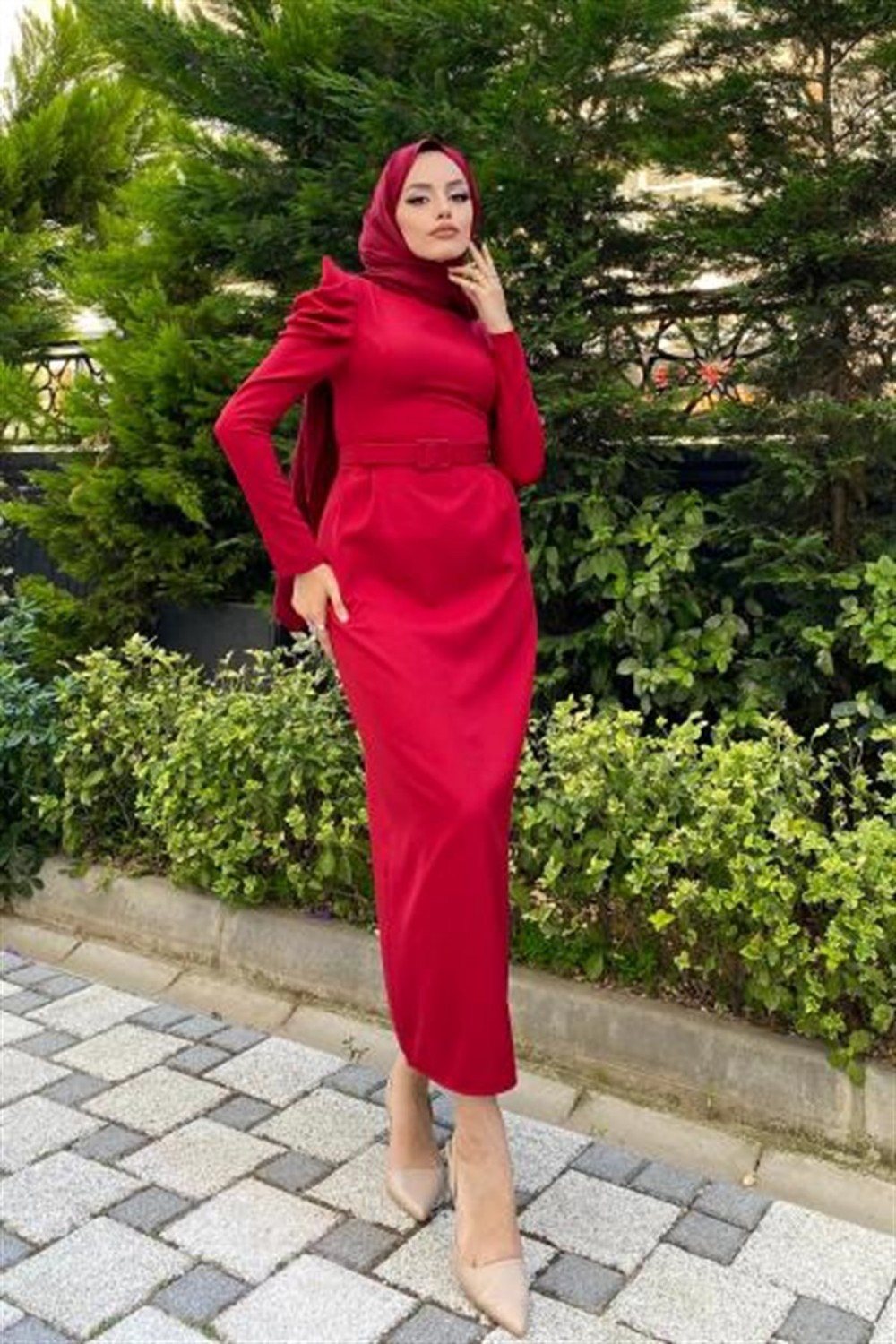 Kolu Detaylı Kemerli Elbise Bordo