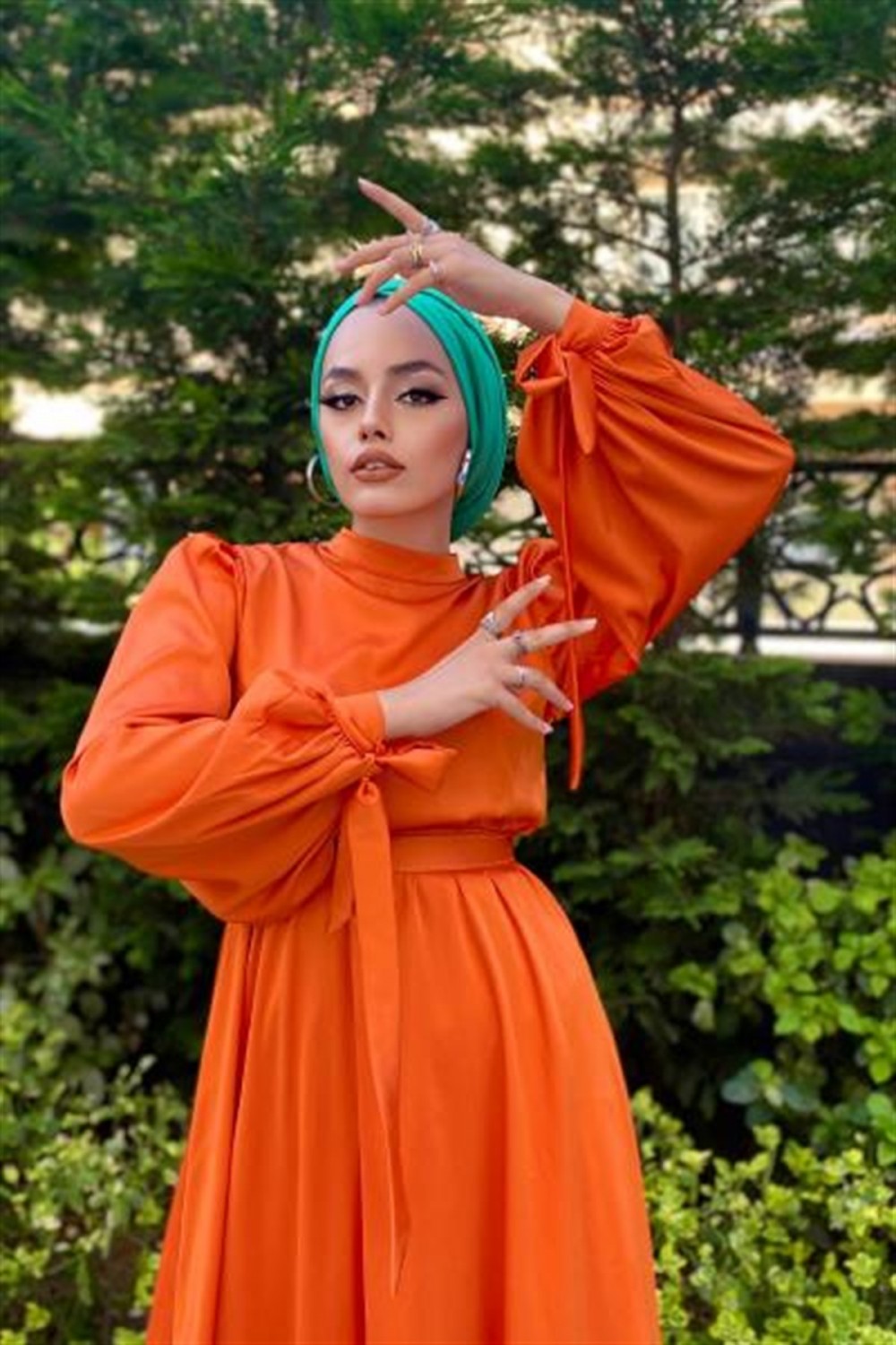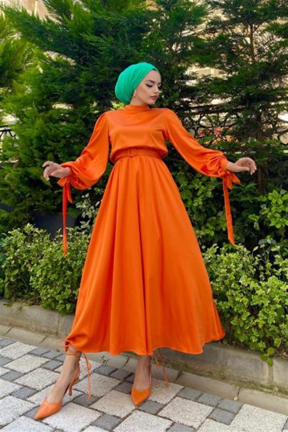 Balon Kol Kemerli Saten Elbise Turuncu