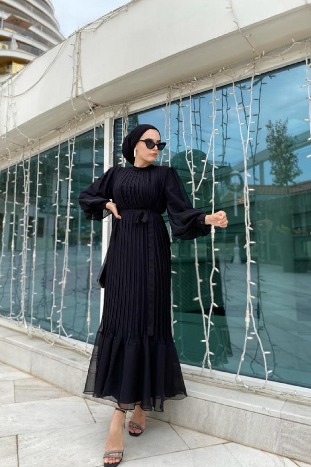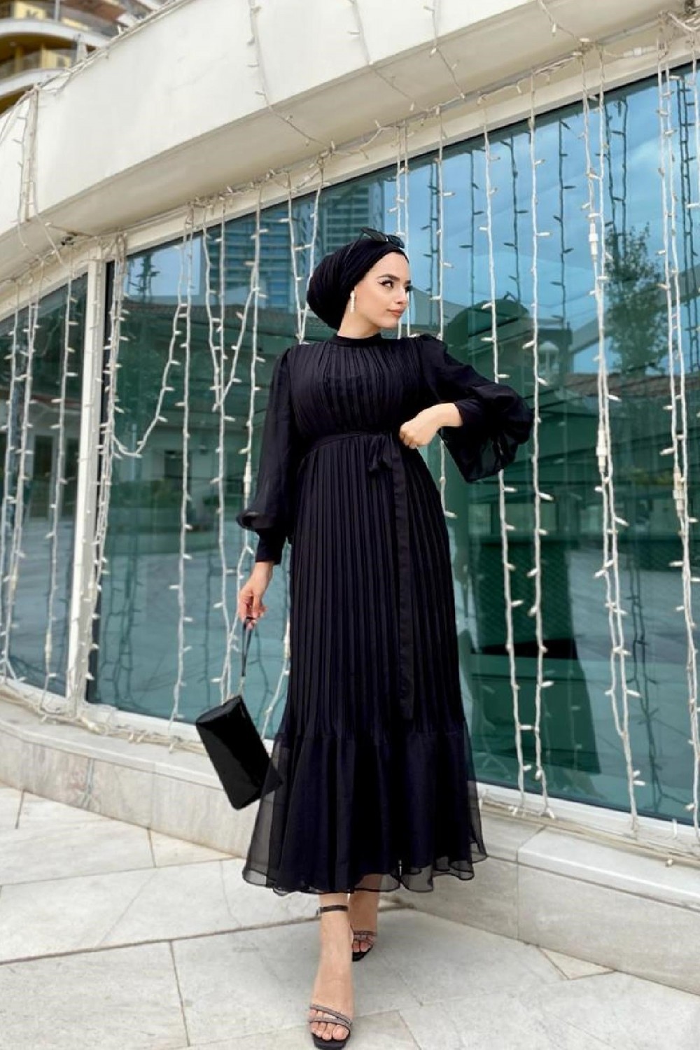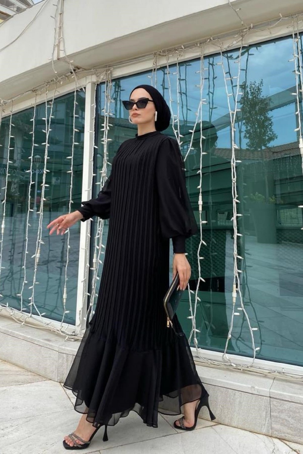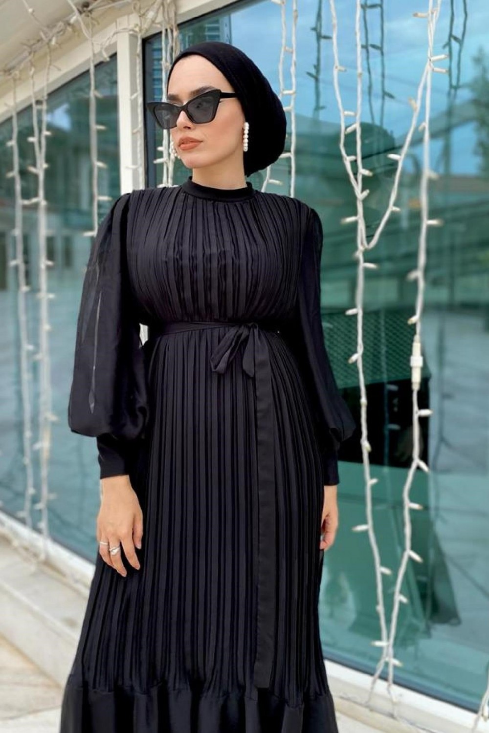 Sık Pileli Balon Kol Elbise Siyah