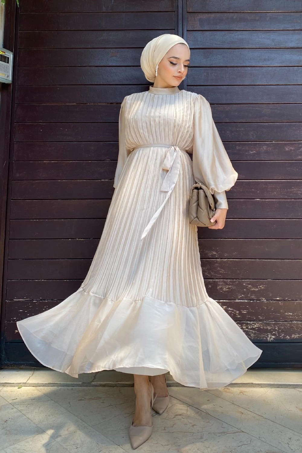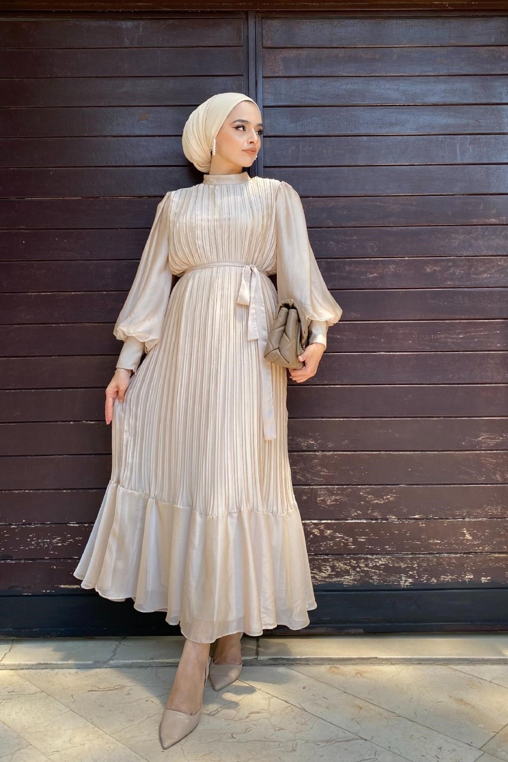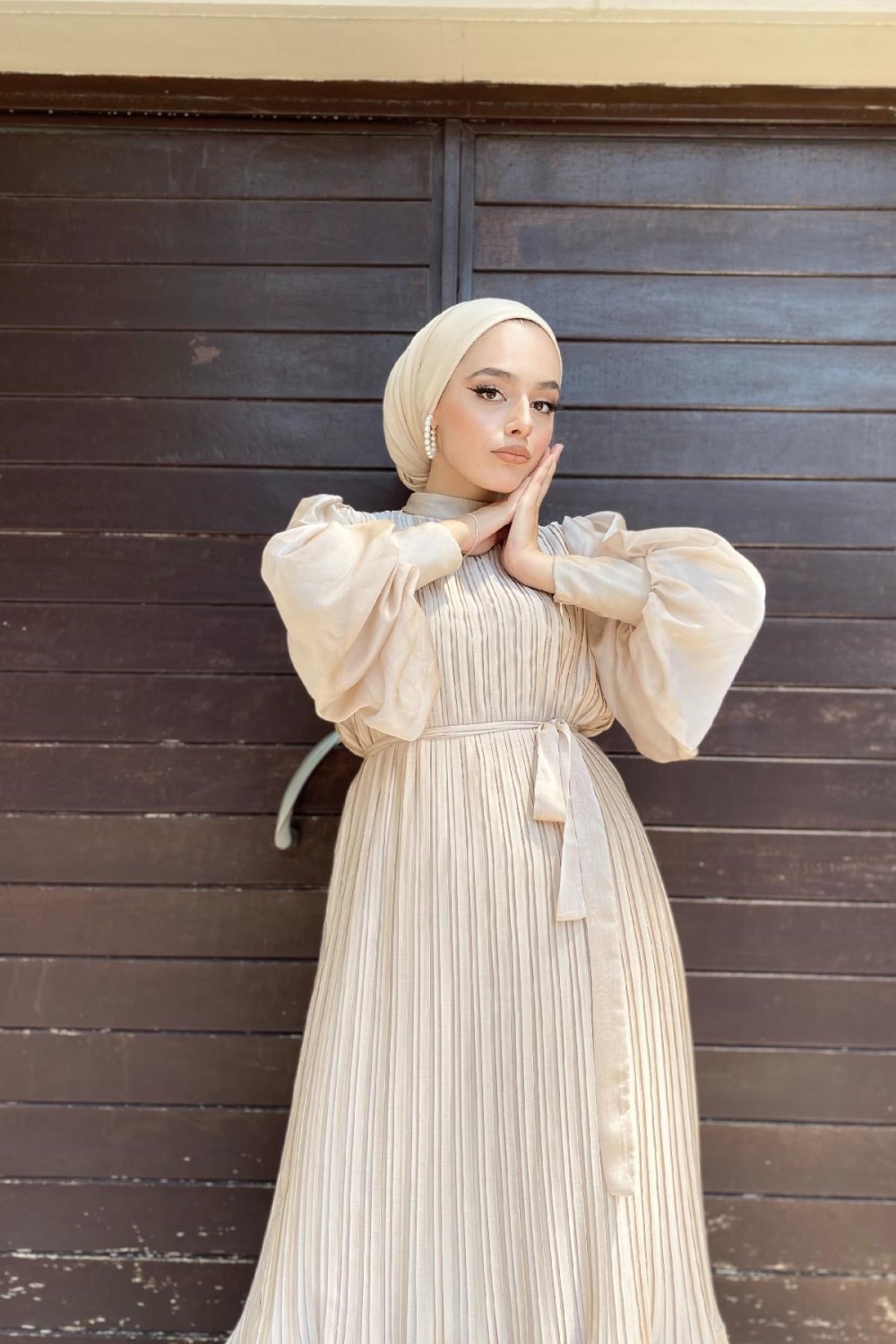 Sık Pileli Balon Kol Elbise Bej