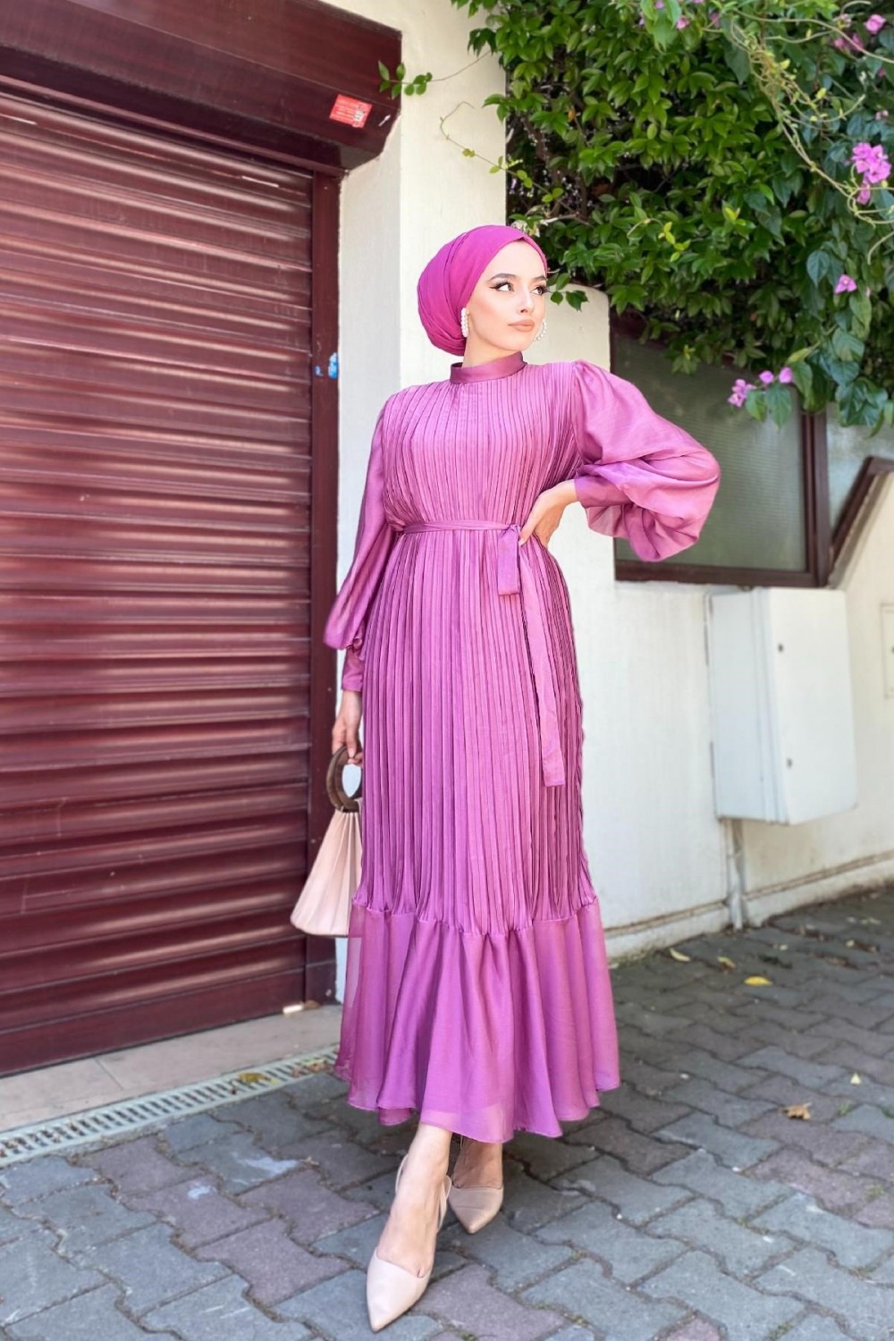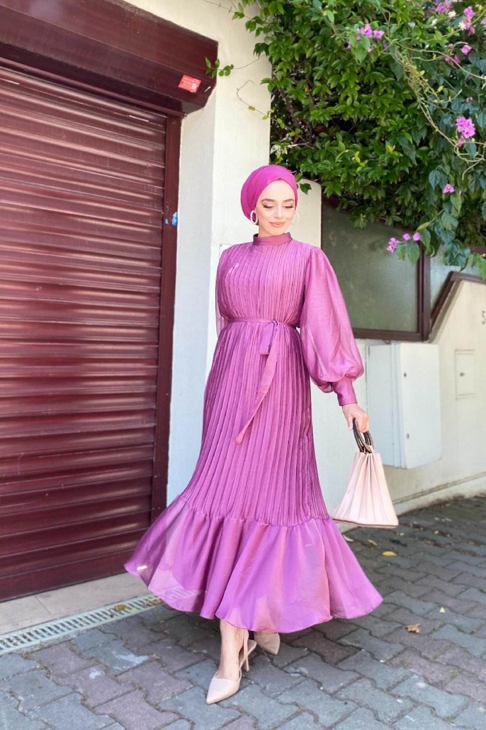 Sık Pileli Balon Kol Elbise Pembe