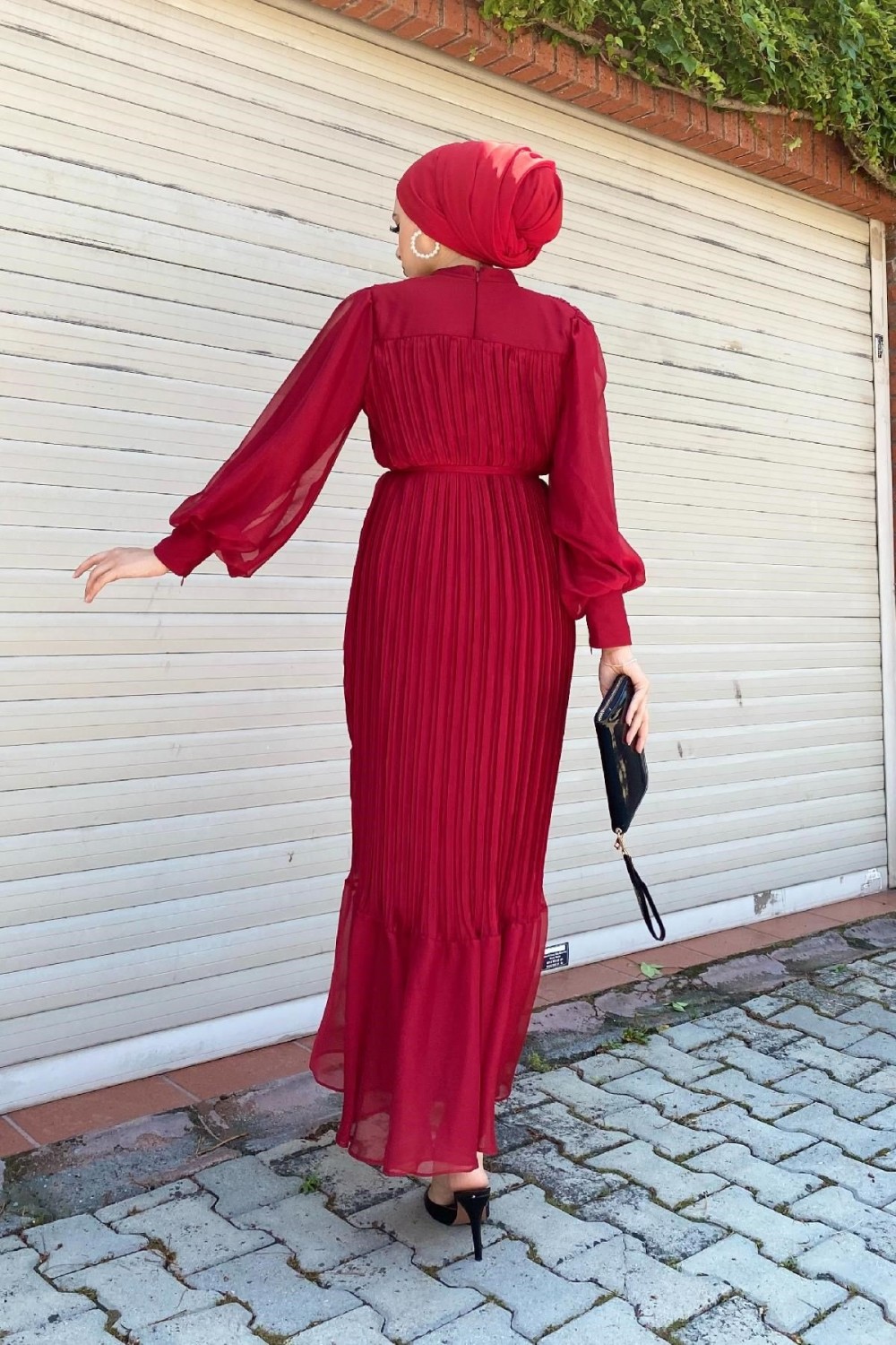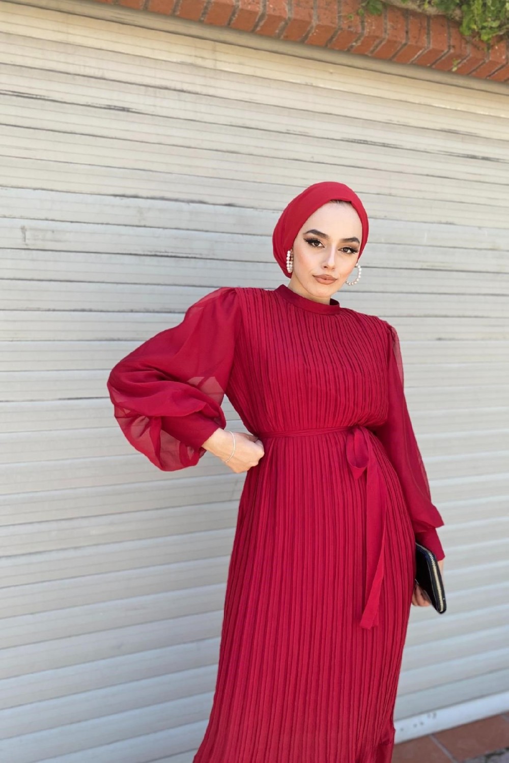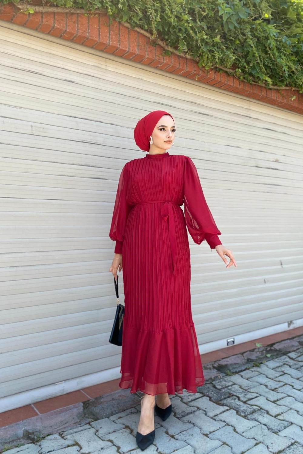 Sık Pileli Balon Kol Elbise Bordo