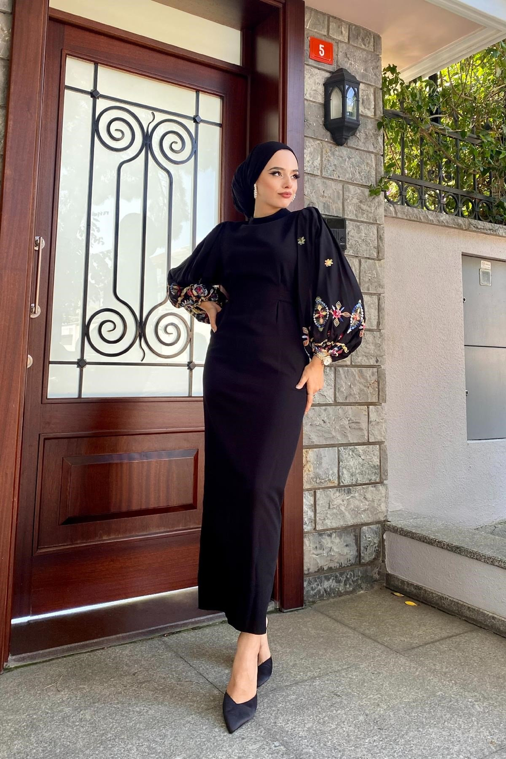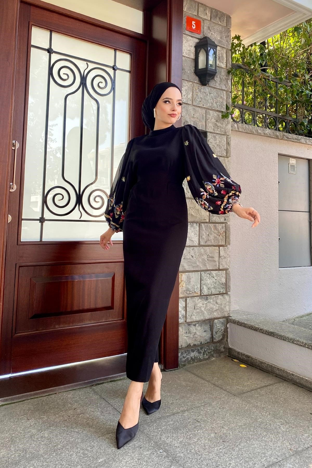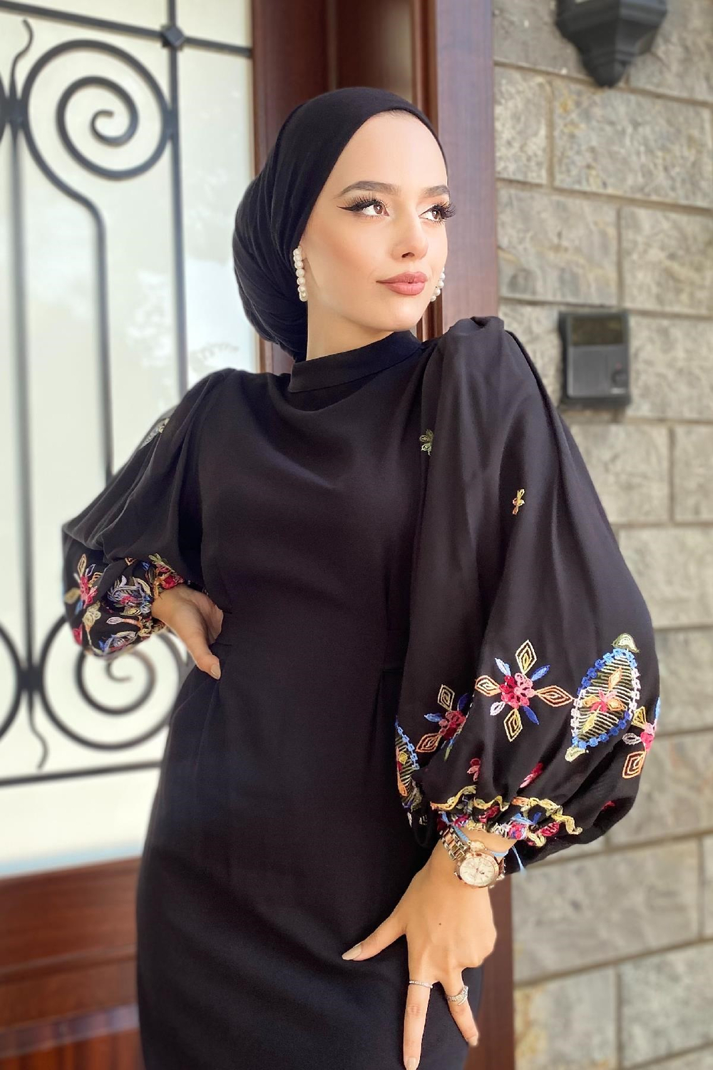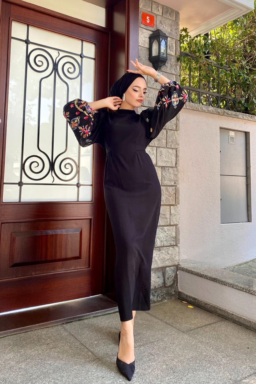 Kolu İşlemeli Balon Kol Elbise Siyah